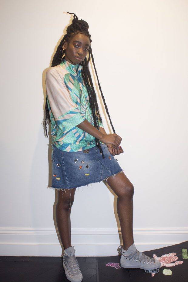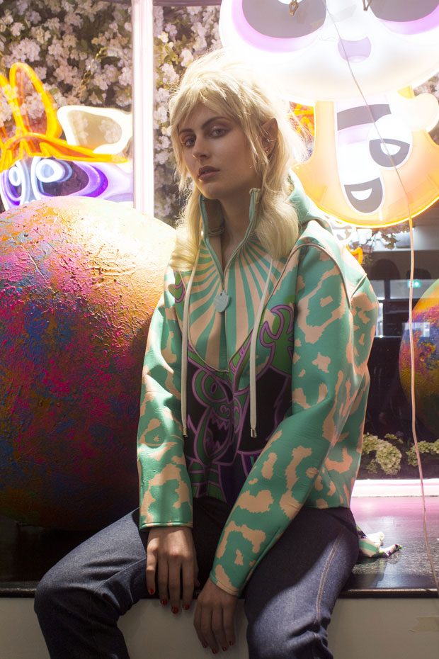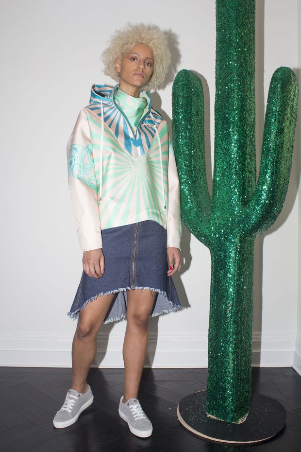 Combining 80’s Skate graphics, 70’s cut and of course the Powerpuff Girls forming Eary’s Version of ‘Space Cowgirl’. ‘Cow Print’ has been replaced with leopard in Mints, eye bleeding reds and flesh tones. Classic cowboy equestrian print has been updated with our new hero’s- The Powerpuff girls, and Mojo JoJo adorn the classic Eary silk shirt. Katie reinvents the ‘cowboy’ through western cut’s and dramatic tiered denim skirts, Jeans with saddle inserts and layered with fringed chaps. Oversized ski hoodies are fabricated in silk bonded neoprene with pirate cowboy hats and 70’s skate cut polo’s. Katie Eary’s AW18 collection takes you on a journey through space; Skating down the ice caps of Pluto to the cloverleaf skate bowls on Mars. – from Katie Eary