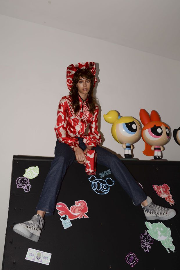 I’m a big fan of The Powerpuff Girls and I was so excited to partner with Cartoon Network for my debut womenswear collection at London Fashion Week. I wanted to take the three superhero sisters with me into a new era of female empowerment. My collection celebrates diversity and breaking down gender stereotypes, so I’ve combined my signature prints with luxe materials to signify boldness and grace. I hope my collection truly inspires a new generation of young women to feel empowered. – Katie Eary