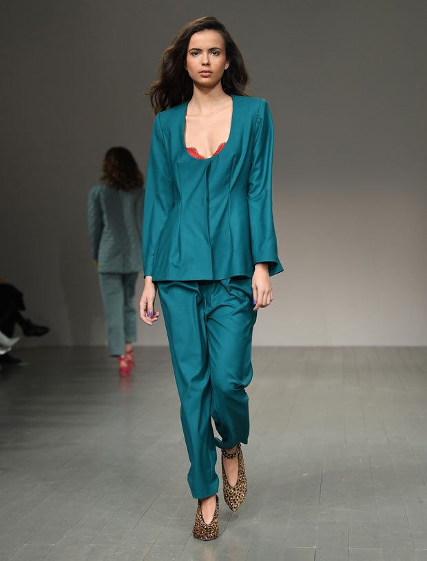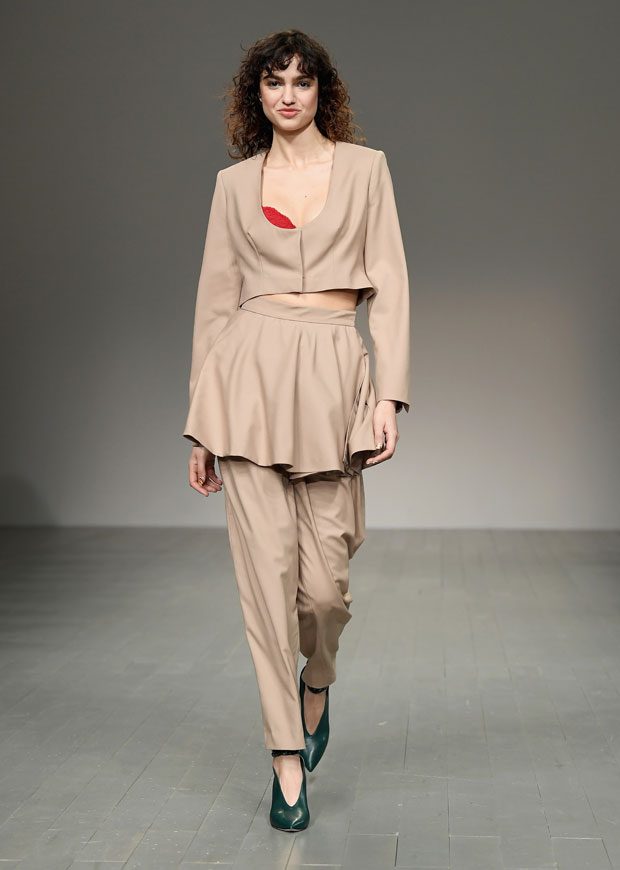 Recall the video for Whitney Houston’s ‘I’m every woman’? Her sassy smile and pregnant belly. For AW18, Marta Jakubowski celebrates women – our versatility, complexity, ambition and physicality – in a collection that evokes the early nineties, the days of shoulders and waists; The Bodyguard, Turlington and Crawford, all through the lense of her layered aesthetic. The collection is both celebratory of womanhood and reflective, paying homage to the sartorial choices of Marta’s late mother – the professional dress, and longline cashmere coat – and her own childhood clothes, loved and long-lost. Marta’s personal trajectory towards womanhood is mirrored in her aesthetic evolution, from the vibrant draped tailoring and cut-out pieces of past seasons, to this season’s adaptable mix & match separates, party dresses and reconstructed trouser suits – a little bit grown-up, a little bit business. Layering techniques embrace the female form, while multiway fastenings offer us choices, and therefore power, and the trouser dominates. – from Marta Jakubowski