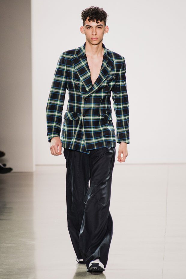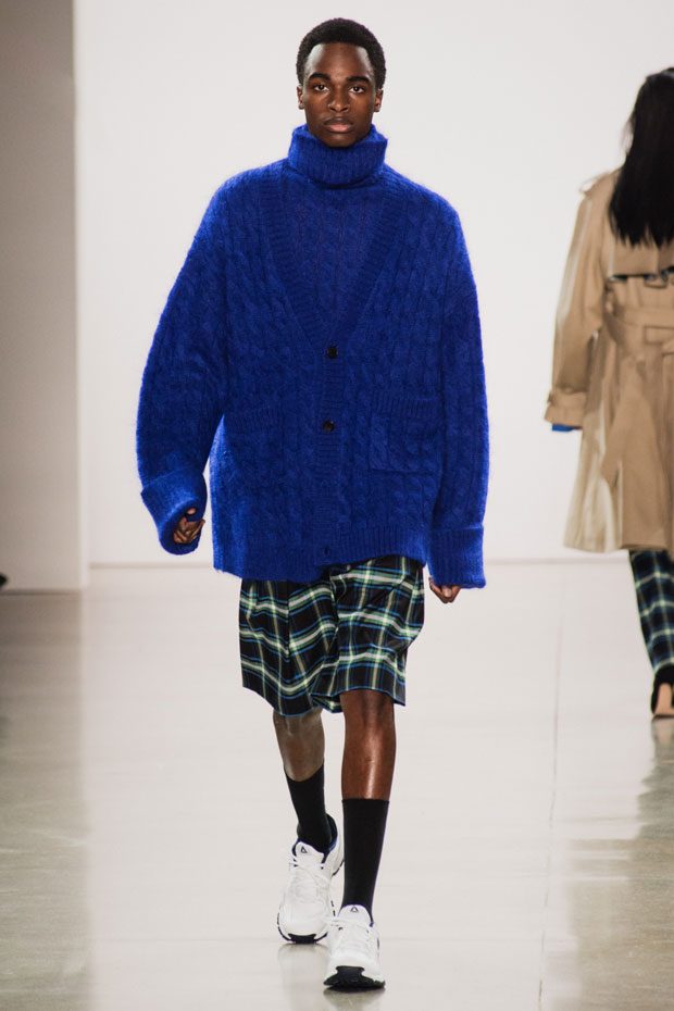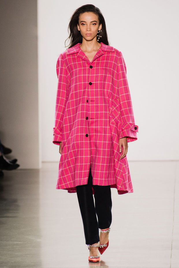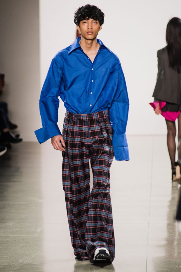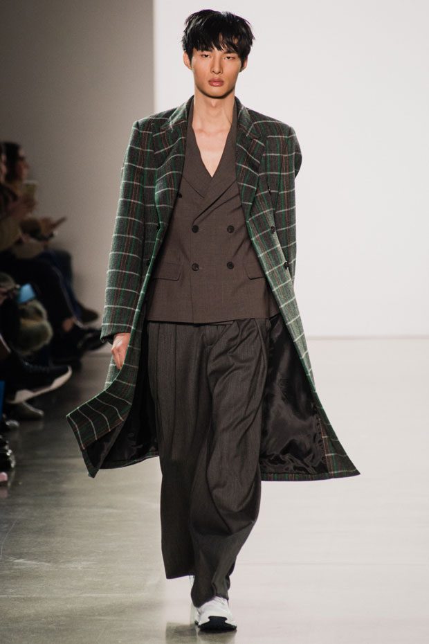 Matthew Adams Dolan presented his Fall Winter 2018/19 collection during the New York Fashion Week. Focused on a on a maturity and a function, the collection features plaid suiting in bright colors, wide-leg jeans, voluminous jackets and coats, as well as the workwear shirts and robust shoes.