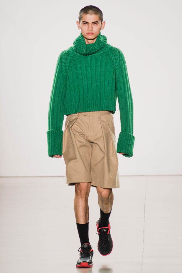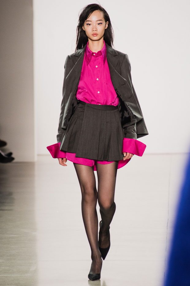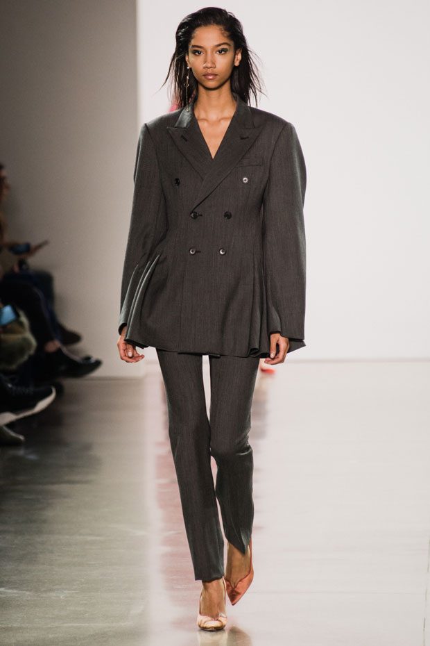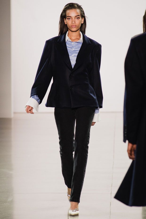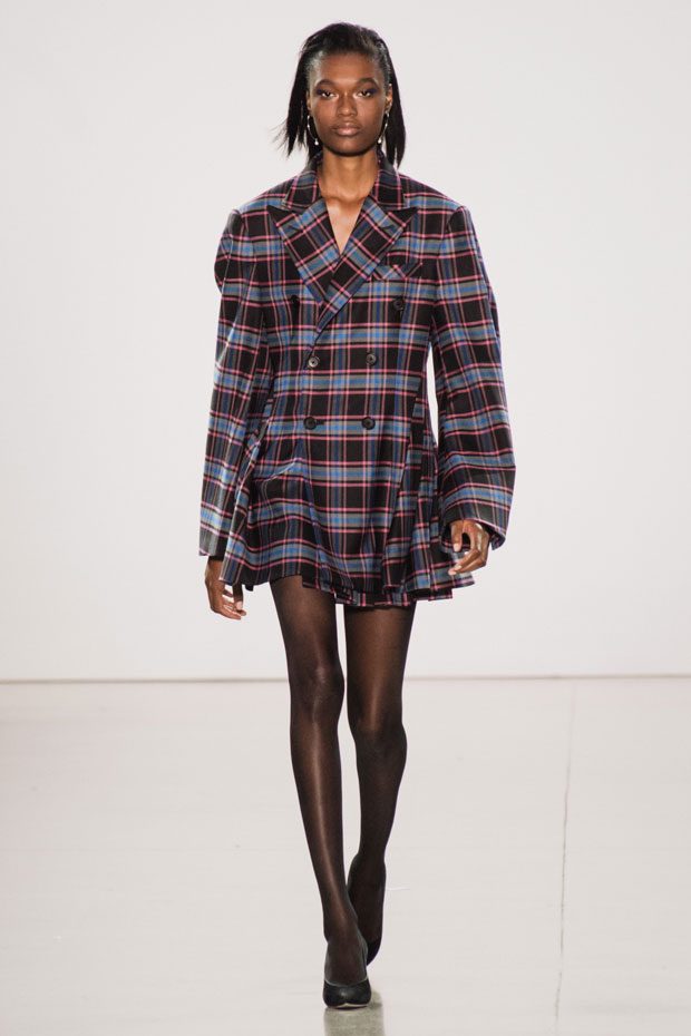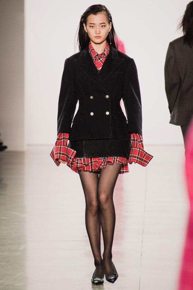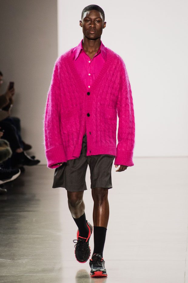 For Autumn/Winter 2018, Dolan’s fascination with the shifting paradigms of Americana endured. Sportswear the starting point, the collection is a cohesive and precise convergence of ideas that have sat within in Dolan’s psyche over the last six months. 80s Lo-Life culture, bold 90s activewear ads paired with Jackie Kennedy’s reminiscing of her late husband all help reinforce the lasting impression of timeless style – that an idea or image has the ability to linger in the memory for a lifetime. While Spring/Summer 2018 was an exploration of youthfulness, Autumn/Winter creatively explores identity post-collegiate and pre-adulthood, and with it, the collection takes on a maturity and a function. Plaid suiting punches in shocking pink and bright yellow; french cuff shirts in blue and powder pink are centerpieces and Dolan’s signature jeans comes both in a straight and wider leg. Volume is toyed with on the sleeves of denim jackets and in the shape of gray wool overcoats. On the feet, robust walking shoes are a solution for day and satin heels the choice for night. Traditional American workwear shirts are updated with pleats that fall from the hips and blazers in muted chalk stripe offer a purposeful and attainable elegance, without ever leaving its connection to streetwear – creating a holistic vision of casual and utilitarian American dressing. – from Matthew Adams Dolan
