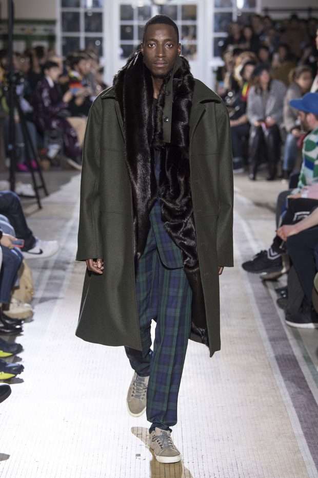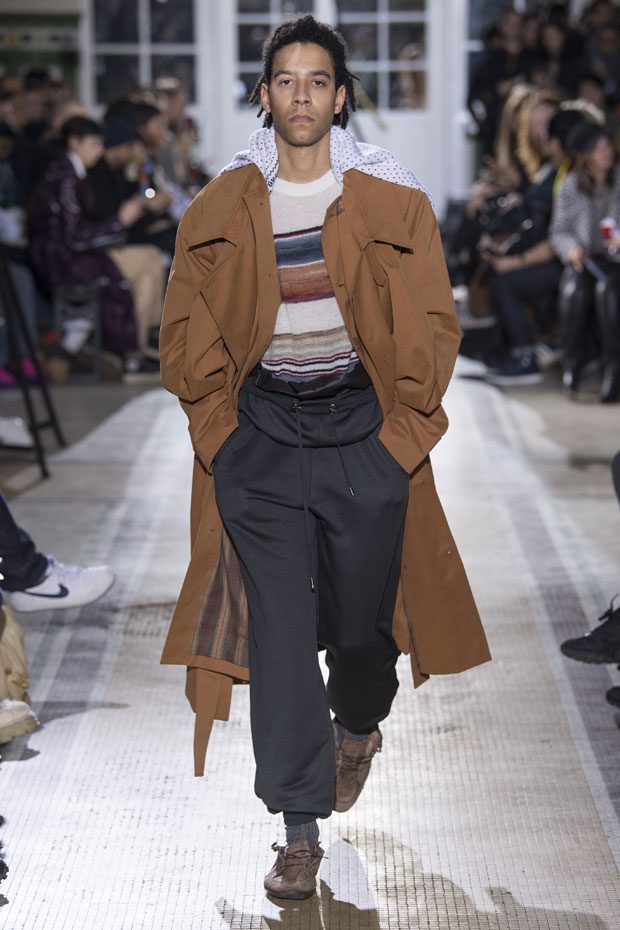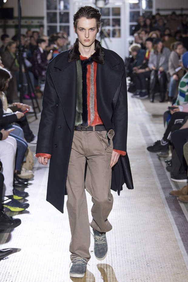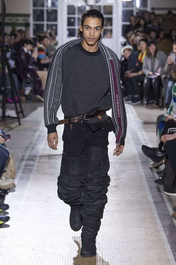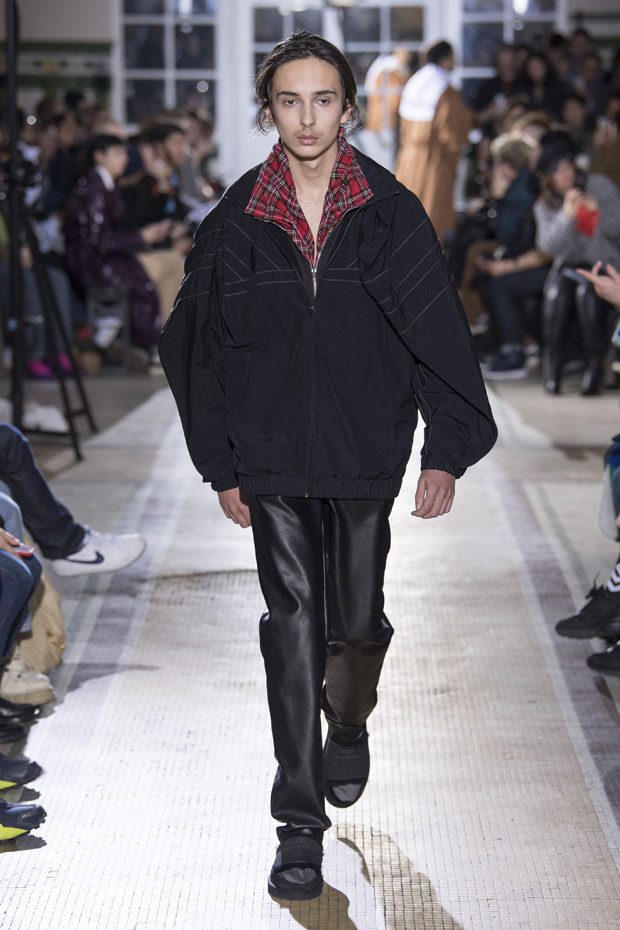 For the Y/PROJECT HOMME AW18 collection, designer Glenn Martens continues his play on versatility and wearability. Pieces are designed putting an emphasis on styling possibilities, as a celebration of people and individuality. Mixing sportswear and tailoring, jersey and knitwear, and flannel with colorful fake fur, the AW18 collection works as an eclectic ensemble of garments, appealing to different crowds. The collection carries over signature styles like the cuff jeans, double jackets and shirts, loose high-waisted track pants, pushed further introducing new fabrics which are reworked in overstated ways. Double-panel blazers are worked into jeans and coats, pleated shoulders are exaggerated into scarves and large hoods on the sweaters, fake fur cuff jeans. – from Y/Project