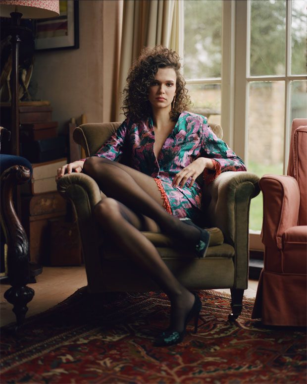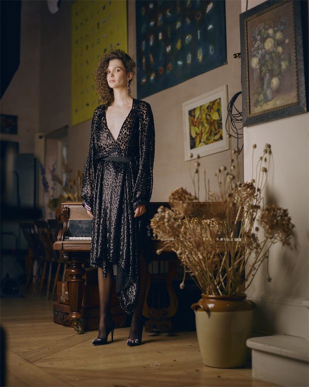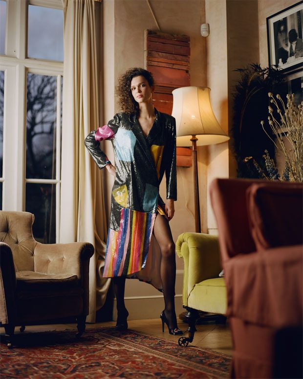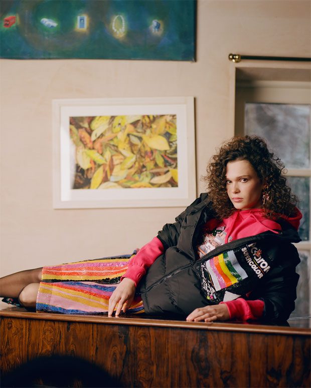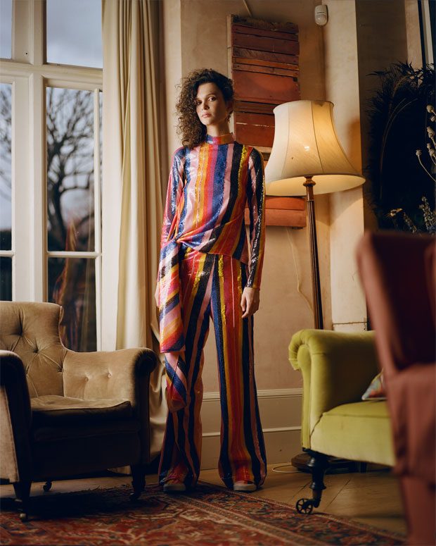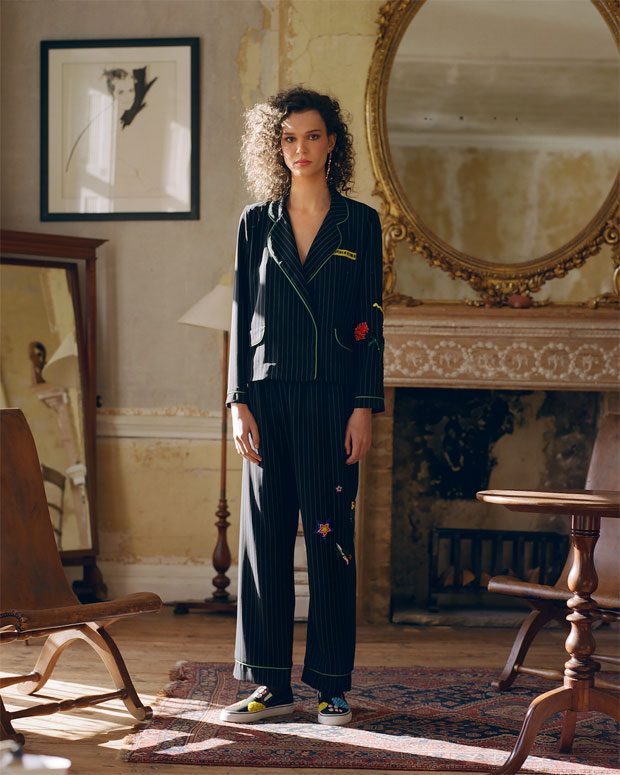 The maximalist luxury ready-to-wear designer finds her inspiration in the life of the woman she saw as coming through at the time, stepping into her life for 24 hours and traversing her wardrobe: from from a puffer jacket to go and grab the milk in, to bright shiny Swarovski crystals and sequins – always a Roberta Einer favourite – to easy pyjama styles, pinstripes, power dressing and party dresses. Chunky knits of thick yarn make for mum-and-dad sweaters with a naïve charm; while hoodies, T-shirts and bombers feature retro graphics taken from her own family photo album of the time: Einer’s mother and father posing in holiday snaps make for sweet motifs which, personal to the designer, also possess a relatable memory-lane quality. There also come her recurring signatures, the bomber jacket – now boasting computer-graphic ornamentation for patchwork detail – and sequins. Here rendered in flashy flourishes for floral clusters on pinstripe dresses that make for a throwback to the office-wear trope of the time. Three standout silhouettes underpin the season: Roberta Einer takes on the power suit with shapely skirts and new ostentation; draped party dresses bunch and gather at the hip and come in sassy-shimmery shades; and there are asymmetric flared and textured dresses, their cable knit running out across the body at different directions in a flattering contour. Colours throughout are high-shine, bold and bright, Eighties-centric with Bridget Riley monochrome to be found too. – from Roberta Einer
