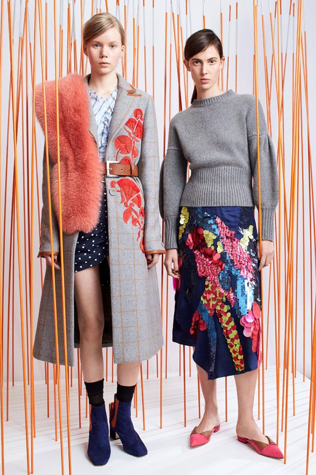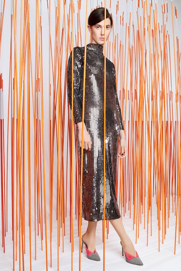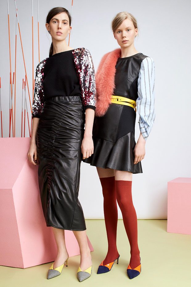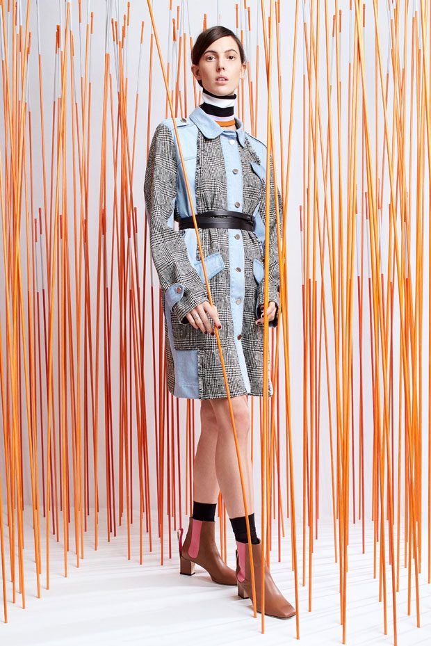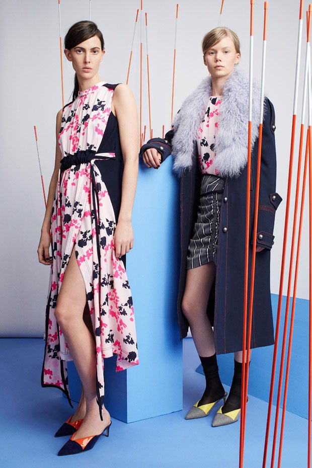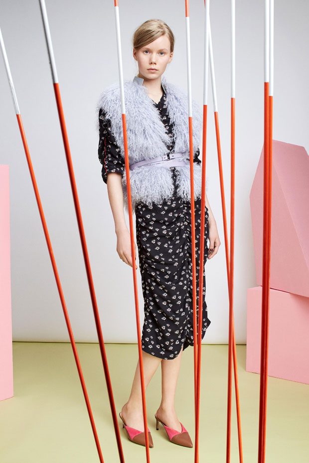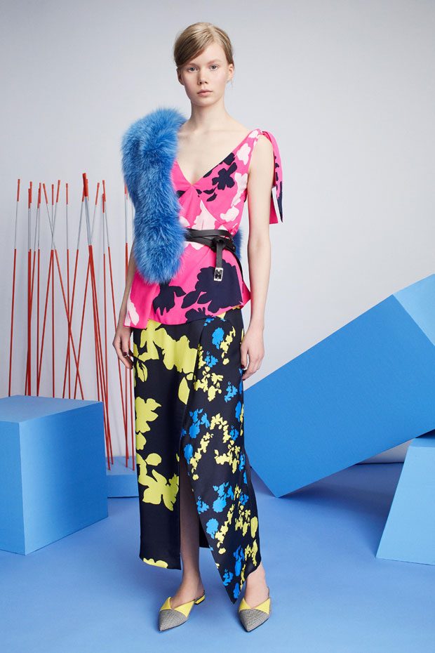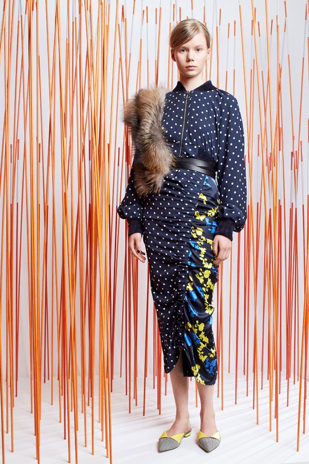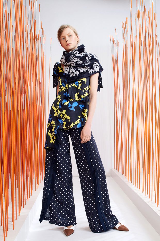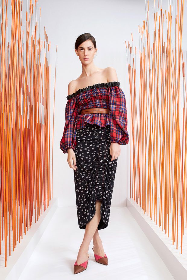 Inspired by the women of the Dada art movement, Suzanne Duchamp and Hannah Hoch. In the 1920s and 1930s they communicated themes of liberation and empowerment through photomontage and painting. The collection establishes feminine in a new language. Unfussy, tailored and spontaneous. Silhouettes are slim in the hip, sleeves are unstructured and rounded, lengths are abbreviated and proportions are refreshed. Waists are softened and ruched. She is dressing with strength and sharpness. Wool plaids, textured houndstooths, menswear suiting and featherweight calfskin bring depth and layers. There is a spontaneity to mixing. Polka dots interrupt blank colorblocked florals, and classic plaids are paired with dark ditzy flower buds. Prints focus on an element of surprise. Florals feel like modern camouflage telling a story of electric pink, deep navy and sheer nudes with pops of lemon and orange. She is dressed in a stream of consciousness, unabashedly free. She is a fearless challenger of female identity. – from Tanya Taylor