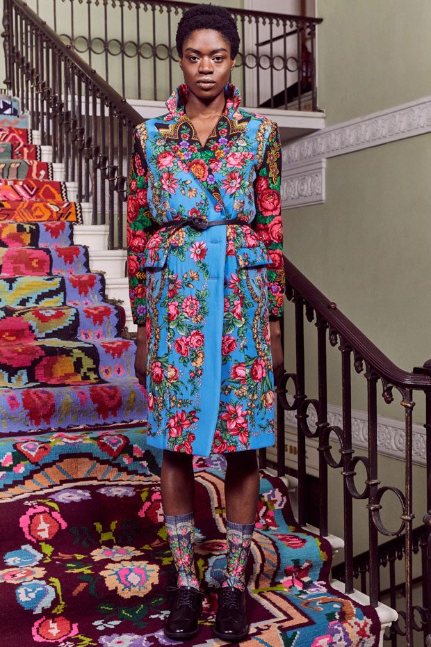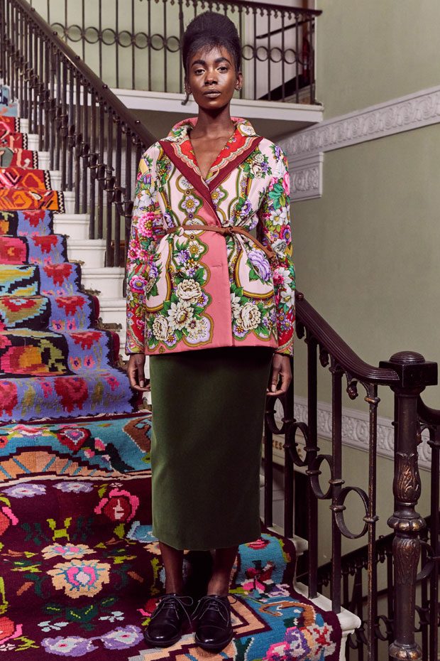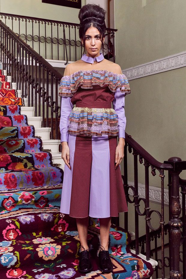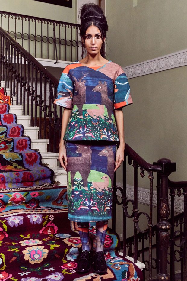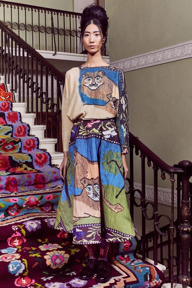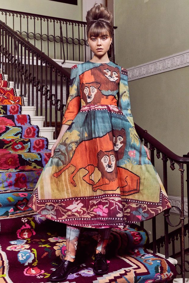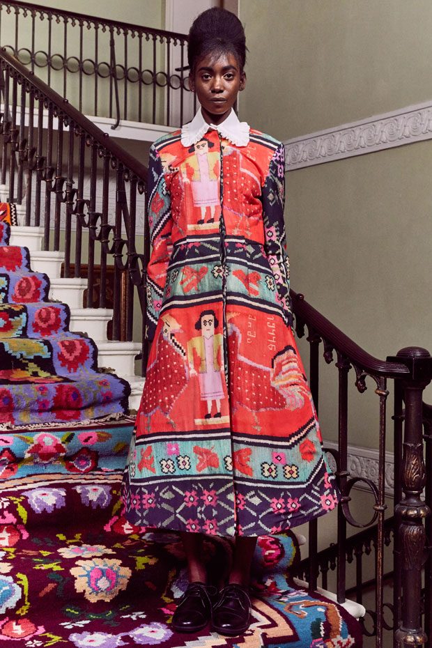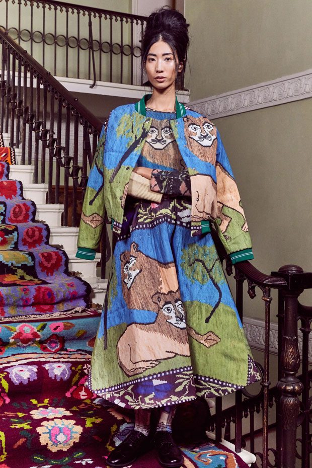 This eclectic collection features references to the famous floral Russian shawls of Pavlovo Pasad, dating back to the 1800s, as well as the accordion pleated sleeves of traditional dance costumes of Szek. Motifs typically from Georgian Kilims of the 1920s and 1930s are also seen running through the collection in the form of figurative prints portraying the images of traditional Red Army officers on horseback, two lions or deer. Russian shawls are used as an interpretation of the term ‘flowers on your shoulders’, and padded features can be seen on classic double-breasted coats, jackets and bombers, giving the collection a modern twist. The PRE FALL collection features polka dot cotton pieces mixed with tulle frills and decorated with multiple trims as well as shapes taking inspiration from traditional Colombian and Seminole costumes. The inspiration around 1920’s Georgian literature is very visible within the AW18 collection, the image of two animals represents love and two animals with a life tree in the middle is the symbol of happiness. – from Tata Naka