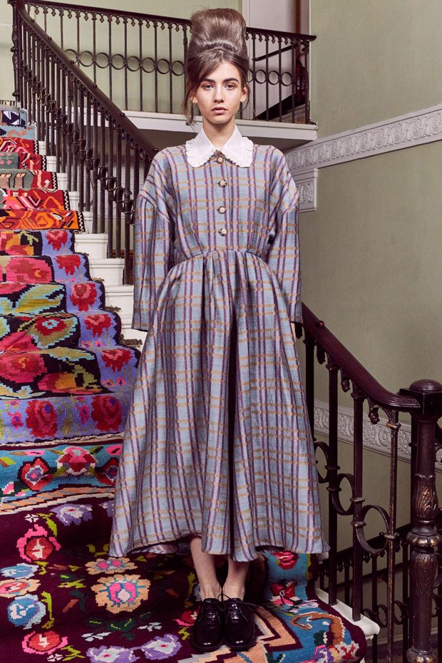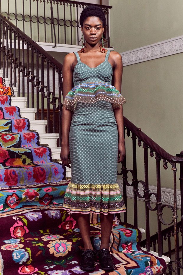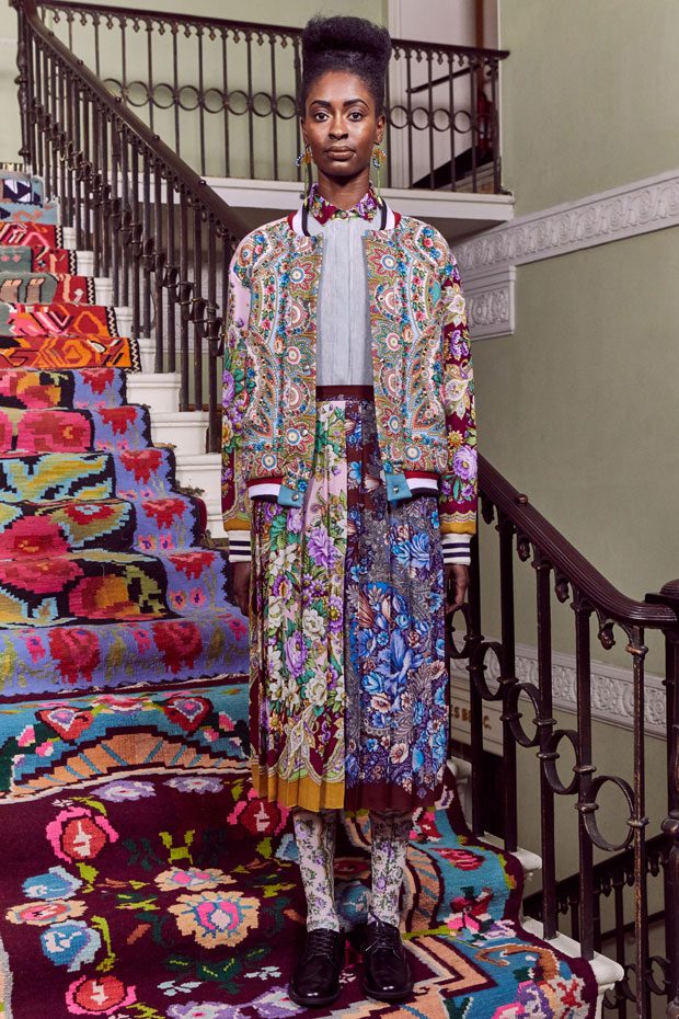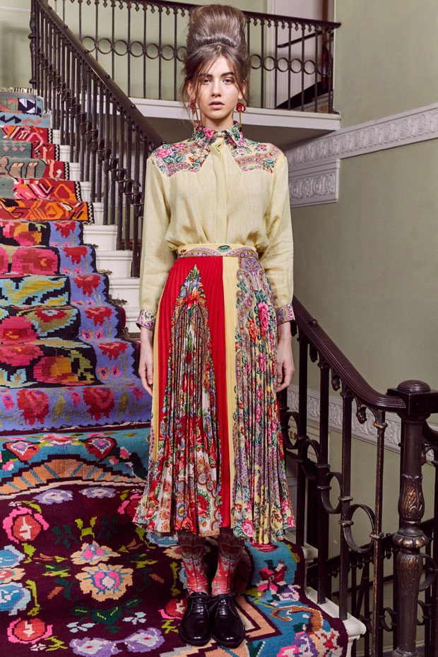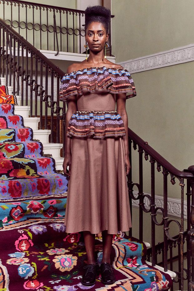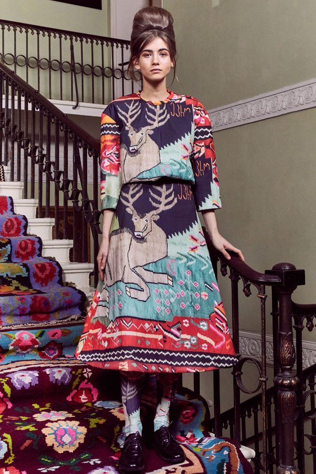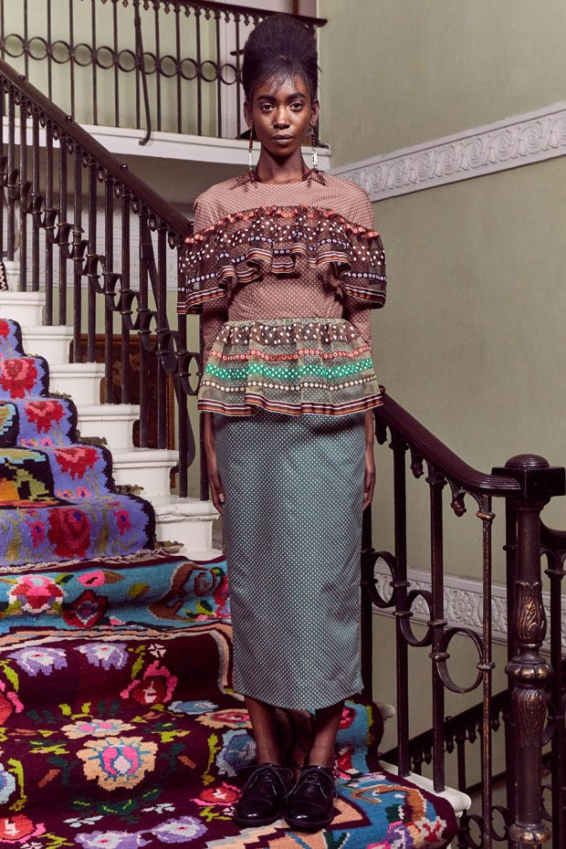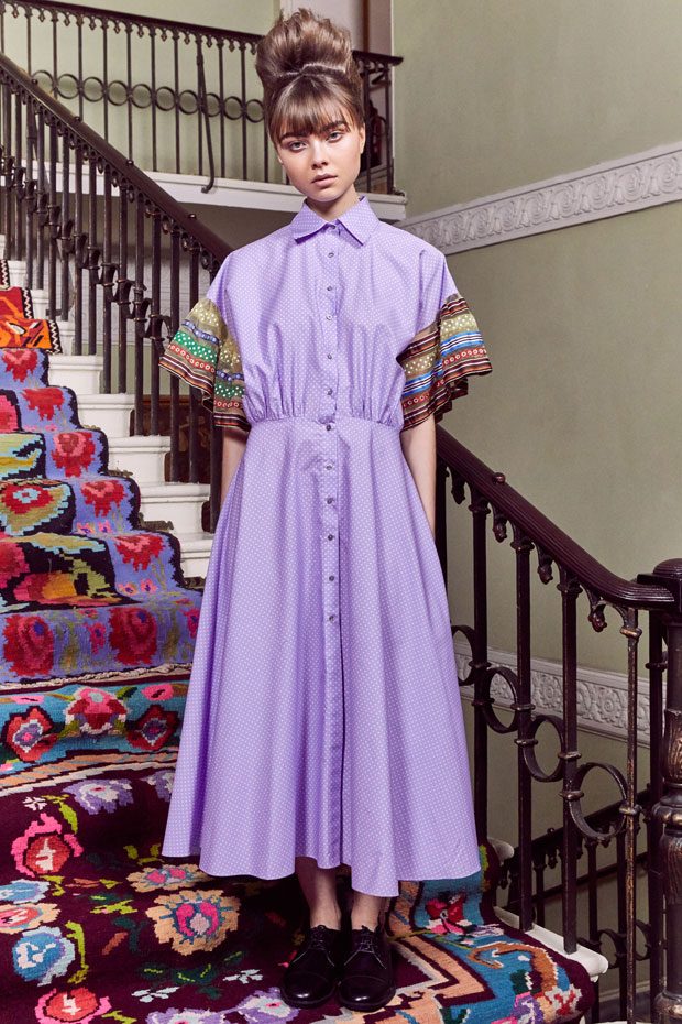 This eclectic collection features references to the famous floral Russian shawls of Pavlovo Pasad, dating back to the 1800s, as well as the accordion pleated sleeves of traditional dance costumes of Szek. Motifs typically from Georgian Kilims of the 1920s and 1930s are also seen running through the collection in the form of figurative prints portraying the images of traditional Red Army officers on horseback, two lions or deer. Russian shawls are used as an interpretation of the term ‘flowers on your shoulders’, and padded features can be seen on classic double-breasted coats, jackets and bombers, giving the collection a modern twist. The PRE FALL collection features polka dot cotton pieces mixed with tulle frills and decorated with multiple trims as well as shapes taking inspiration from traditional Colombian and Seminole costumes. The inspiration around 1920’s Georgian literature is very visible within the AW18 collection, the image of two animals represents love and two animals with a life tree in the middle is the symbol of happiness. – from Tata Naka