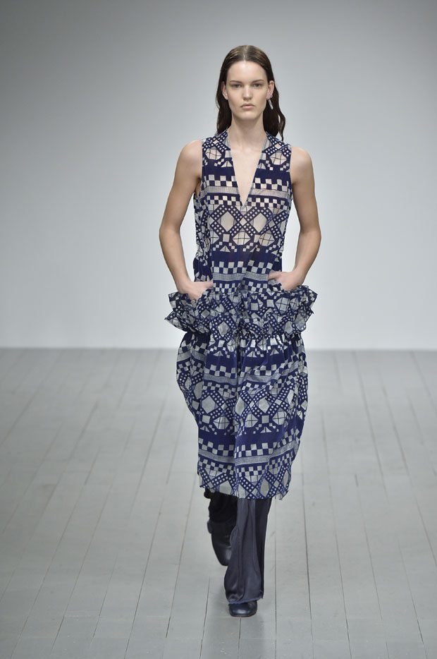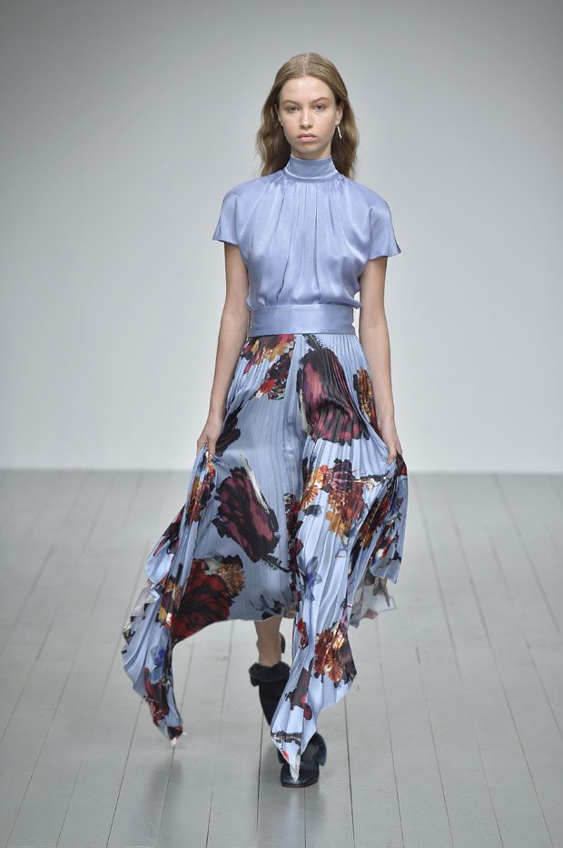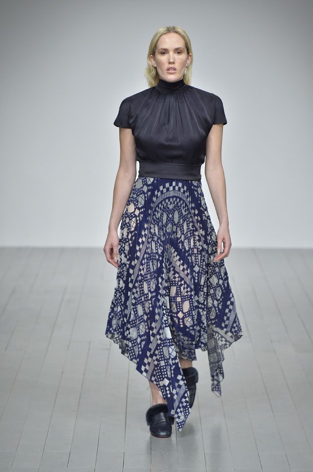 geometric prints and jacquards that sit within a colour palette representing each of the emotive themes. Intense joy manifests in a palette of explosive red and burgundy tones, passionate pinks and crisp cornflour blue. Neon pink florals are flocked onto vibrant red organza in pleated asymmetric hem lines and gathered sleeves. Fluid two-tone super wide pant suits sit alongside two tone chunky British knits and voluminous magenta silk satins. Intense sadness reveals itself in a palette of deep midnight navy, intense royal blue and fresh winter ivory. An almost black-navy is woven as textural fil-coupe and panelled with pleated silk satins. Oversized graphic florals are flocked onto tonal navy organzas in pleated skirts, dresses and over-dyed silk satins. Draped tops are layered beneath signature large-scale geometric jacquards woven with chunky woollen yarns. Hope is brought together in a simple fresh palette of white, ivory and cream. Injected with bright mustard, soaring reds and a rich bordeaux. Hand painted florals printed onto jacquard silks are gathered into exaggerated draped sleeves in dresses, tops and reimagined Teatum Jones shirt dresses. – from Teatum Jones