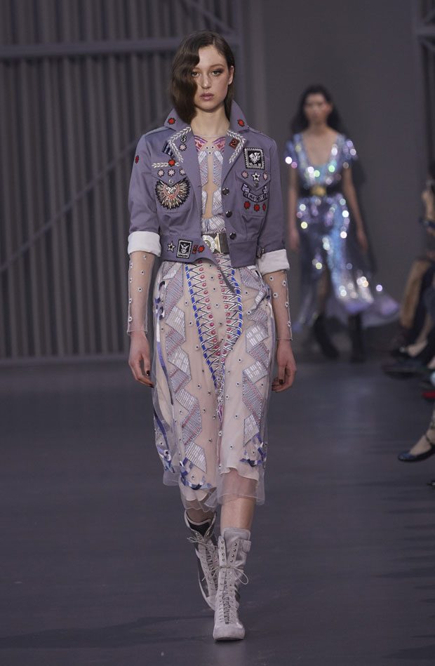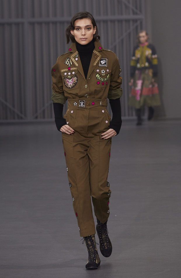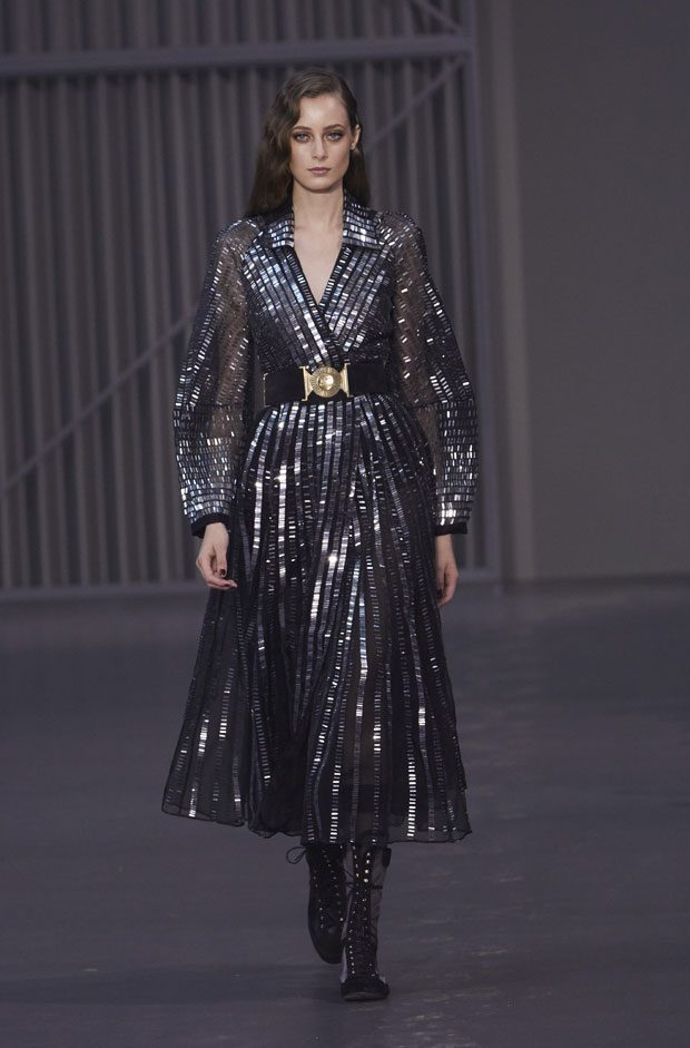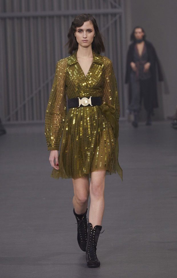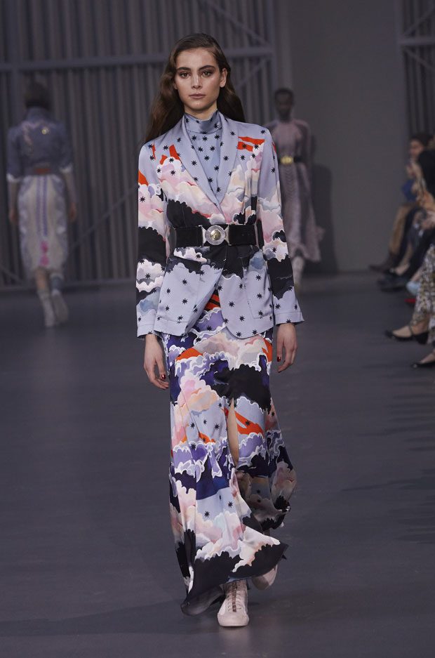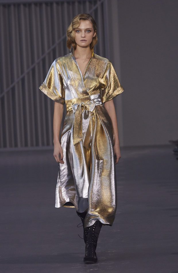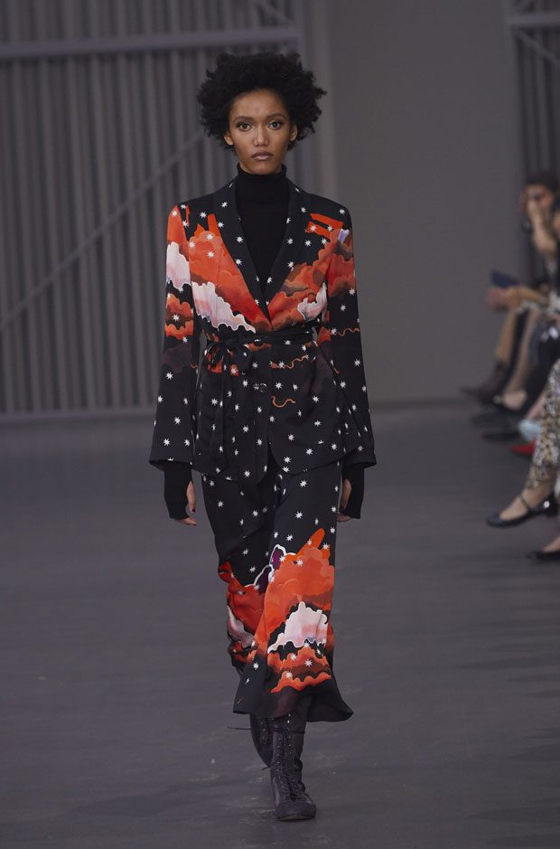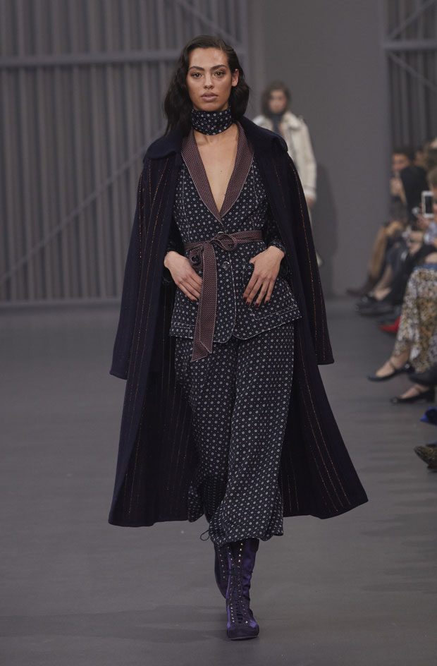 Workwear inspired silhouettes are emblazoned with embroidered patches referencing the romance of airmail and the decoration of achievement; rich visual references which are re-interpreted throughout the collection. Daywear is an exercise in contrast. Printed metallic silk fil coupe and fully sequined power mesh dresses paired with boxy cotton drill jackets and luxe Punto Milano coats. High shine for day, rebelling against expectations. Soft printed tailoring with shawl collars and cropped trousers alongside sharp double breasted pinstripe jackets styled with elegant flying scarves. Belted knit jumpsuits and coats with metallic pinstripes add to a collection rich in knitwear, separates and outerwear. Aviator jackets in shearling and wool trimmed with Sherpa fleece, followed by oversized quilted trenches layered over looks. Prints emulating starry night skies on satin back crepe suiting and hammered silk dresses. This season the colour palette is a homage to the era of film noir; from venom, ivy and moss greens to moonbeam, slate and silver greys, peppered with sienna, ochre and soft pink hues. Printed neckerchiefs, waisted gold medallion belts and boxing boots for both day and night complete the polished offering. Eveningwear takes a cue from old Hollywood. Graphic stitch embroidery, which reflect the diagrammatic drawings of early flying machines and parachute strings, adorn floor skimming gowns. A liquid gold lame jumpsuit evokes the metallic sheen of aeroplanes. Asymmetric engineered sequins, imitating folded ribbons, wrap around the body to expose the sheerest of panels and showcase the iconic techniques and craftsmanship of the Temperley studio. – from Temperley London