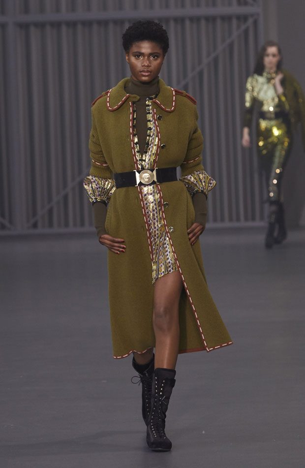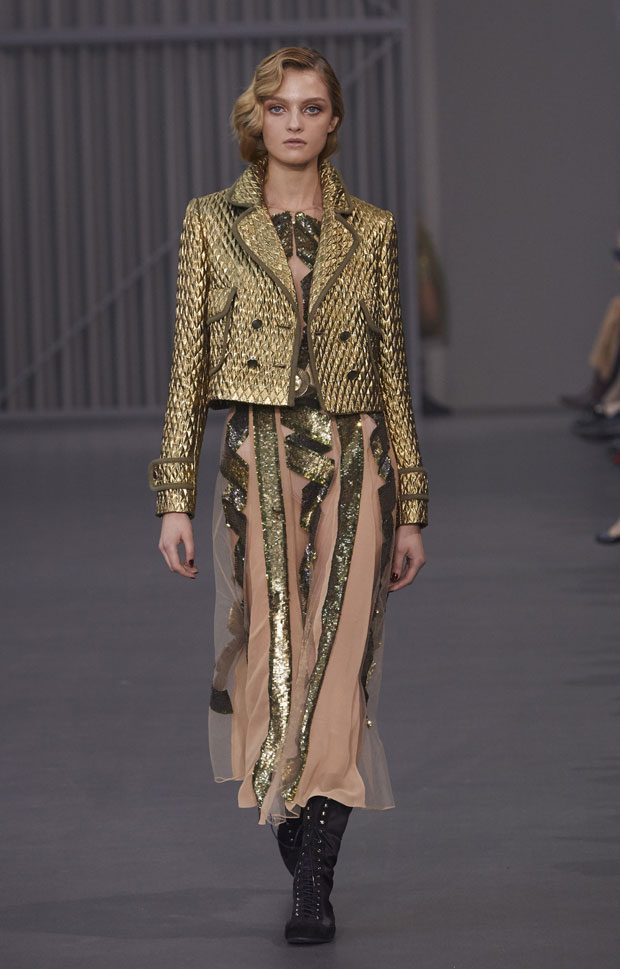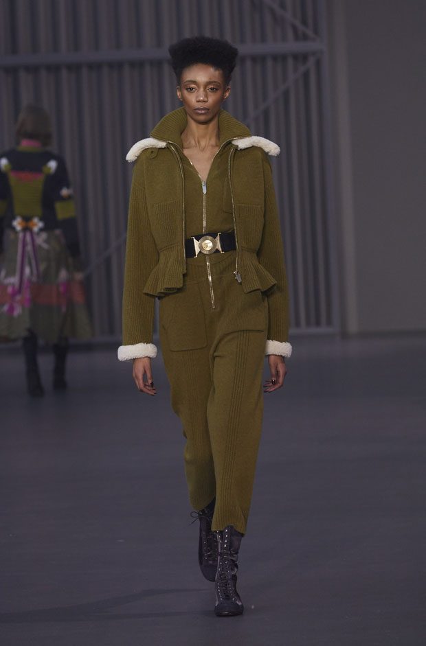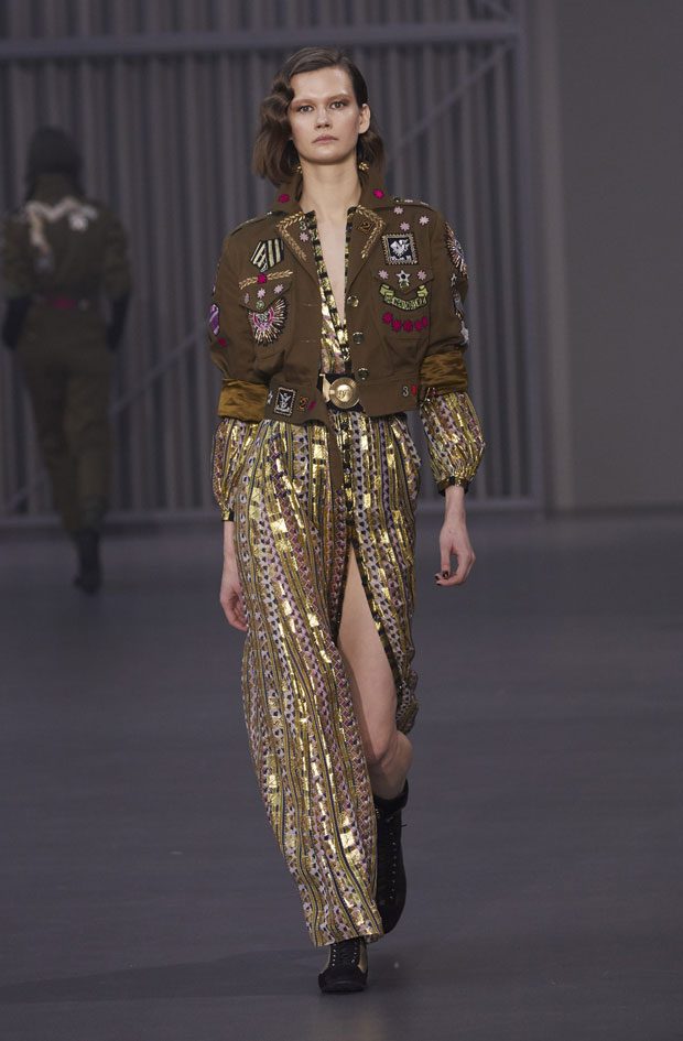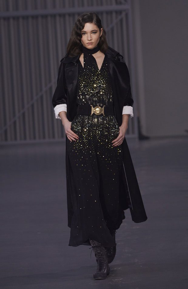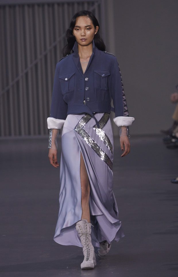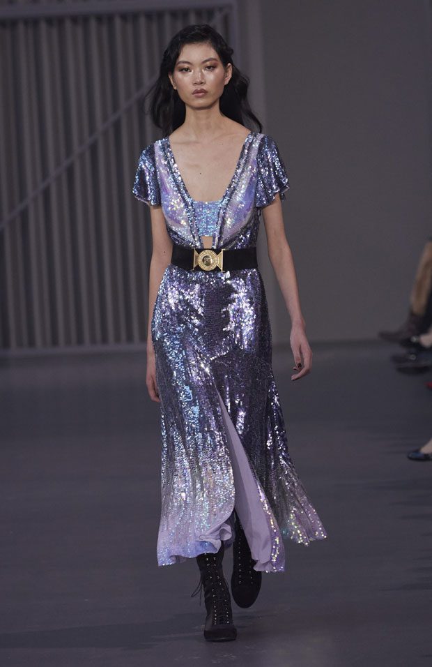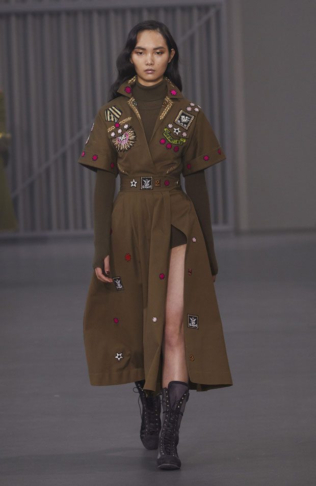 Workwear inspired silhouettes are emblazoned with embroidered patches referencing the romance of airmail and the decoration of achievement; rich visual references which are re-interpreted throughout the collection. Daywear is an exercise in contrast. Printed metallic silk fil coupe and fully sequined power mesh dresses paired with boxy cotton drill jackets and luxe Punto Milano coats. High shine for day, rebelling against expectations. Soft printed tailoring with shawl collars and cropped trousers alongside sharp double breasted pinstripe jackets styled with elegant flying scarves. Belted knit jumpsuits and coats with metallic pinstripes add to a collection rich in knitwear, separates and outerwear. Aviator jackets in shearling and wool trimmed with Sherpa fleece, followed by oversized quilted trenches layered over looks. Prints emulating starry night skies on satin back crepe suiting and hammered silk dresses. This season the colour palette is a homage to the era of film noir; from venom, ivy and moss greens to moonbeam, slate and silver greys, peppered with sienna, ochre and soft pink hues. Printed neckerchiefs, waisted gold medallion belts and boxing boots for both day and night complete the polished offering. Eveningwear takes a cue from old Hollywood. Graphic stitch embroidery, which reflect the diagrammatic drawings of early flying machines and parachute strings, adorn floor skimming gowns. A liquid gold lame jumpsuit evokes the metallic sheen of aeroplanes. Asymmetric engineered sequins, imitating folded ribbons, wrap around the body to expose the sheerest of panels and showcase the iconic techniques and craftsmanship of the Temperley studio. – from Temperley London
