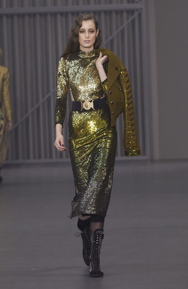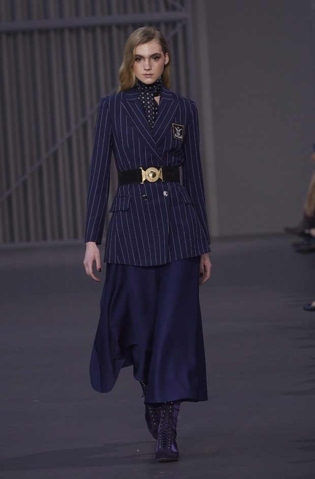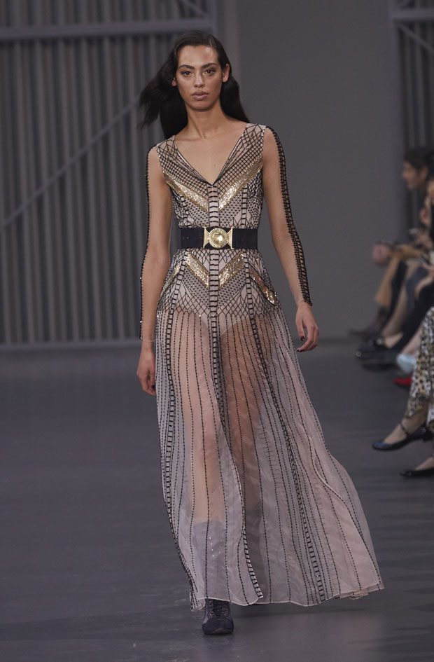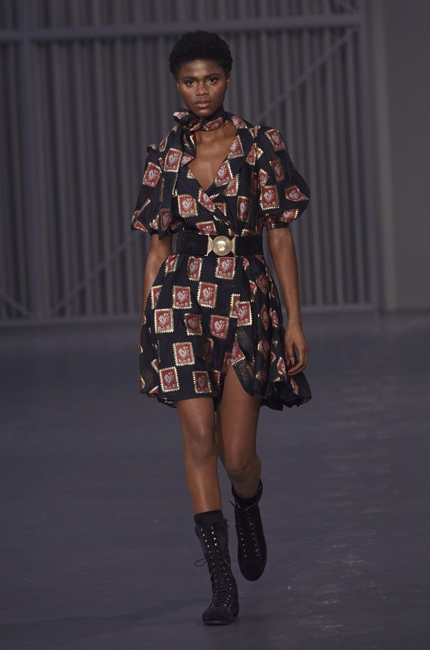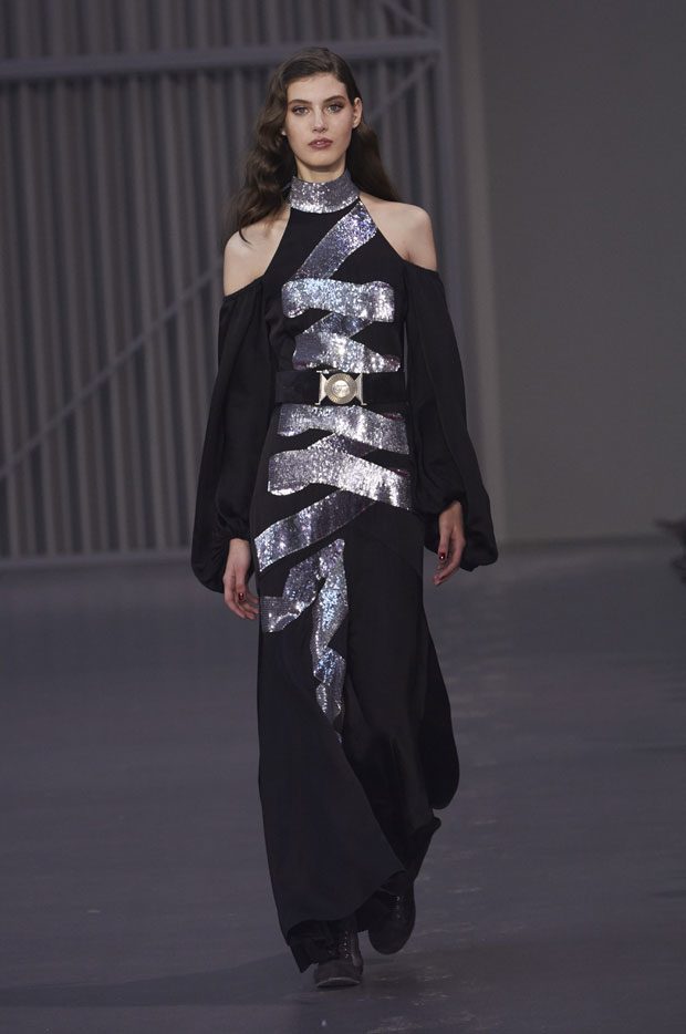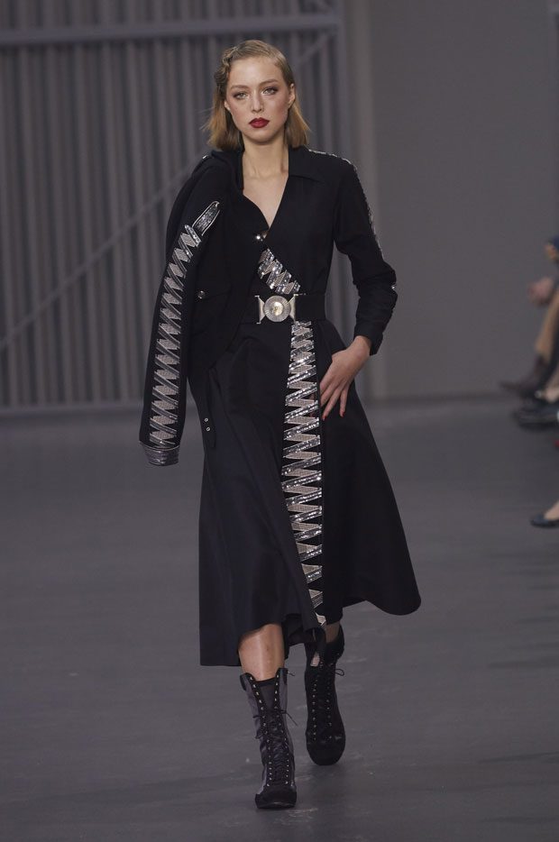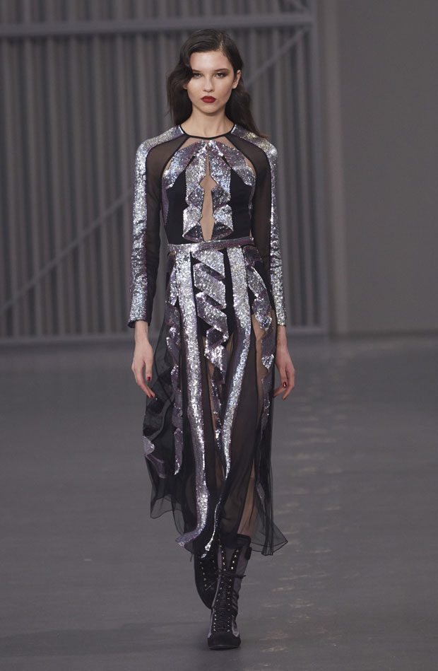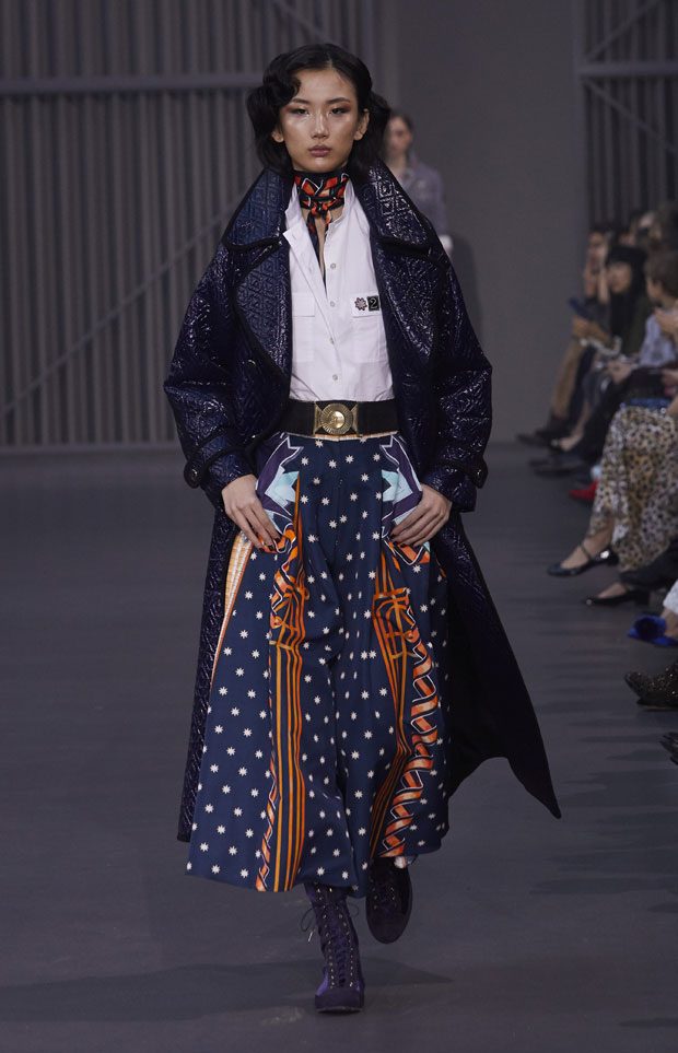Workwear inspired silhouettes are emblazoned with embroidered patches referencing the romance of airmail and the decoration of achievement; rich visual references which are re-interpreted throughout the collection. Daywear is an exercise in contrast. Printed metallic silk fil coupe and fully sequined power mesh dresses paired with boxy cotton drill jackets and luxe Punto Milano coats. High shine for day, rebelling against expectations. Soft printed tailoring with shawl collars and cropped trousers alongside sharp double breasted pinstripe jackets styled with elegant flying scarves. Belted knit jumpsuits and coats with metallic pinstripes add to a collection rich in knitwear, separates and outerwear. Aviator jackets in shearling and wool trimmed with Sherpa fleece, followed by oversized quilted trenches layered over looks. Prints emulating starry night skies on satin back crepe suiting and hammered silk dresses. This season the colour palette is a homage to the era of film noir; from venom, ivy and moss greens to moonbeam, slate and silver greys, peppered with sienna, ochre and soft pink hues. Printed neckerchiefs, waisted gold medallion belts and boxing boots for both day and night complete the polished offering. Eveningwear takes a cue from old Hollywood. Graphic stitch embroidery, which reflect the diagrammatic drawings of early flying machines and parachute strings, adorn floor skimming gowns. A liquid gold lame jumpsuit evokes the metallic sheen of aeroplanes. Asymmetric engineered sequins, imitating folded ribbons, wrap around the body to expose the sheerest of panels and showcase the iconic techniques and craftsmanship of the Temperley studio. – from Temperley London
