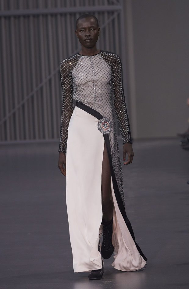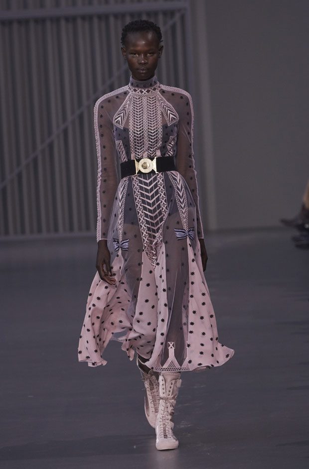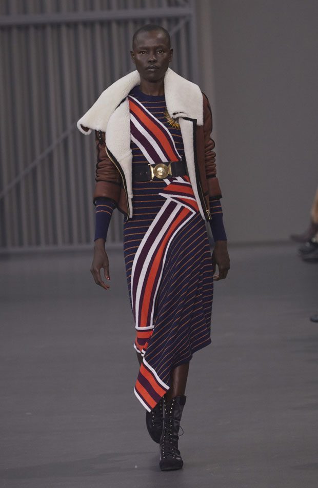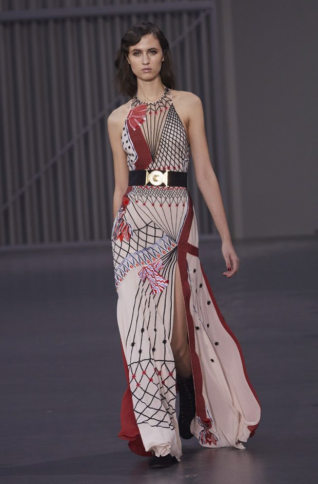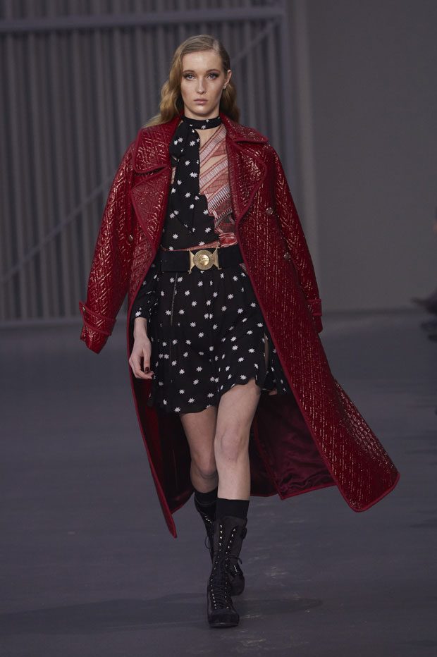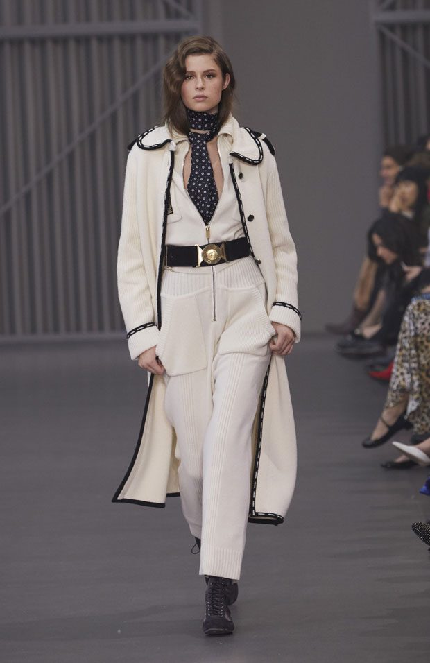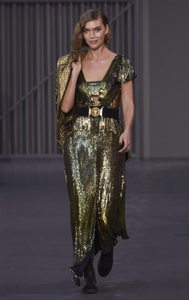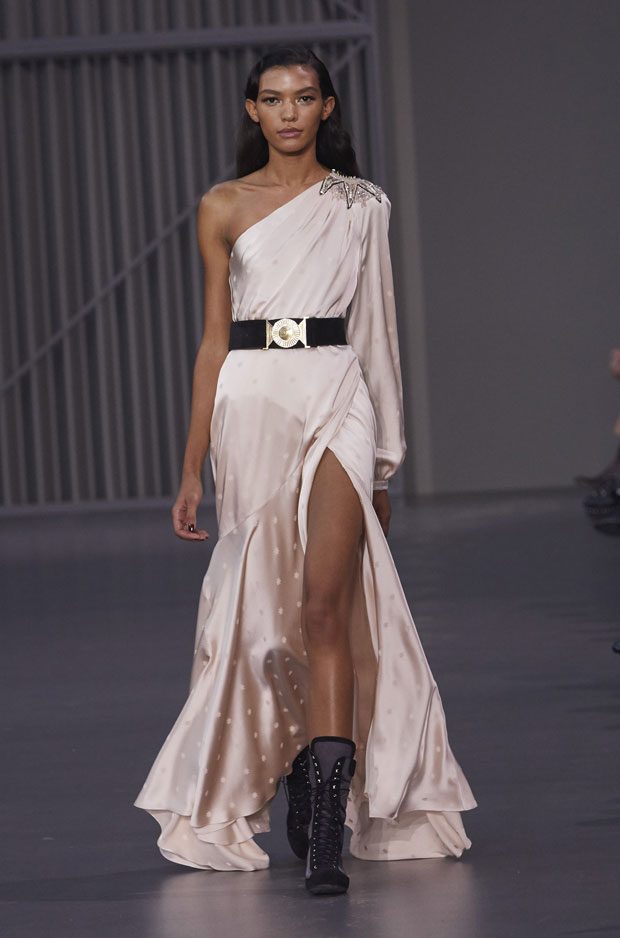 Workwear inspired silhouettes are emblazoned with embroidered patches referencing the romance of airmail and the decoration of achievement; rich visual references which are re-interpreted throughout the collection. Daywear is an exercise in contrast. Printed metallic silk fil coupe and fully sequined power mesh dresses paired with boxy cotton drill jackets and luxe Punto Milano coats. High shine for day, rebelling against expectations. Soft printed tailoring with shawl collars and cropped trousers alongside sharp double breasted pinstripe jackets styled with elegant flying scarves. Belted knit jumpsuits and coats with metallic pinstripes add to a collection rich in knitwear, separates and outerwear. Aviator jackets in shearling and wool trimmed with Sherpa fleece, followed by oversized quilted trenches layered over looks. Prints emulating starry night skies on satin back crepe suiting and hammered silk dresses. This season the colour palette is a homage to the era of film noir; from venom, ivy and moss greens to moonbeam, slate and silver greys, peppered with sienna, ochre and soft pink hues. Printed neckerchiefs, waisted gold medallion belts and boxing boots for both day and night complete the polished offering. Eveningwear takes a cue from old Hollywood. Graphic stitch embroidery, which reflect the diagrammatic drawings of early flying machines and parachute strings, adorn floor skimming gowns. A liquid gold lame jumpsuit evokes the metallic sheen of aeroplanes. Asymmetric engineered sequins, imitating folded ribbons, wrap around the body to expose the sheerest of panels and showcase the iconic techniques and craftsmanship of the Temperley studio. – from Temperley London