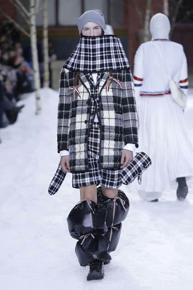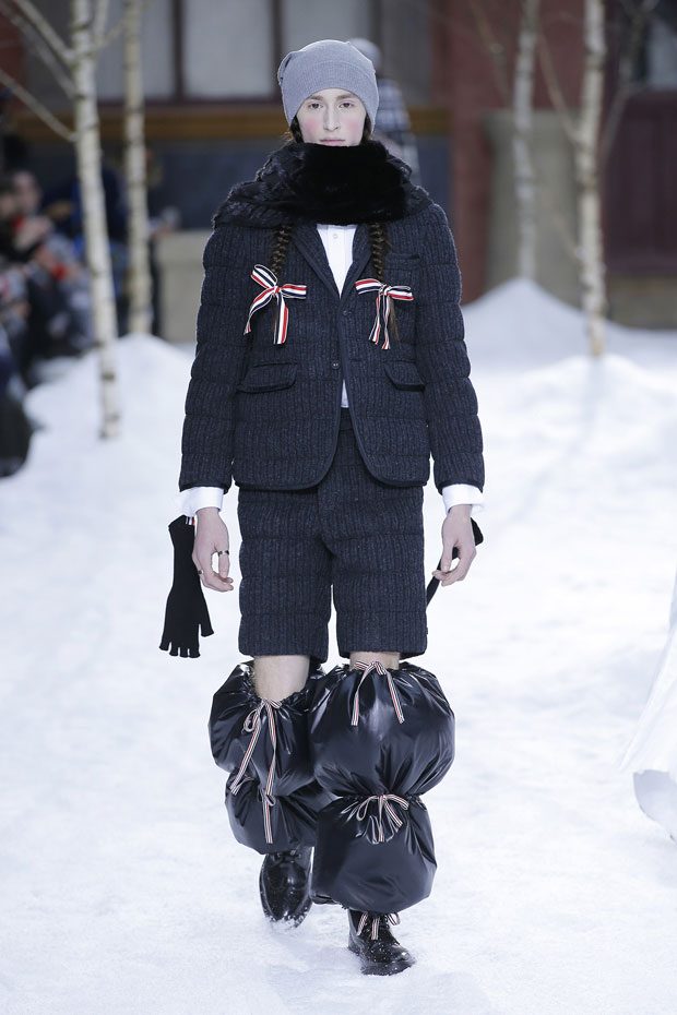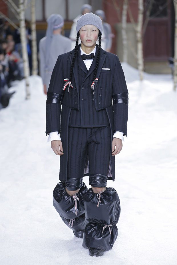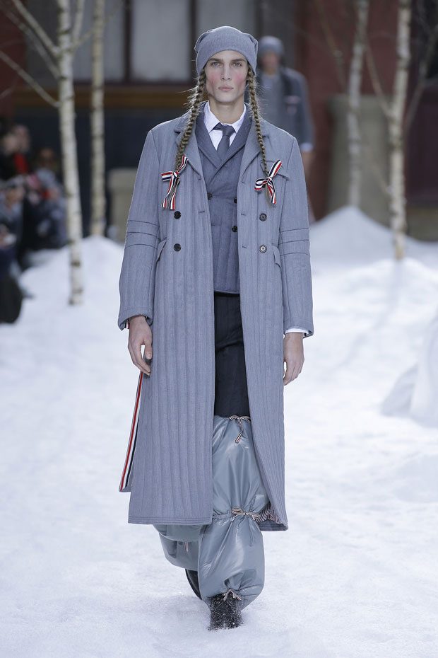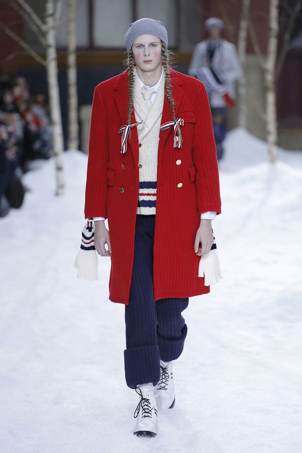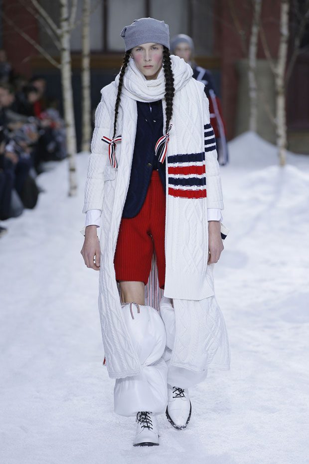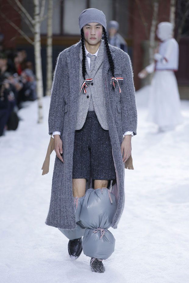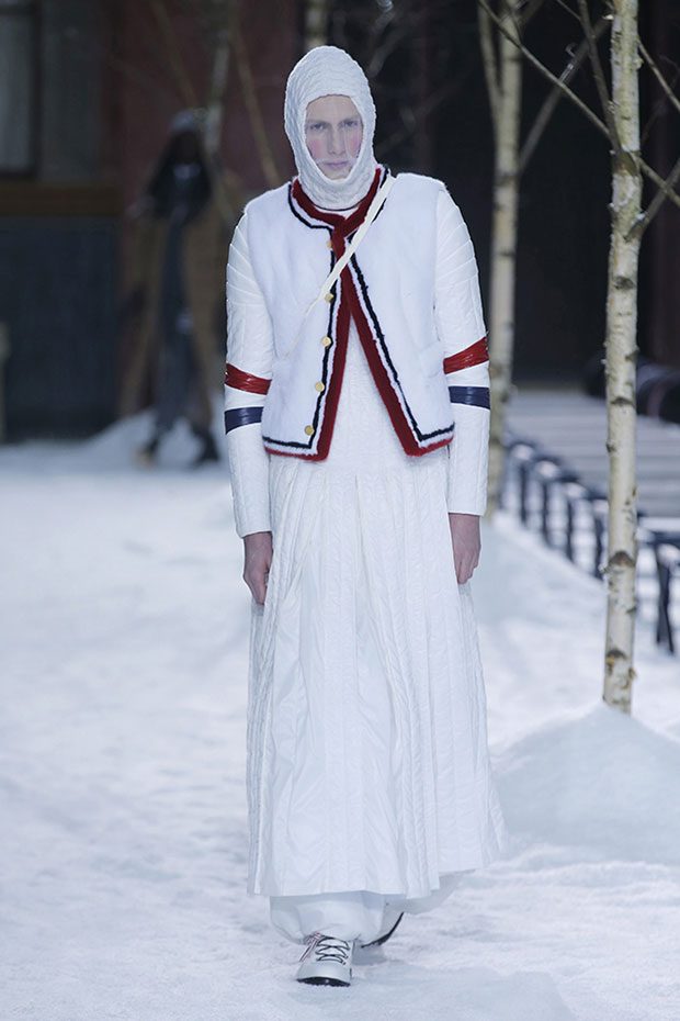 Elaborations on a jacket and a pair of trousers. This way and that way. That’s it. Reassessing the foundations as a strict play with proportions. The sack shapes, high armholes and abbreviated lines that ignited thom browne menswear get to the fore. The sportswear trait of the TB repertoire brings to real sportswear. The tailored meets the technical. Old school: a tight edit and a sharp focus. Classic tailoring in knit fabric, classic tailoring with padding and skiing articulations, down-filled classic tailoring. Tailoring as sportswear, sportswear as tailoring. That’s it. Old school around the clock, from the business suit to black tie attire, rethought in proportions, use and construction. An old school selection of flannels, donegal tweeds, frescoes in an old school array of camel & grey, red, white and blue, black. equally old school: irish knits, fair isle knits, TB tartans, solids. Old school TB. Variation after variation, it all comes down to a grey suit. That’s it. – from Thom Browne