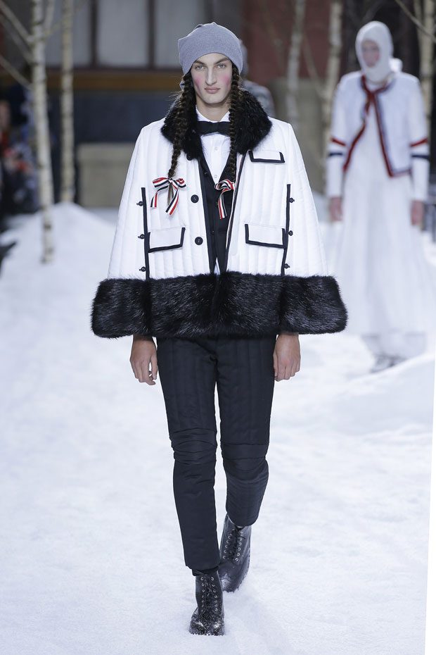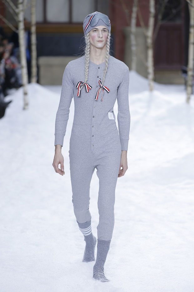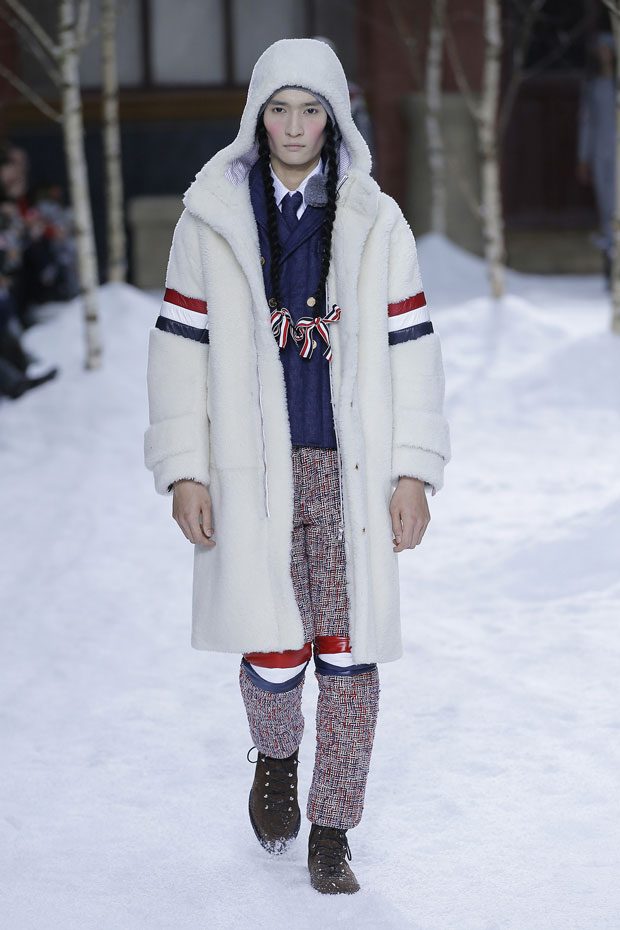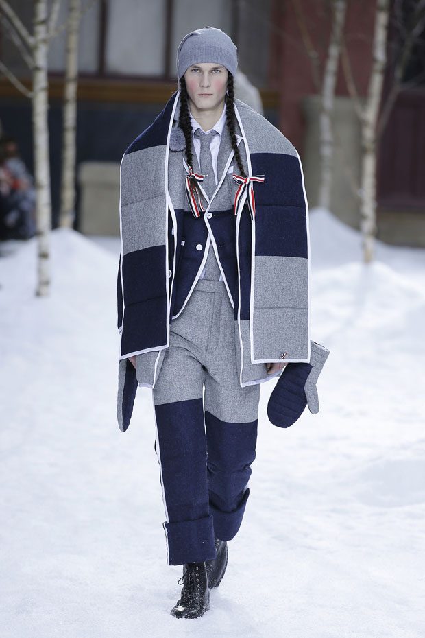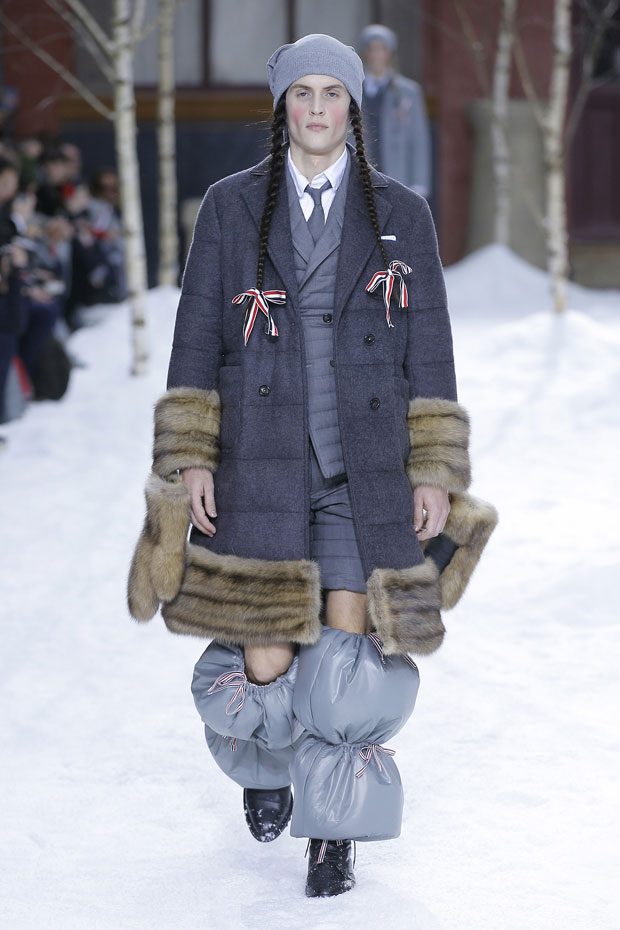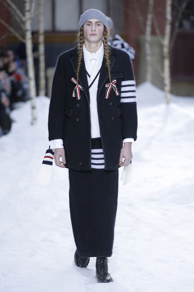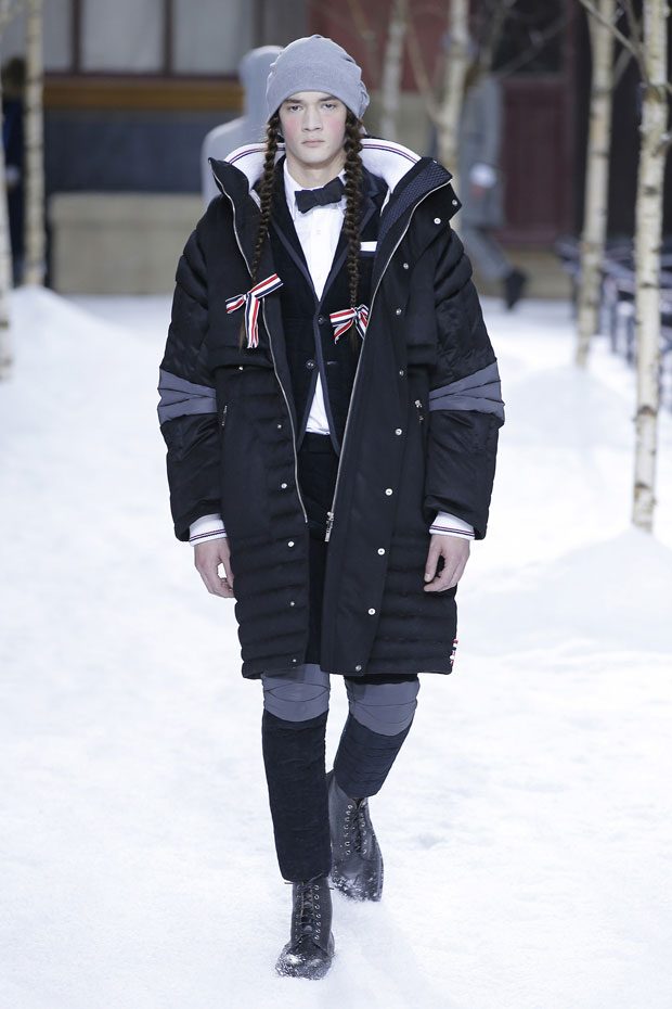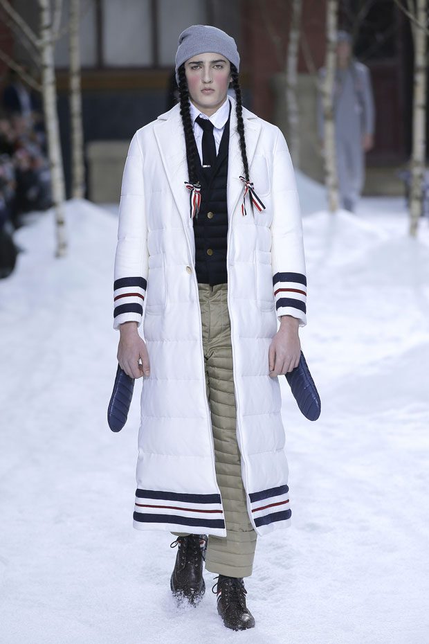 Elaborations on a jacket and a pair of trousers. This way and that way. That’s it. Reassessing the foundations as a strict play with proportions. The sack shapes, high armholes and abbreviated lines that ignited thom browne menswear get to the fore. The sportswear trait of the TB repertoire brings to real sportswear. The tailored meets the technical. Old school: a tight edit and a sharp focus. Classic tailoring in knit fabric, classic tailoring with padding and skiing articulations, down-filled classic tailoring. Tailoring as sportswear, sportswear as tailoring. That’s it. Old school around the clock, from the business suit to black tie attire, rethought in proportions, use and construction. An old school selection of flannels, donegal tweeds, frescoes in an old school array of camel & grey, red, white and blue, black. equally old school: irish knits, fair isle knits, TB tartans, solids. Old school TB. Variation after variation, it all comes down to a grey suit. That’s it. – from Thom Browne