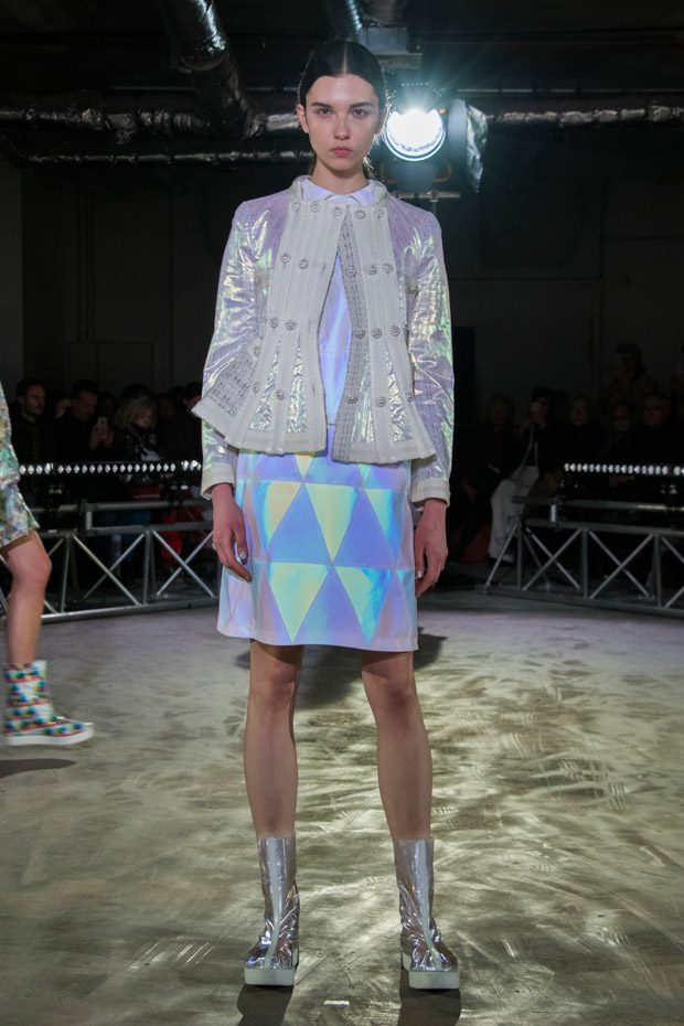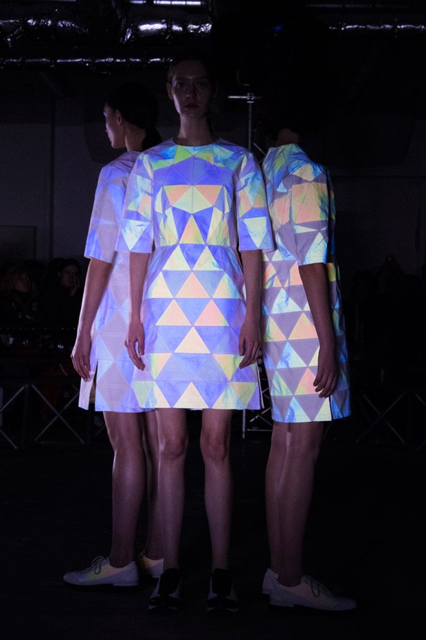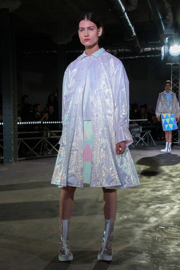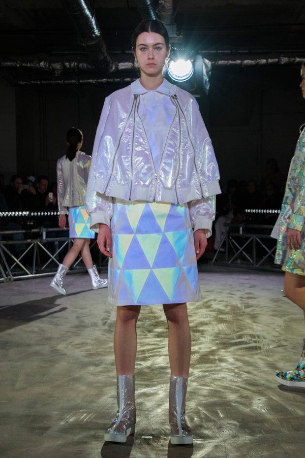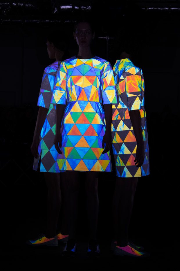 “Spectrum produced by light. Developed a Prism material specially for this collection. It changes its colors variously from blue, green, yellow and red according to the angle from which it is viewed. It creates a huge variety of expressions according to usual bodily movements. A light gives out multi-colors according to its ever-changing wavelength, which reminds us of a sky. A garment looks red to some people and blue to others. People can receive a color of their own. Multiple view produces diversity.“