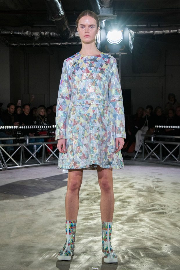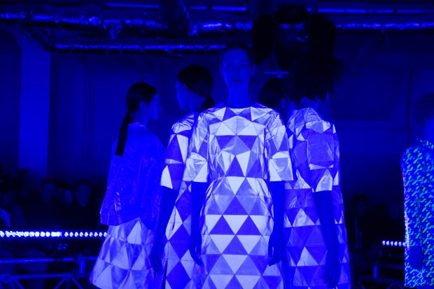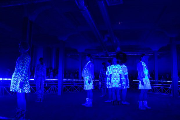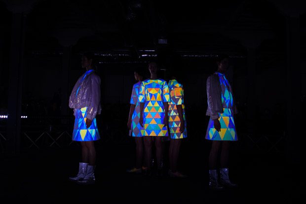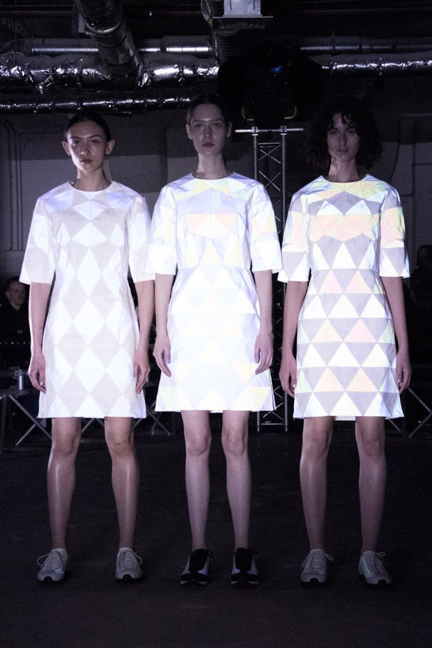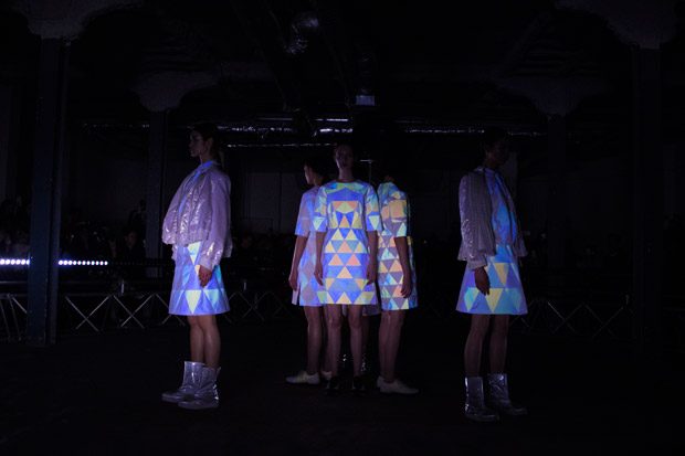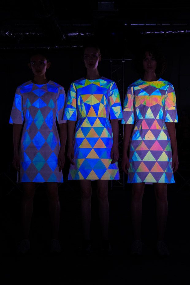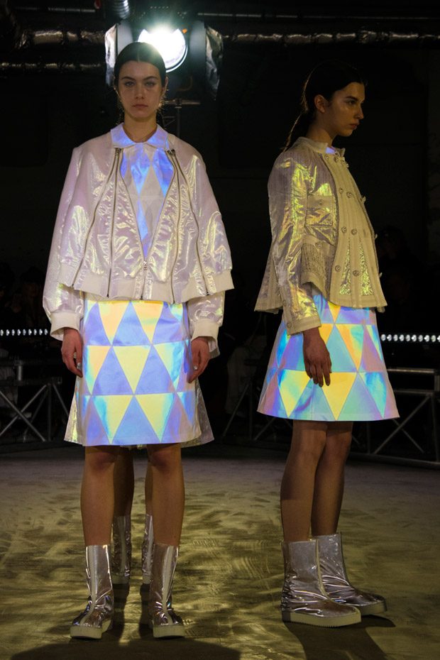 “Spectrum produced by light. Developed a Prism material specially for this collection. It changes its colors variously from blue, green, yellow and red according to the angle from which it is viewed. It creates a huge variety of expressions according to usual bodily movements. A light gives out multi-colors according to its ever-changing wavelength, which reminds us of a sky. A garment looks red to some people and blue to others. People can receive a color of their own. Multiple view produces diversity.“