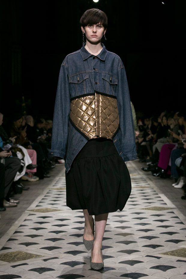 “How to change the silhouette of a garment without losing its original sense or use —a cinched waist in a denim jacket, a draped back in a cotton shirt, an elongated asymmetric hemline in a zipped jacket. I added panels of wool, lurex jaquard or metallic wadding at different points, pushing the volume to the front or back or simply changing the fall of a hemline.