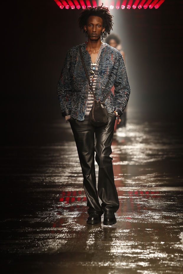After the show, Missoni team shared: “Fashion that fuses scrutiny with refinement, imbuing the idea of knitwear with increasingly bold innovations that are exclusive and unexpected. Expressed in an open and free mix-and-match of textural consistencies, forms and finishes. Trousers that are loose-fitting or flared in knitted patchworks, jackets in masculine cuts and shirt-jackets in wool mohair tartans or checks, mesh knit shirts with vertical stripes and cinched ties at the wrist, buttoned necklines and finishes that are underlined and decorated with two-toned knitted ribbons.”