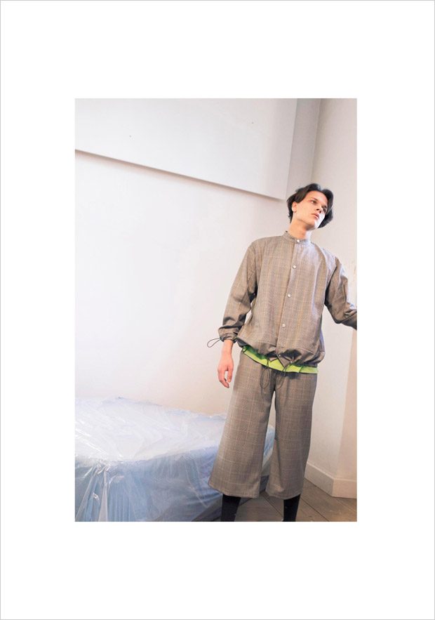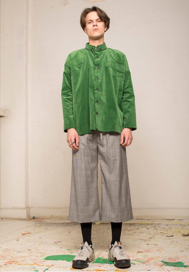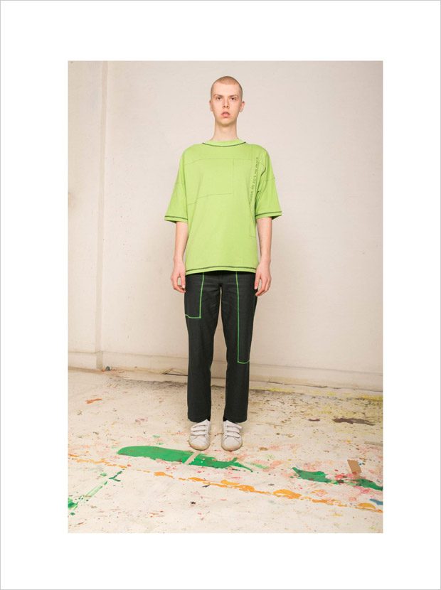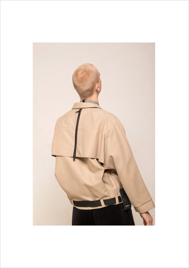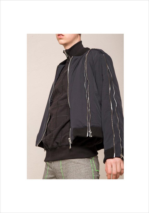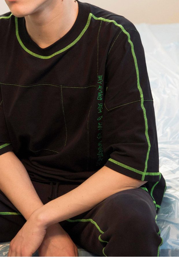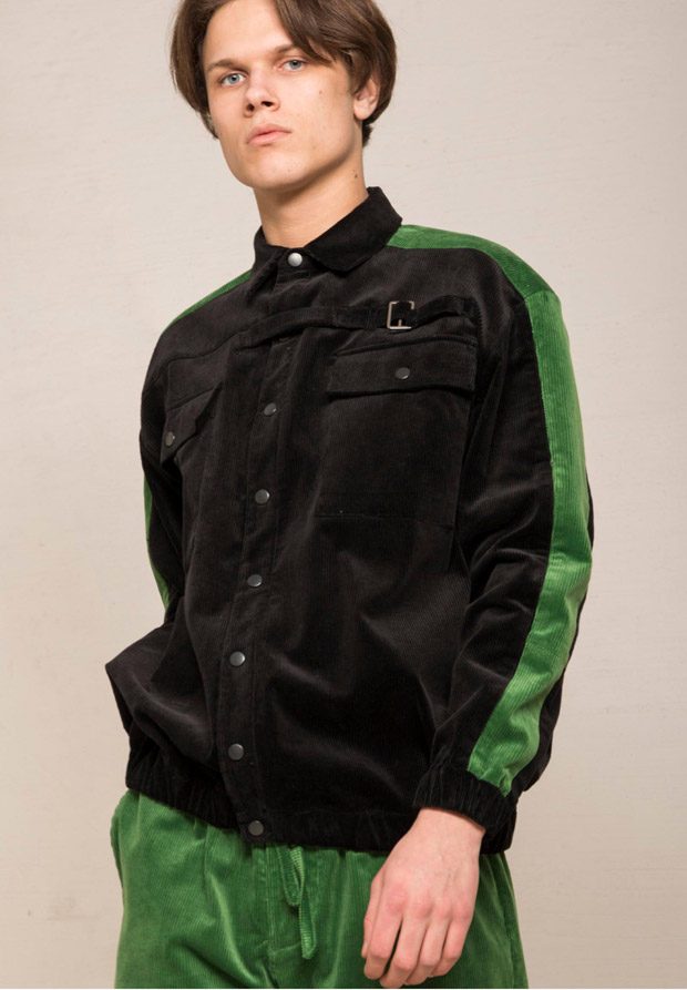 “NOSOMNIA is known for its clever juxtaposition of textiles and silhouettes. For Fall/Winter 2018 the brand is introducing a series of uniquely designed fabrics, including Italian and Japanese suiting wool, lambskin, water resistant tech fabrics, jersey, corduroy and knitwear in Merino wool. The mood of the collection is rooted in the alienated and existential atmosphere of “The Man Who Fell to Earth” and the colour palette mirrors this, with fluorescent neon green and pale light blue to symbolize sky and space. The collection also features a mix of tailored and oversized silhouettes to embody the contrast between captivity and freedom.“