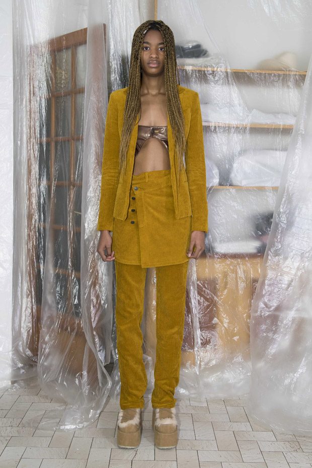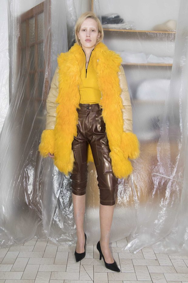 “Surprising shapes and contrasts find an equally surprising balance through the duo’s unique and adept design. Bösch and Gadient’s intuitive approach to deconstruction, reconstruction, and reference produces combinations and an aesthetic that may at first seem inconsistent, but this tension ties the duo’s work together. The Autumn/Winter 2018 collection draws energy from contrasts. Pieces mix bright reds and blues with burnt browns, dusty browns, mustard yellows, pale purples and greens. Different washes of denim and heavily reworked jersey return in this collection. They complement new forms and pieces, such as a puffer overcoat with fur detailing, a richly ruffled and longsleeved dress, or a suit that comes in both flanel and corduroy.“