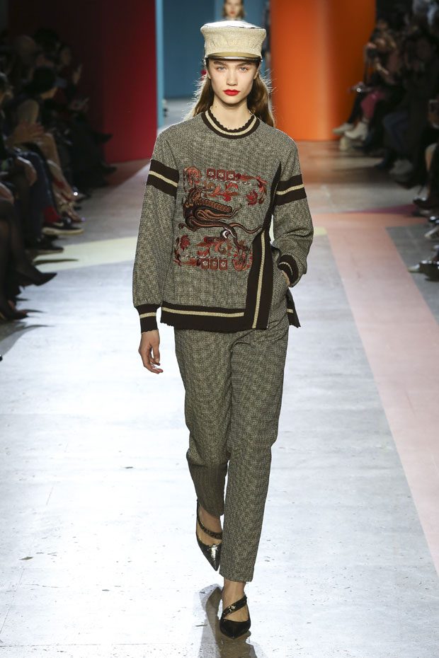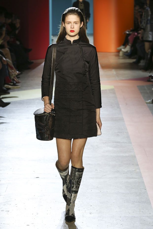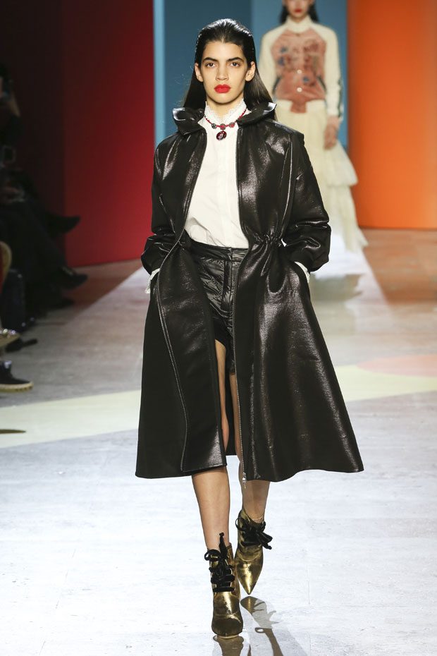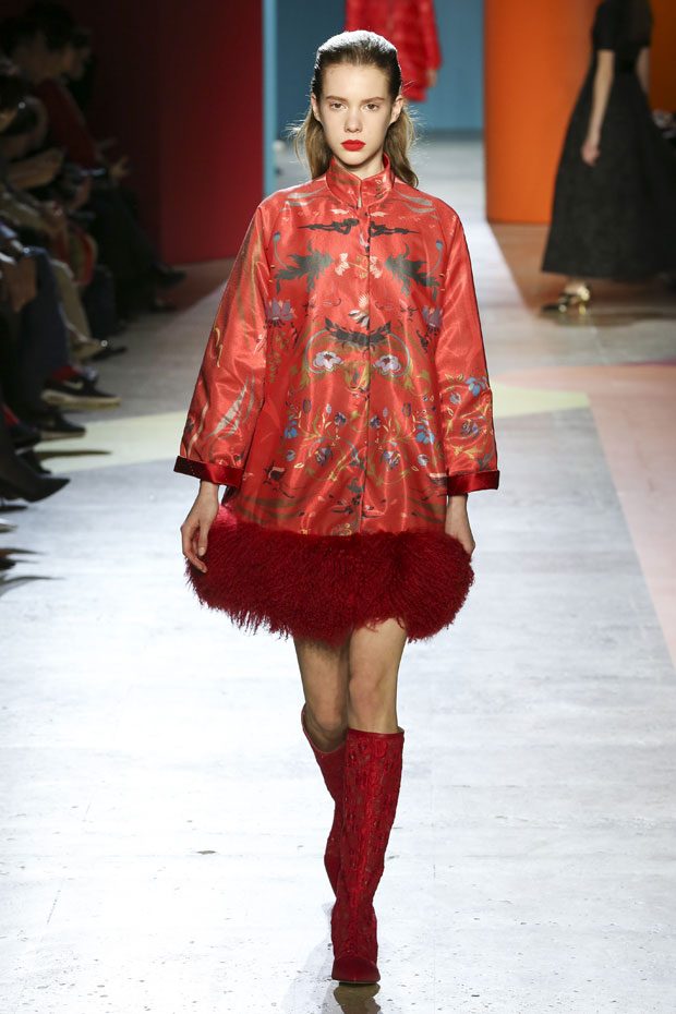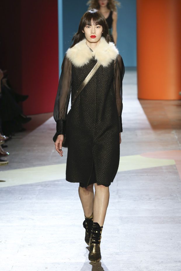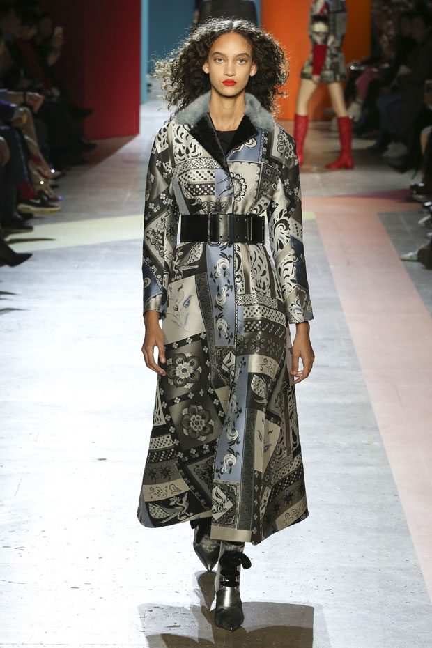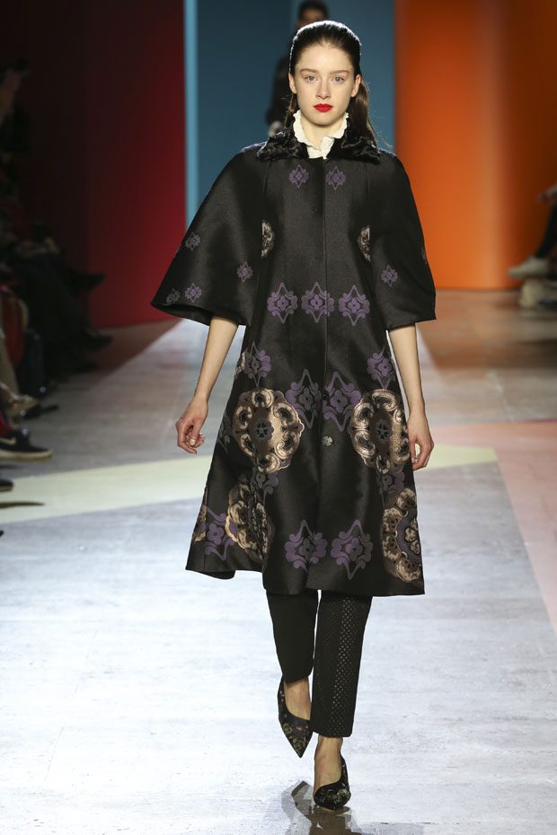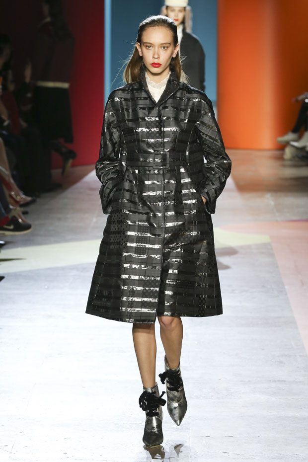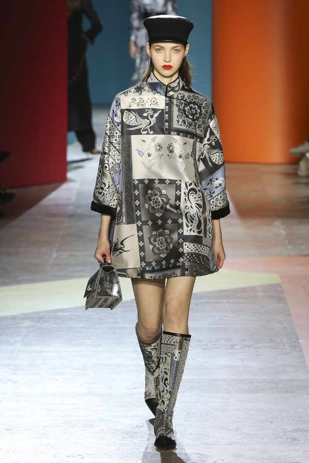 The rich coloring of the Dunhuang Murals inspired this season’s color palette—pale pinks, tender greens, golden yellows, indigo, beige, orange, bronze and ink black. The inspiration for the unique fabric patterns can also be found in the Dunhuang Murals, which have witnessed the rise and fall of dynasties and seen countless artisans from different eras. To hark back the most elegant and iconic era of new western fashion, moreover to express the ultimate unique beauty of women. Use by exquisite wools mixed with metallics and rubber latex that add a futuristic, avant-garde touch and embellished with retro, colorful socks. Sleek, knee-length trench coats, A-line silhouettes with wasp-waisted, and bouffant skirts are all tailored to present a woman’s figure at its best. – from Shiatzy Chen