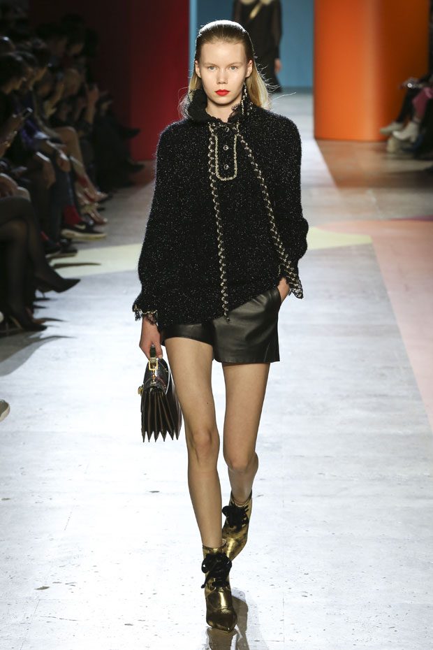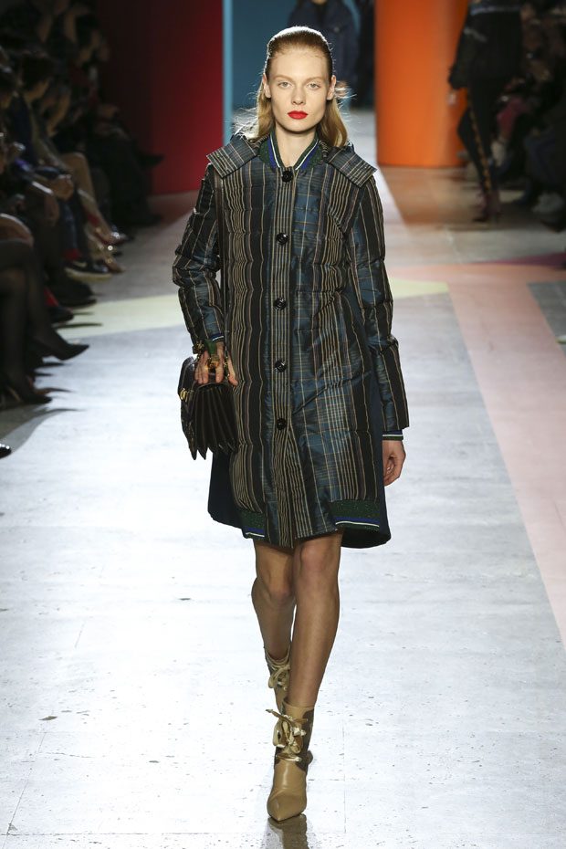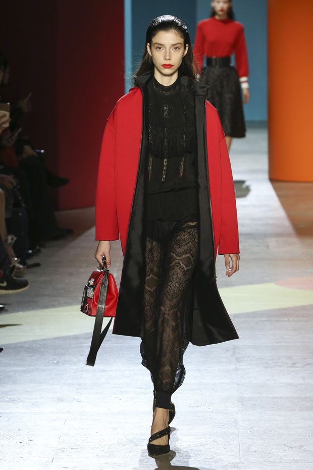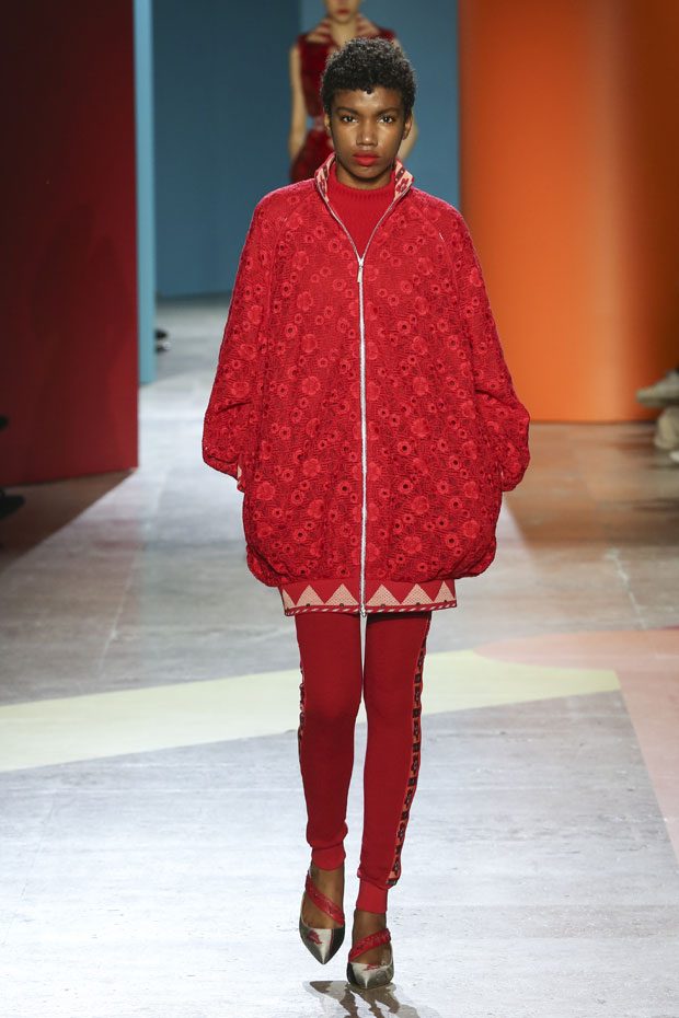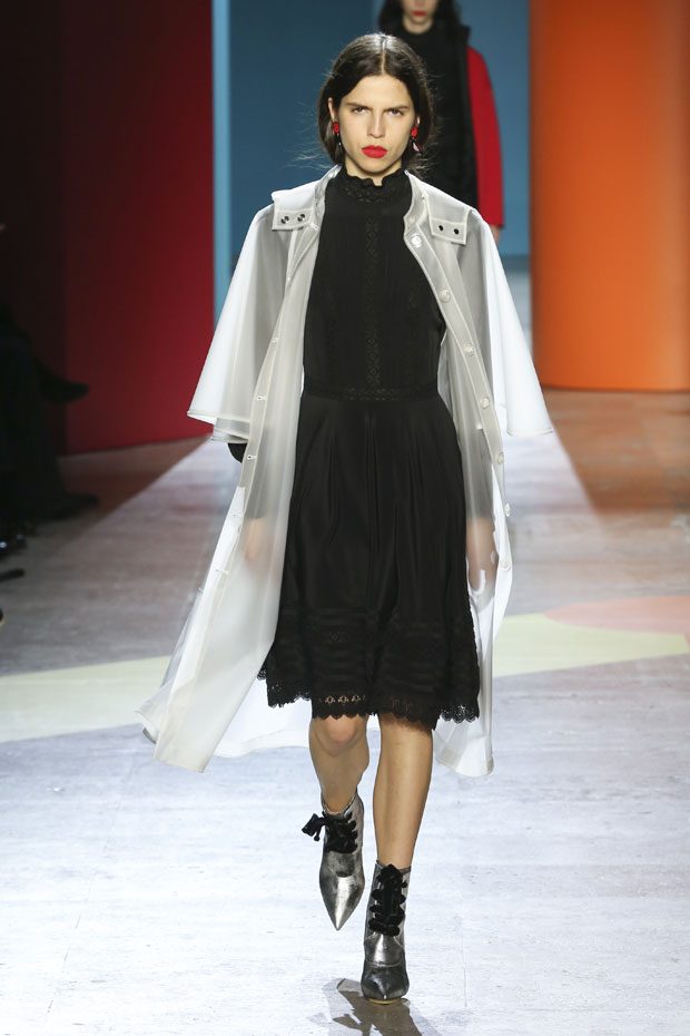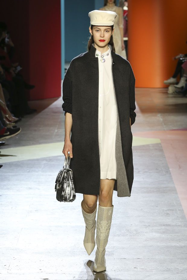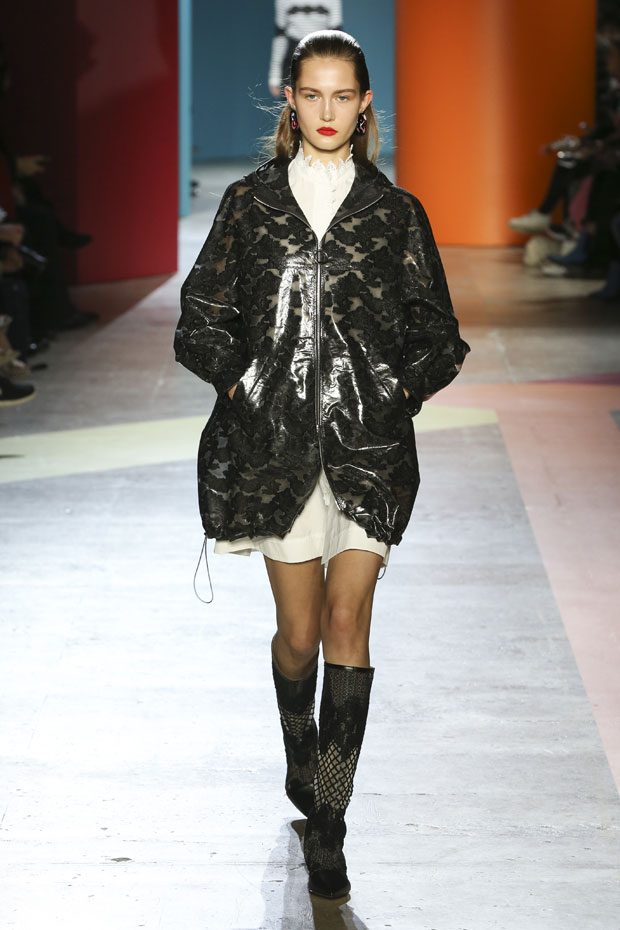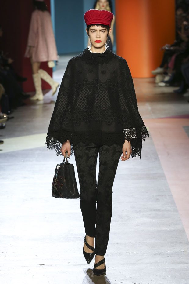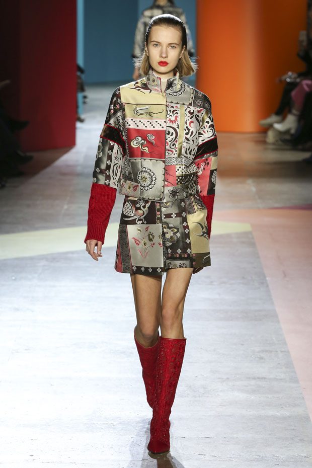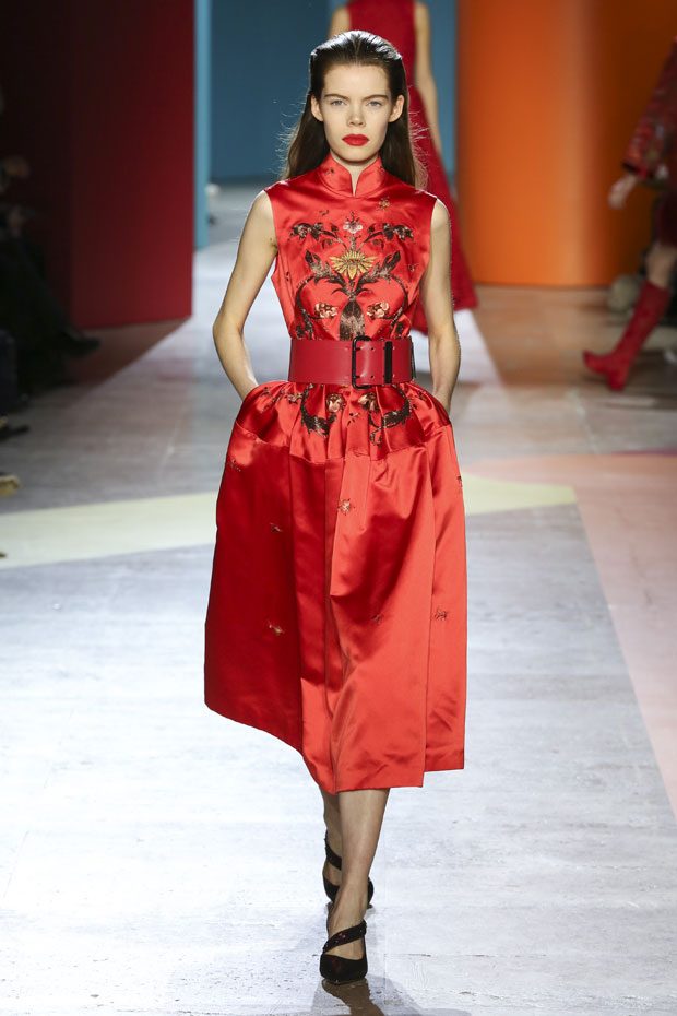 The rich coloring of the Dunhuang Murals inspired this season’s color palette—pale pinks, tender greens, golden yellows, indigo, beige, orange, bronze and ink black. The inspiration for the unique fabric patterns can also be found in the Dunhuang Murals, which have witnessed the rise and fall of dynasties and seen countless artisans from different eras. To hark back the most elegant and iconic era of new western fashion, moreover to express the ultimate unique beauty of women. Use by exquisite wools mixed with metallics and rubber latex that add a futuristic, avant-garde touch and embellished with retro, colorful socks. Sleek, knee-length trench coats, A-line silhouettes with wasp-waisted, and bouffant skirts are all tailored to present a woman’s figure at its best. – from Shiatzy Chen