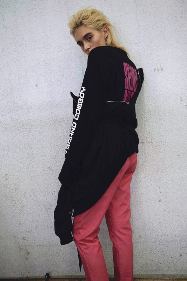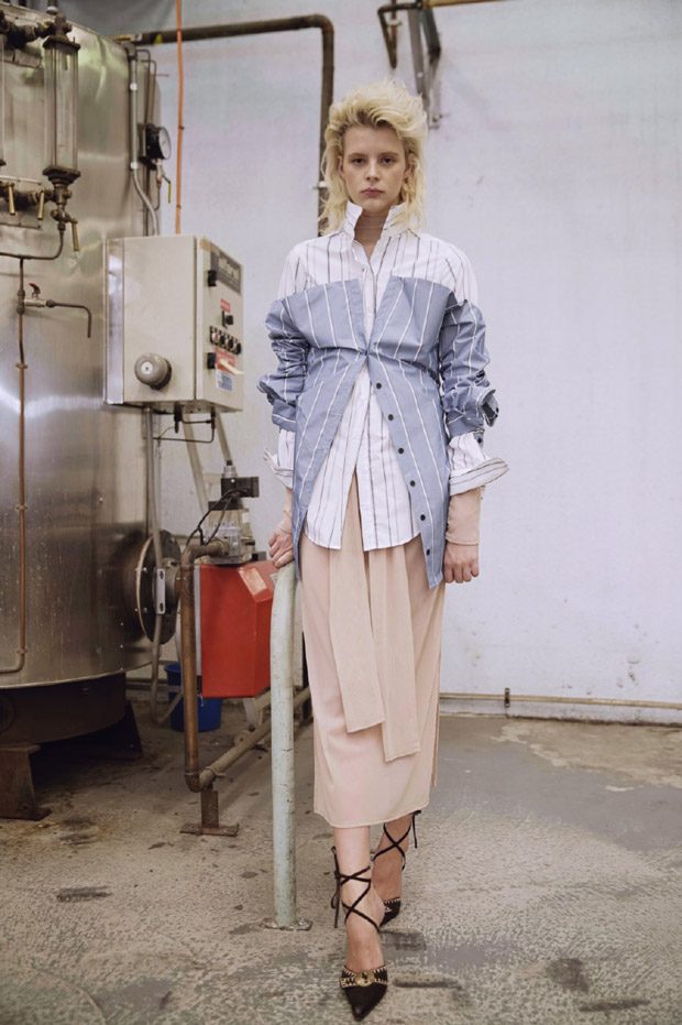 “Taking the framework of traditional collections, Strateas Carlucci breakdown and re-create new hybrid garments of Men’s and Women’s wardrobe staples, melding denim with tailoring, coats with blazers, dresses with shirts and clashing fabric textures and patterns. Like Bennett’s work, this enables a new perspective for the audience to question the role of these items.