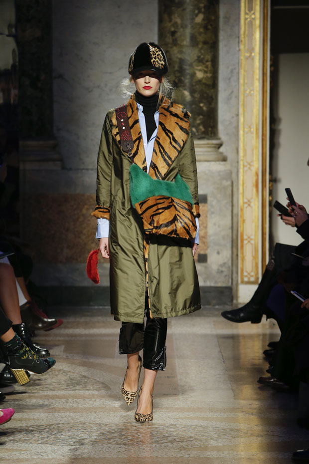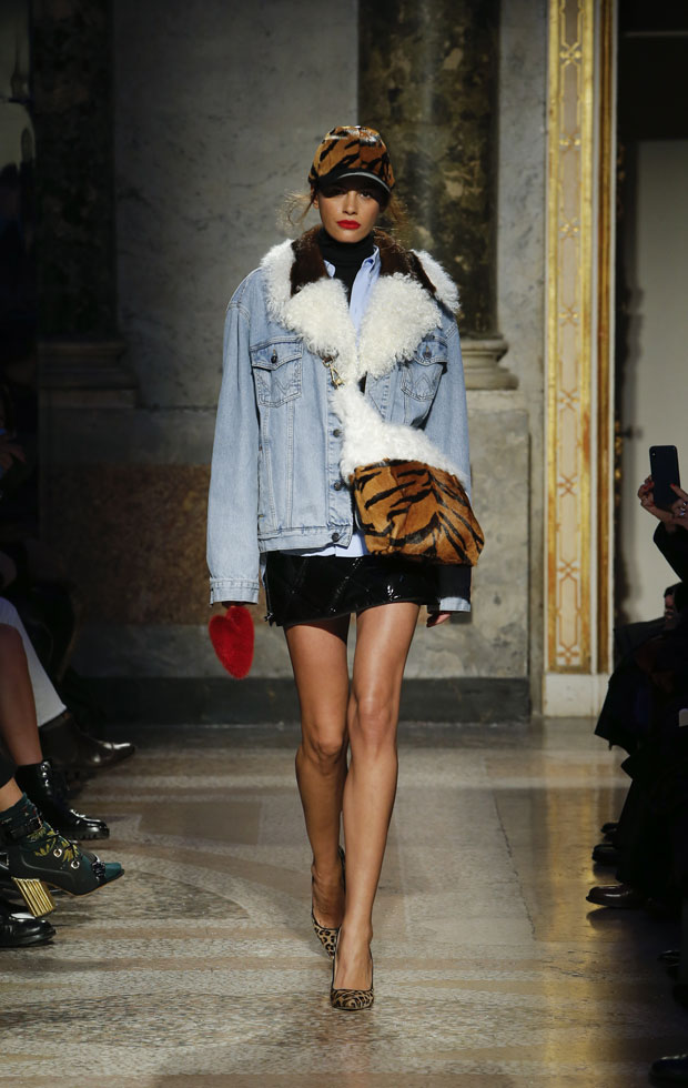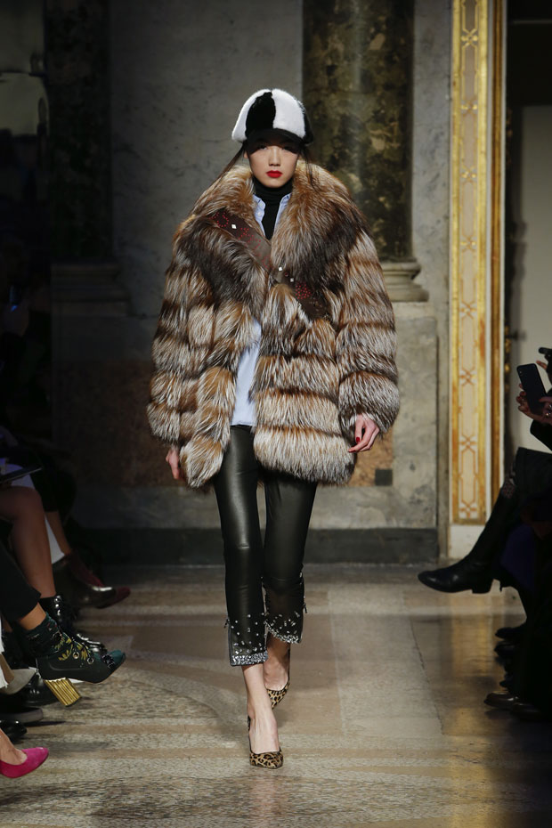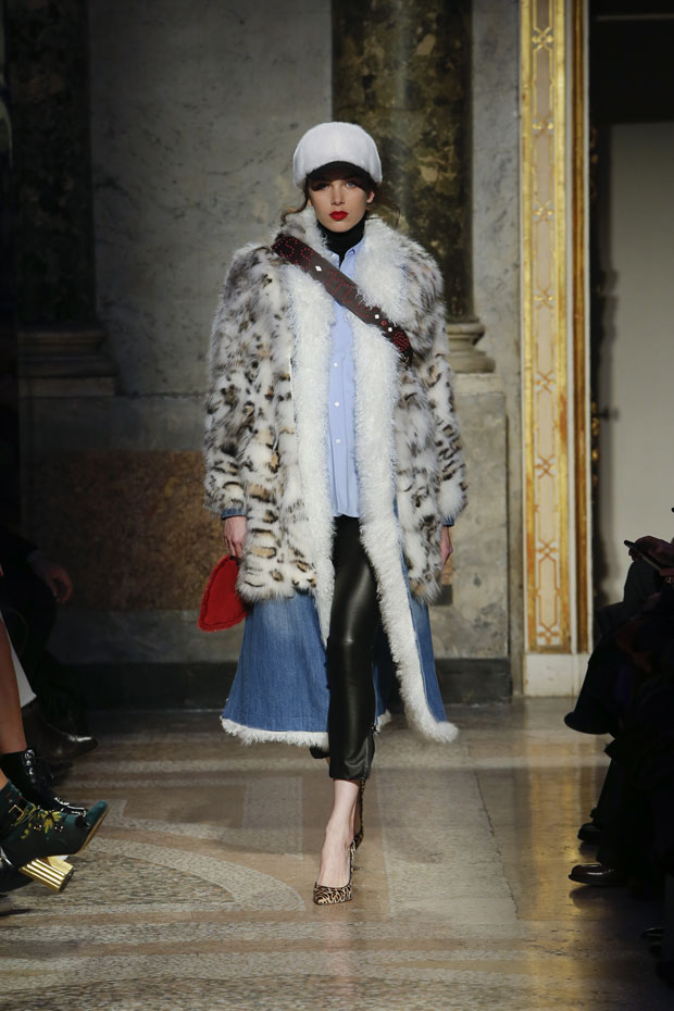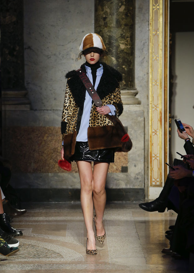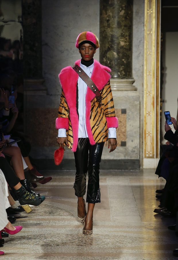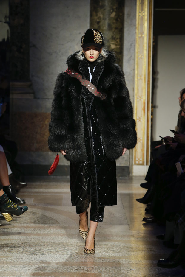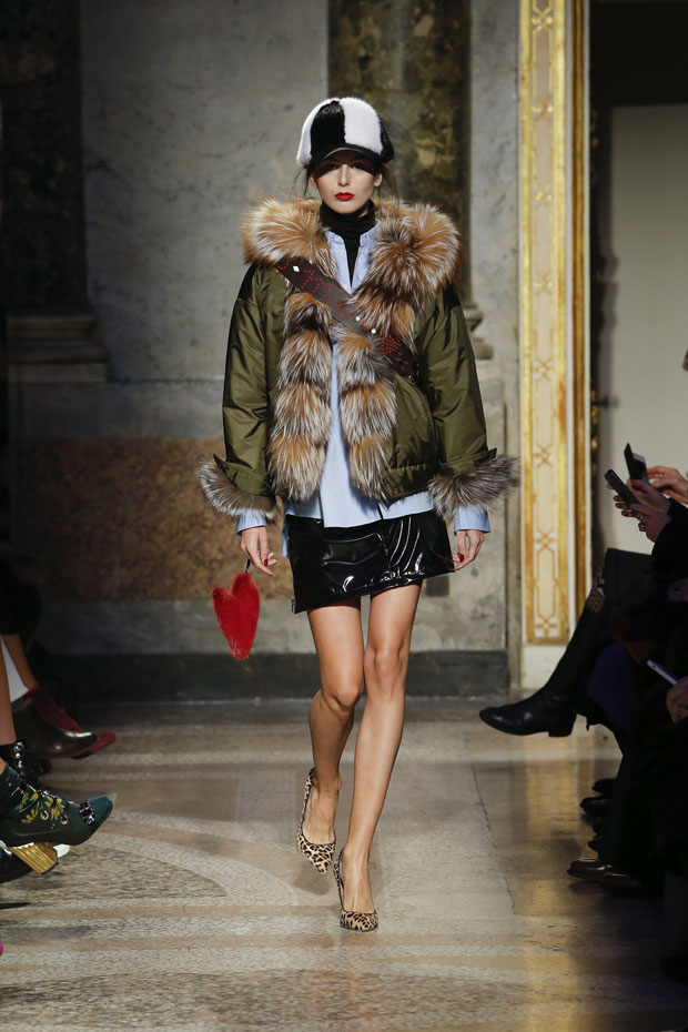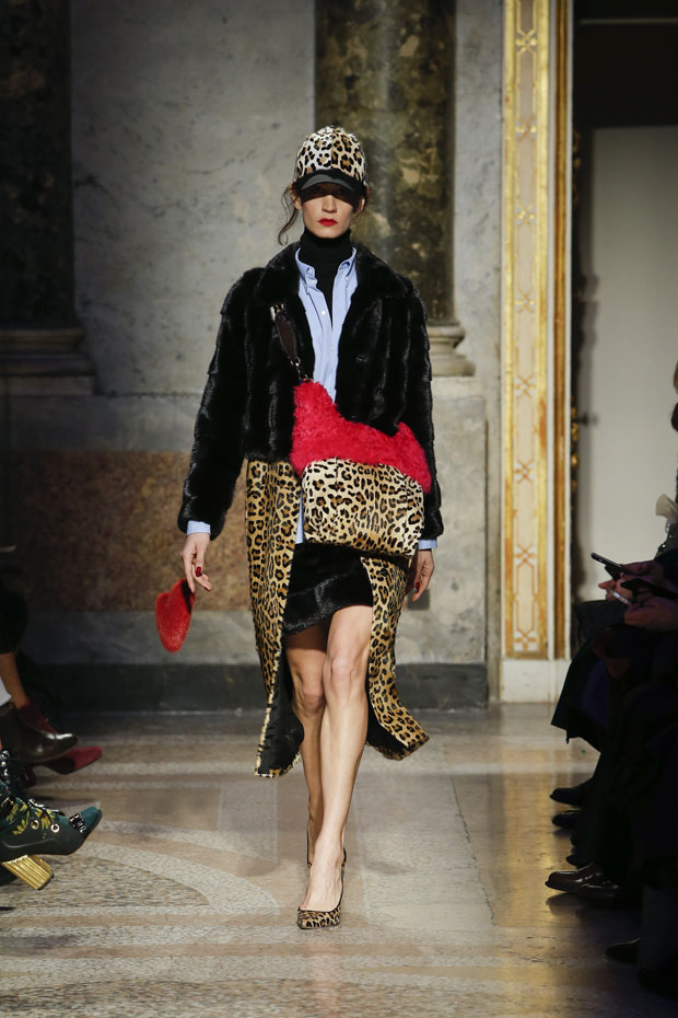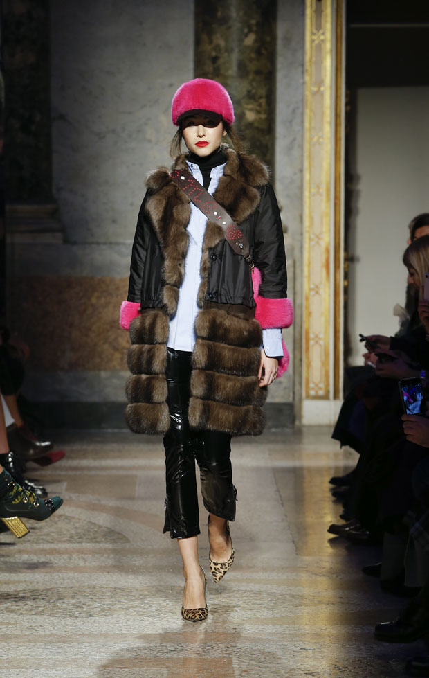 Simonetta Ravizza presented her Fall Winter 2018 collection during the Milan Fashion Week. The collection is built around non conventional mixes – animal prints with sportswear, denim and sable, patent leather and Mongolian fur. Inspired by the ’80s style, the collection features bright, almost fluorescent colors, as well as the mini-skirts and leggings and overlapping volumes.