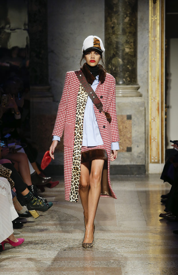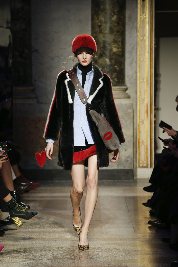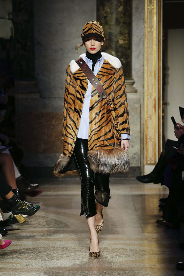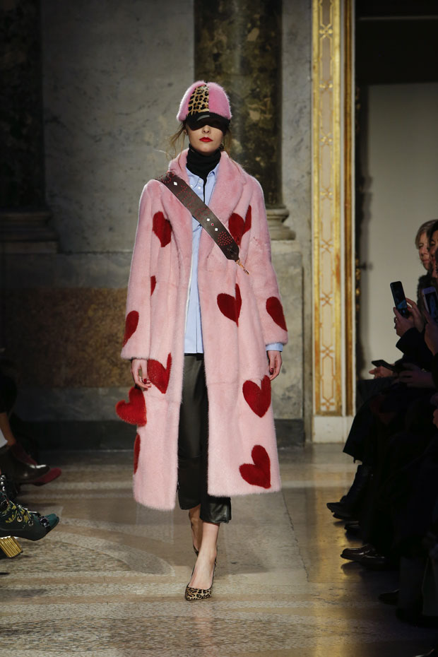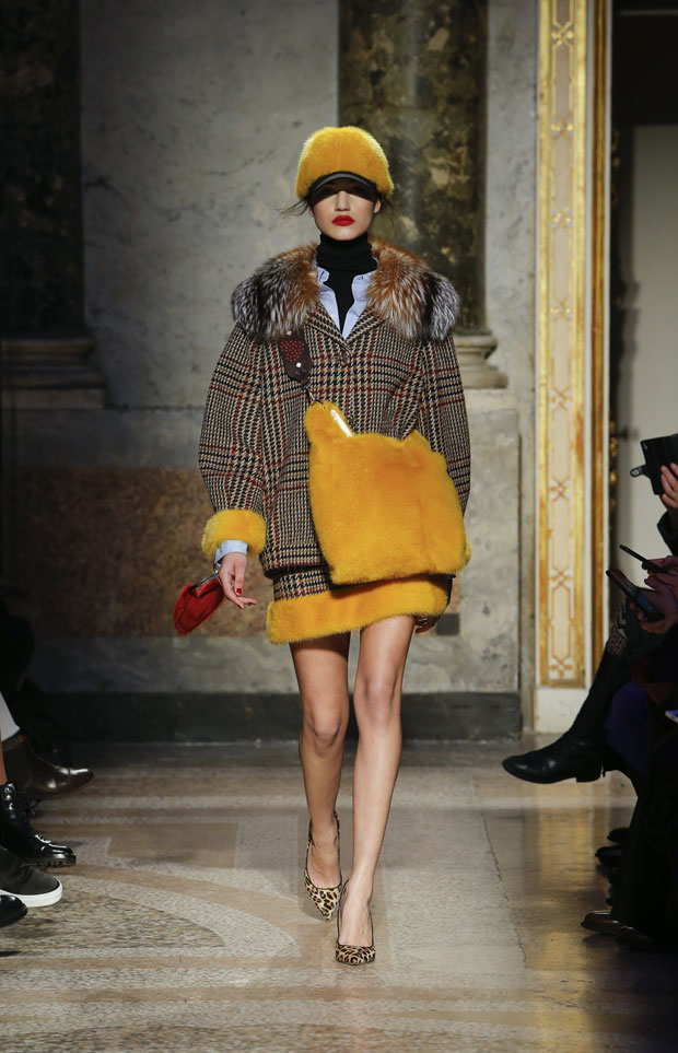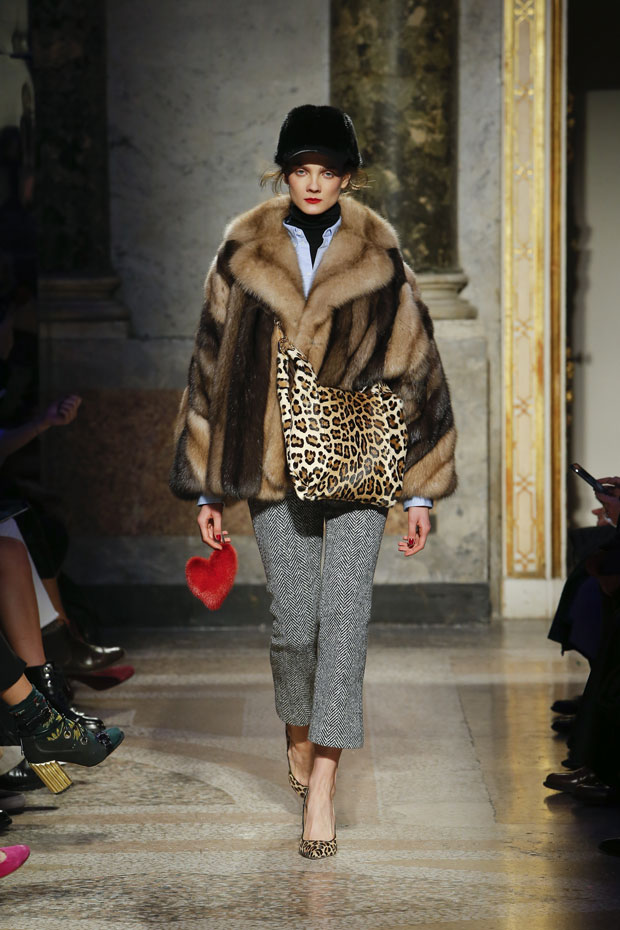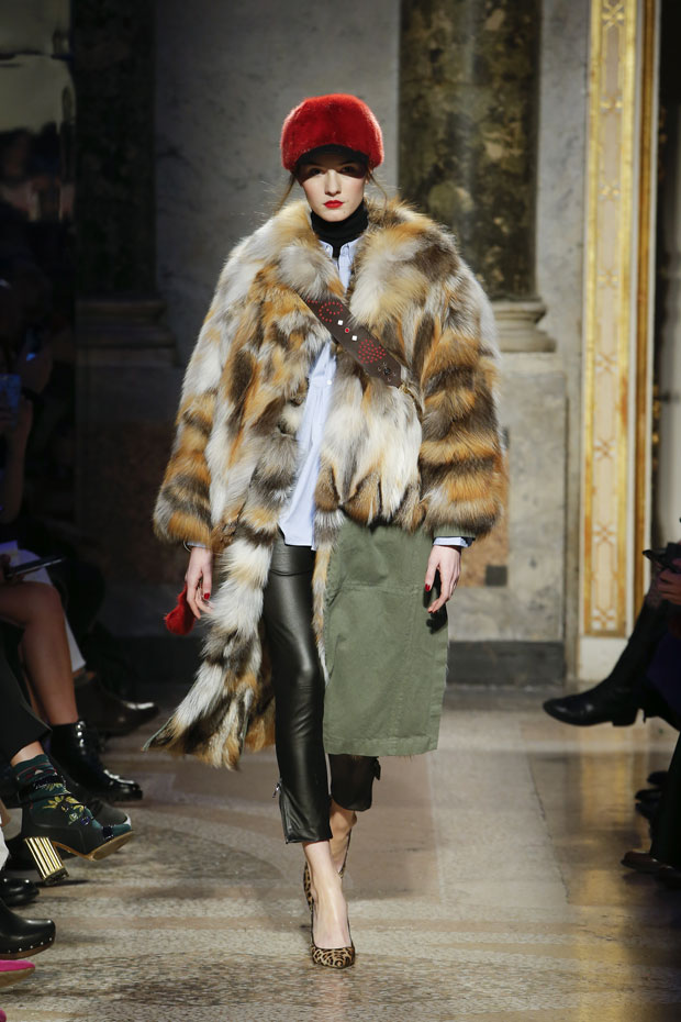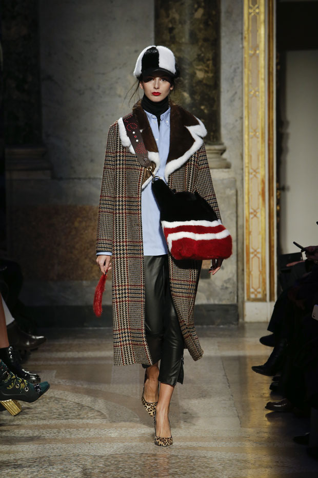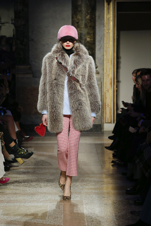 Simonetta Ravizza presented her Fall Winter 2018 collection during the Milan Fashion Week. The collection is built around non conventional mixes – animal prints with sportswear, denim and sable, patent leather and Mongolian fur. Inspired by the ’80s style, the collection features bright, almost fluorescent colors, as well as the mini-skirts and leggings and overlapping volumes.