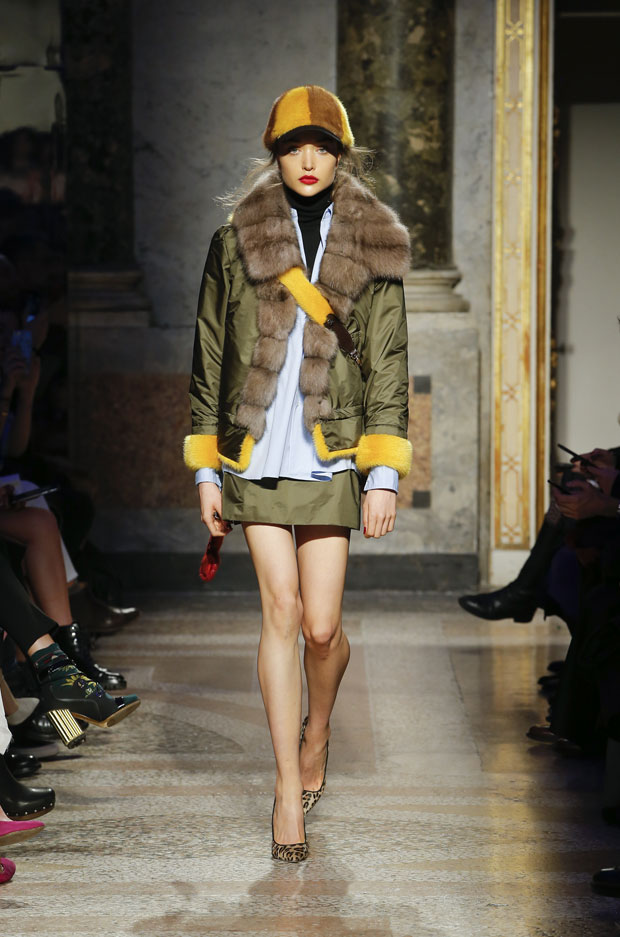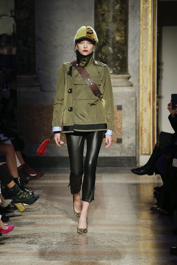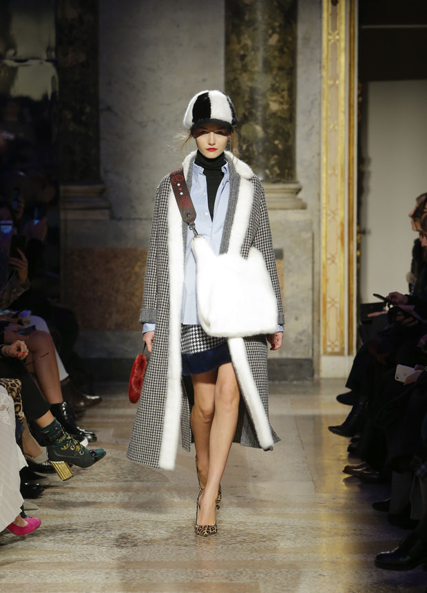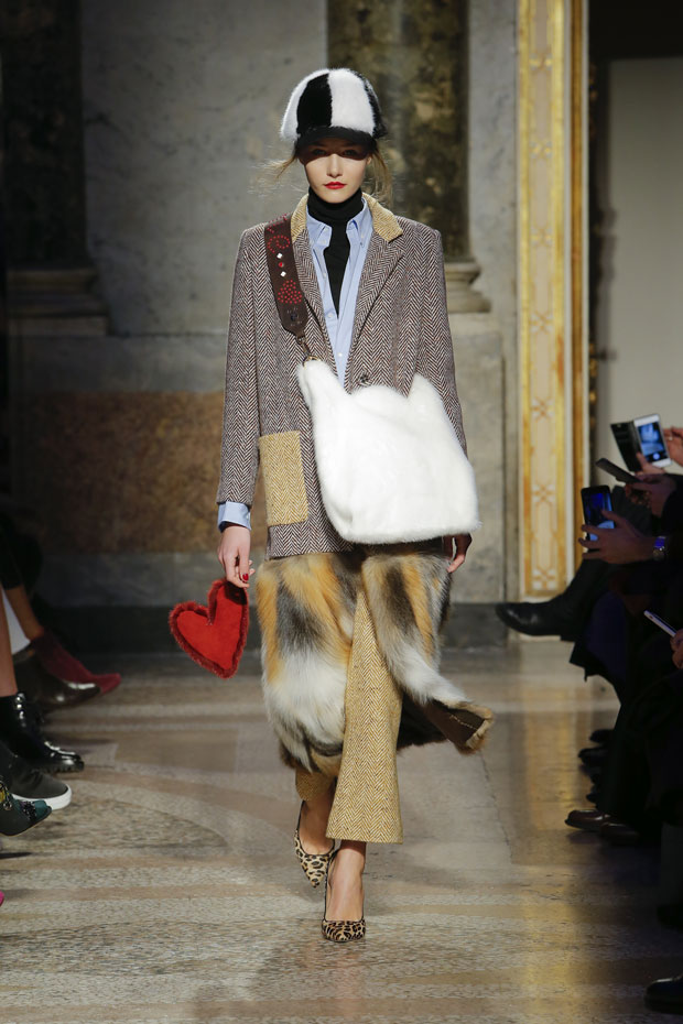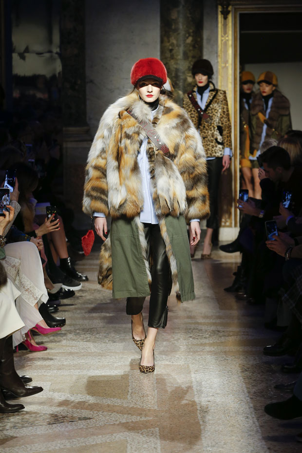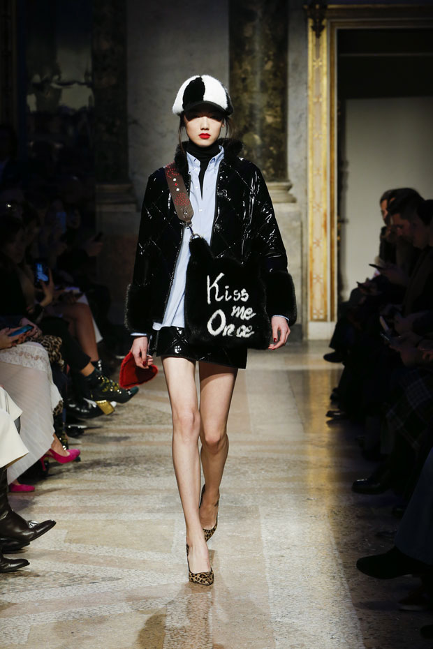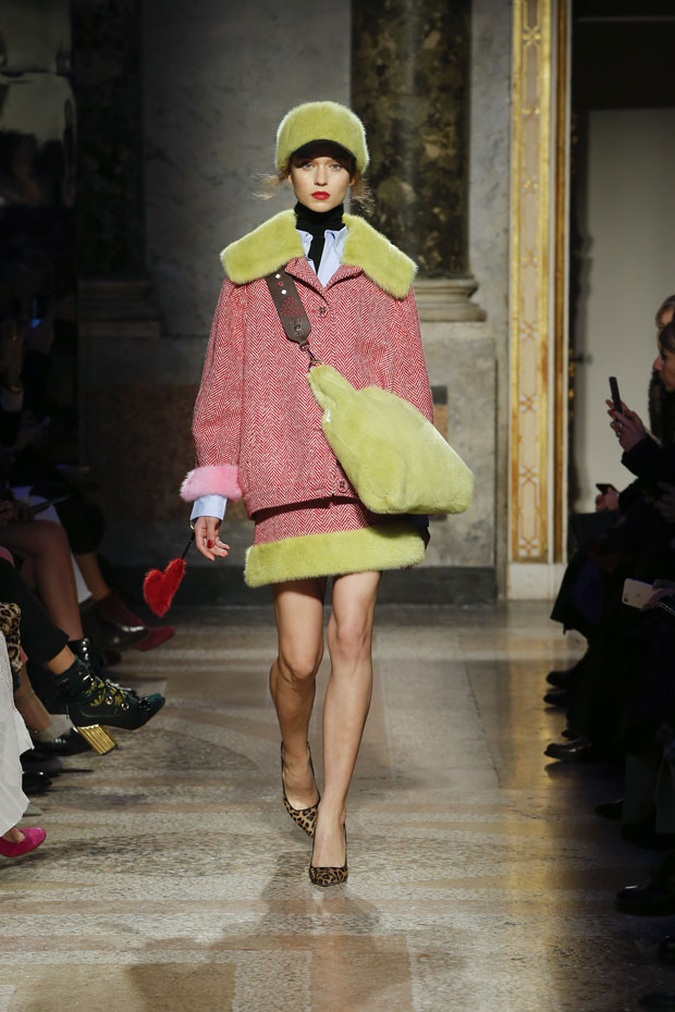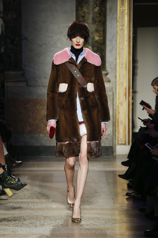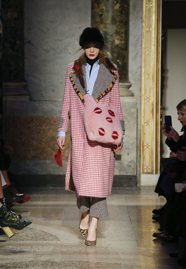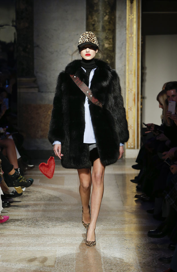Simonetta Ravizza presented her Fall Winter 2018 collection during the Milan Fashion Week. The collection is built around non conventional mixes – animal prints with sportswear, denim and sable, patent leather and Mongolian fur. Inspired by the ’80s style, the collection features bright, almost fluorescent colors, as well as the mini-skirts and leggings and overlapping volumes.