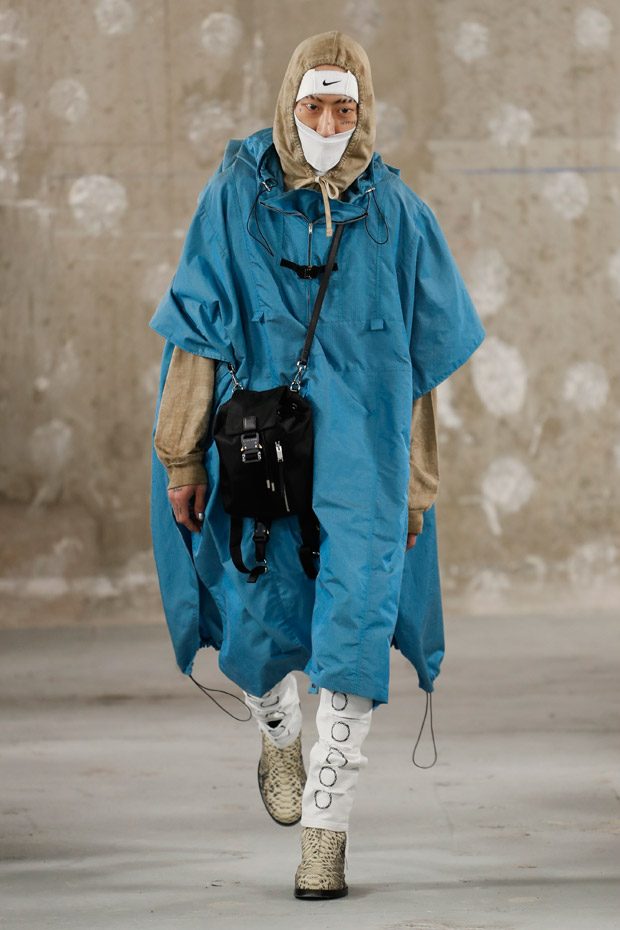 This collection is more than the sum of its parts. It unites advanced textiles and complex technical processes: laser-etched rainwear patterning; Kevlar and leather bonding; sophisticated garment dyes; engineered steel hardware. It reveals the scope of our partnerships: Nike, Vibram, Mackintosh and Majocchi, amongst others. Each component has its role. Together, they form a single proposition for contemporary life united by a spirit of enquiry.“