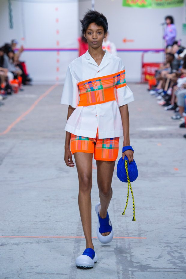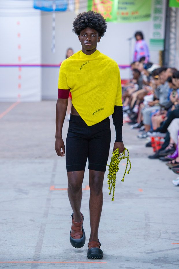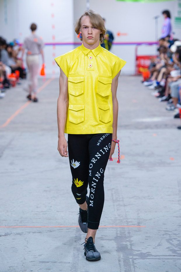 Angus Chiang uses this to create a collage of Taiwan. The SS19 collection attempts to understand each individual’s story whilst viewing a new generation coexisting within an old. Looking at the everyday clothing of Aunts and Uncles at the local community centre, polo shirts, cropped pants and fake two pieces tops are reimagined in fun, youthful concepts. Chiang uses a hemming technique to interpret unruly lines and silhouettes.