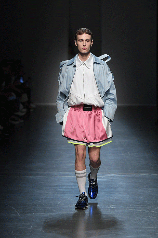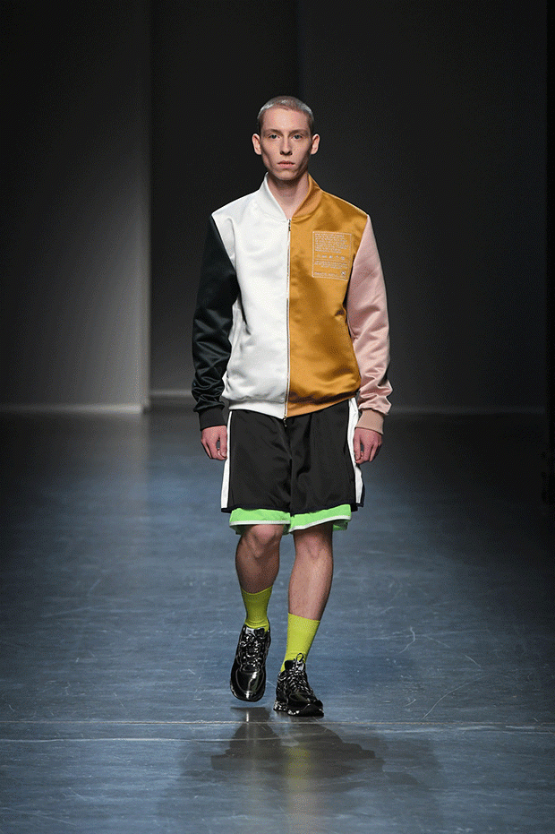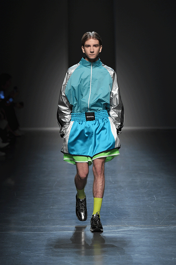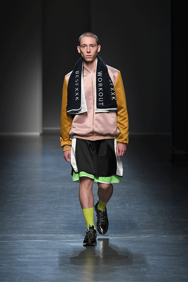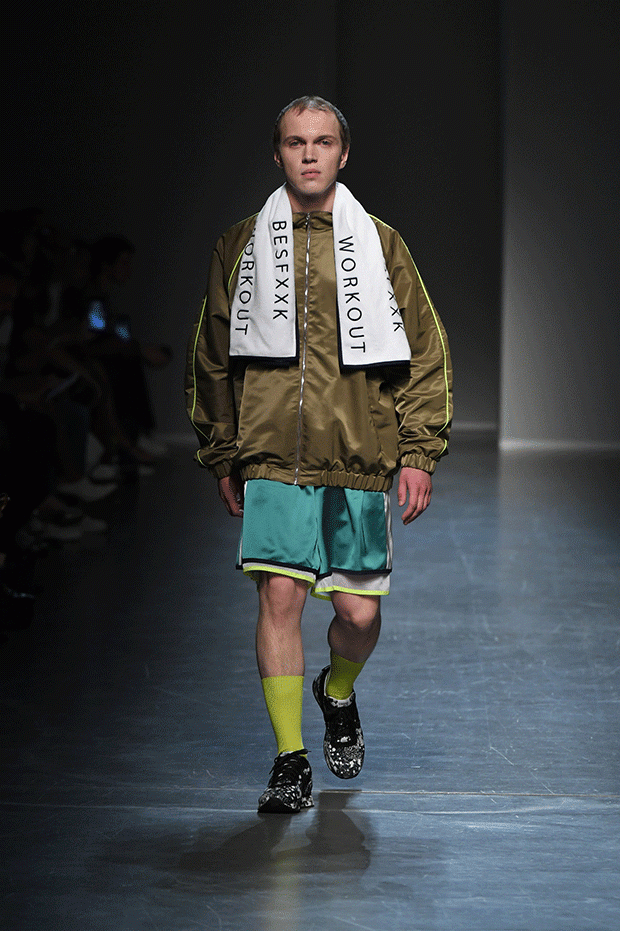 Outfits juxtapose classic garments with a retro spirit that is strong, urban, and sporty. Materials are luxurious and comprise Japanese textiles ranging from gabardine and reflective high-tech fabrics to cotton, starched jersey and special velour textures. Track-inspired jumpers and windbreakers – often perceived as unfashionable pieces – undergo special reinterpretations and take their cue from the style of the Eighties in bright, mesmerizing colors such as neon yellow or silver. The silhouette is essential and inspired by shapes originally designed for mass production and street distribution. The color palette combines neon hues such as yellow and pink with techno silver and shades of wardrobe basics and classic UK staples. Embroidery features the BESFXXK logo. – from BESFXXK