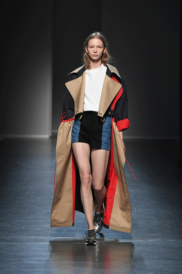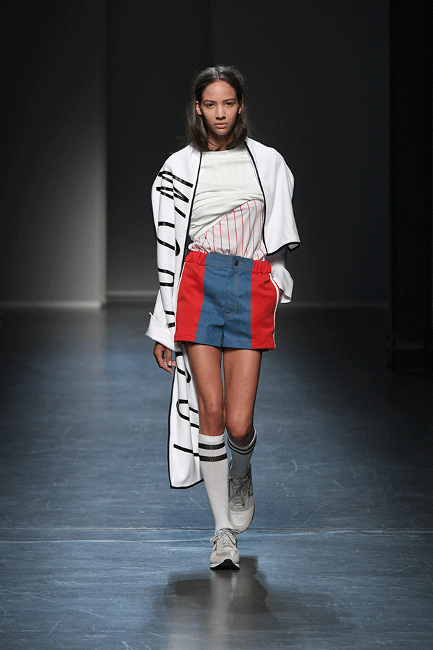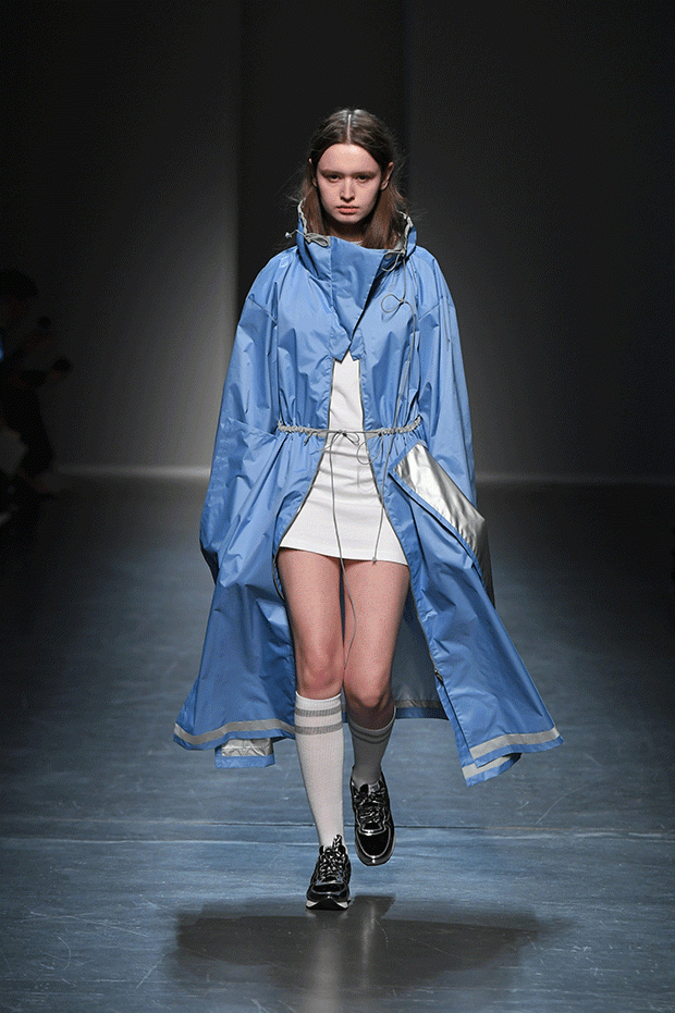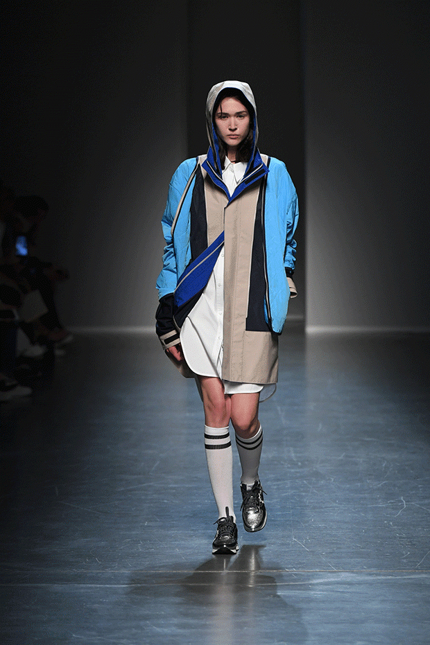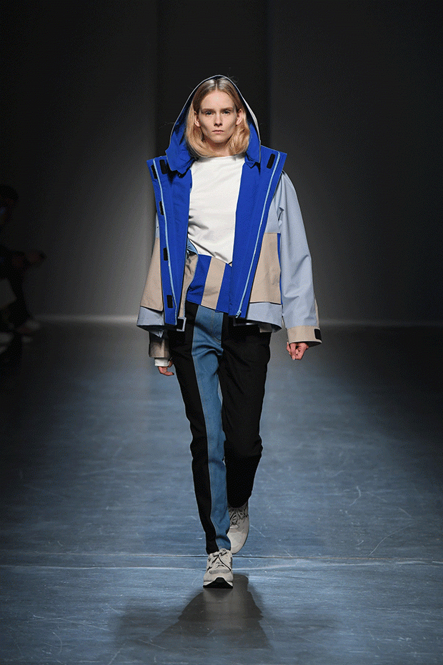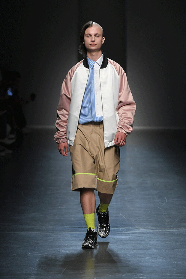 Outfits juxtapose classic garments with a retro spirit that is strong, urban, and sporty. Materials are luxurious and comprise Japanese textiles ranging from gabardine and reflective high-tech fabrics to cotton, starched jersey and special velour textures. Track-inspired jumpers and windbreakers – often perceived as unfashionable pieces – undergo special reinterpretations and take their cue from the style of the Eighties in bright, mesmerizing colors such as neon yellow or silver. The silhouette is essential and inspired by shapes originally designed for mass production and street distribution. The color palette combines neon hues such as yellow and pink with techno silver and shades of wardrobe basics and classic UK staples. Embroidery features the BESFXXK logo. – from BESFXXK