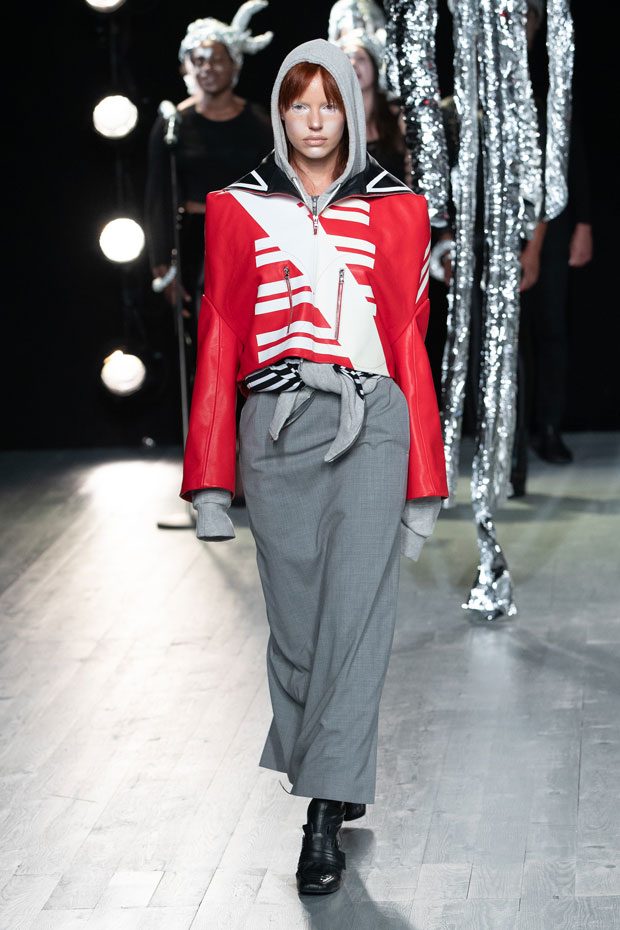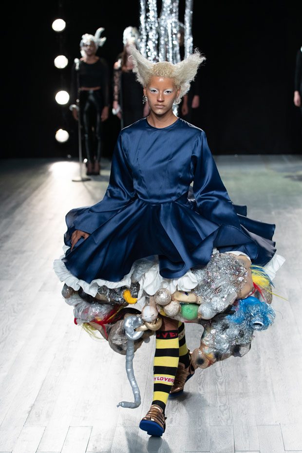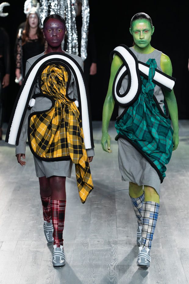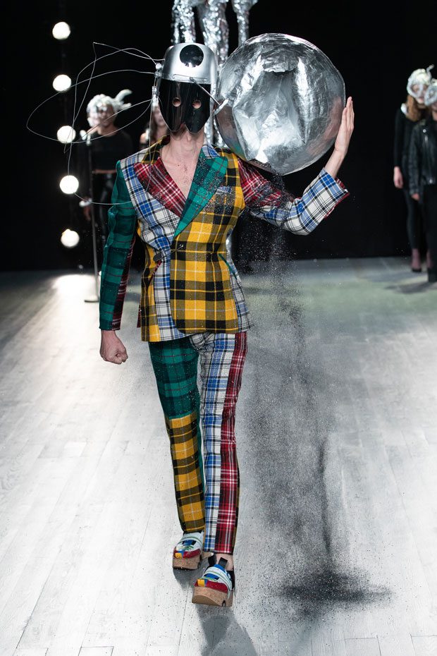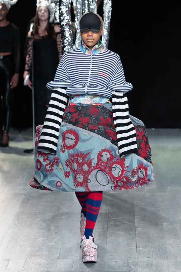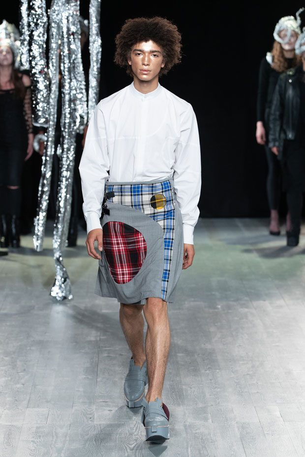 This season LOVERBOY embraces the genderless and the misunderstood through a sensitive, celestial study of bodies: new bodies, changing bodies, accepted and unaccepted bodies. Jeffrey proposes a serene alternative reality, a sci-fi Xanadu of utopic harmony – a post-gender Shangri-La littered with stardust. Why? We live in a decidedly two-dimensional age where surface impressions become our inescapable reality. The body often becomes a site of contestation, if not outright battle — with digital filters, contouring cosmetics and modern-day corsetry exerting wilful control over the unwilling natural body. ‘Emergence’ explores the way we see our unfiltered selves, questioning what compels and repels us, and embracing the insecurities and irrational exaggerations that only we see reflected in the mirror. The label takes on an amorphous new mood. Athleisure – the puritanical antithesis of the hedonistic rage we saw last season – is not traditionally a part of LOVERBOY’s lexicon. But this season, Charles Jeffrey started running. Whilst in previous seasons the designer indulged in the idea of running away, here he runs towards something. Something brighter. Naturally, he runs in a tartan mini-kilt, striped knee-high socks and wood-block shoes. – from Charles Jeffrey LOVERBOY