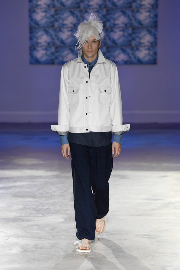 “Using materials like waterproof neoprene and comfortable indigos, the technical performance-wear pieces look conceptual as whole runway looks, but when separated, act as highly functional everyday garments. The sum of elements is made evident through the mix of materials that highlight the construction, with duality of pieces being worn and carried as accessories slung with rubber straps.