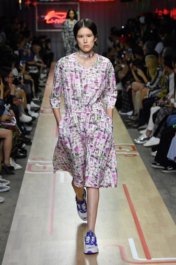 Against a soundtrack of conceptual electronica, 49 looks—36 men’s, 13 women’s— were presented, evoking a contemporary street scene. Single-sleeve sweatshirts paired with voluminous pleated trousers are cinched with extra-long webbed belts. Dolman-sleeve track tops and drop-shoulder jackets are patchworked from multiple colors and fabrics to heighten a sense of contrast and texture. Khaki coats and parkas are pinned with slogan cards and tied with logoed belts. Graphics tell the season’s narrative in colorful gymnastic silhouettes and energetic abstract patterns that suggest movement and progression. Colorful all-over prints cover silken men’s button-down shirts and women’s smock dresses. Finally, nodding to the future’s potential, two crisp white pajama tops, courtesy of Berlin-based fashion label Random Identities, are embroidered in Chinese characters. One says “China Li-Ning” and the other “Random Identities.”“