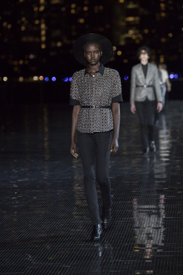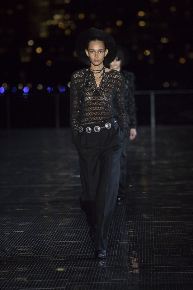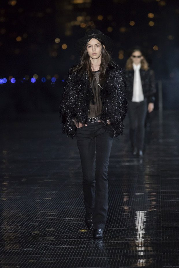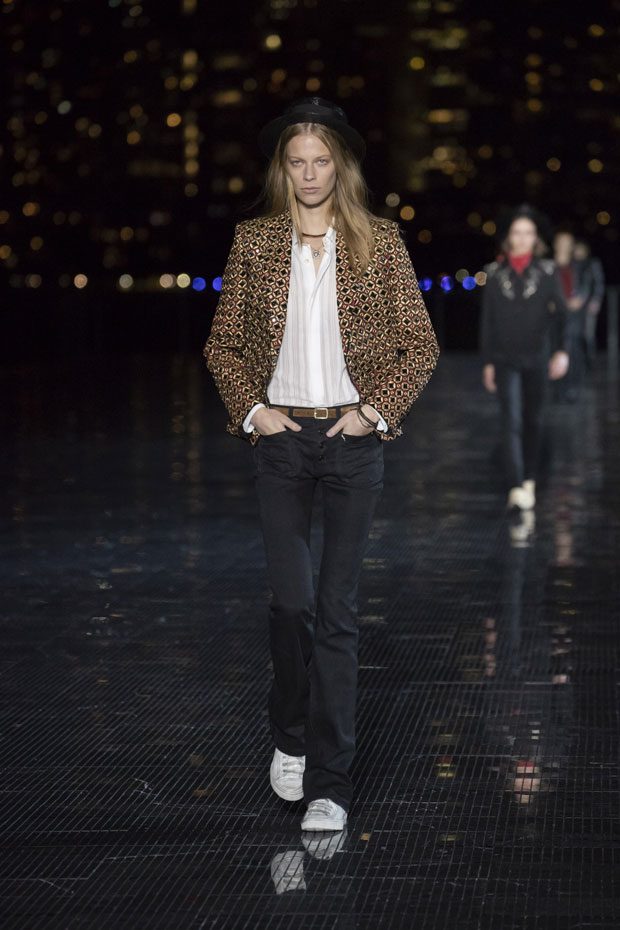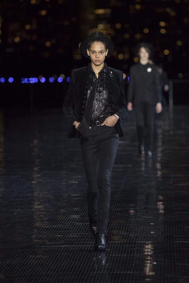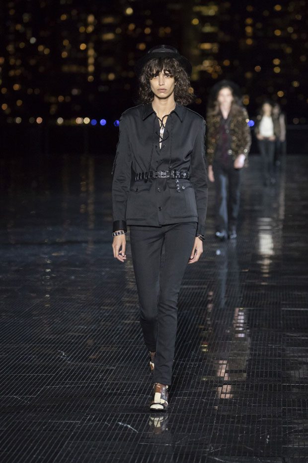 For Spring-Summer 2019, Anthony Vaccarello envisioned an urban macadam cowboy. A seventies spirit evoked by short jackets paired with high-waisted trousers. The iconic saharienne deeply explored and reinterpreted. Intricate embroideries and refined textures emphasize the sharp attitude of the collection. Facing Manhattan, the impressive open scaffoldings complete with a marble floor seem to be in conversation with the iconic New York skyline. – from Saint Laurent