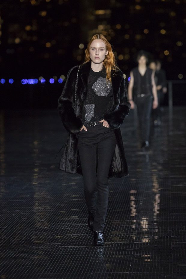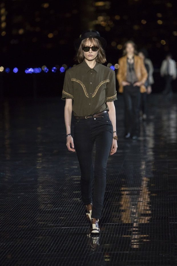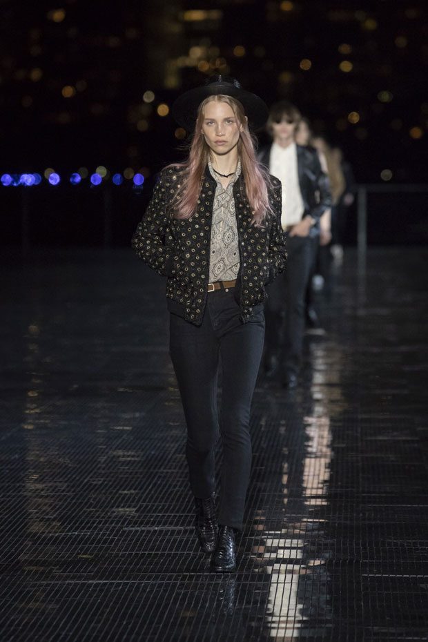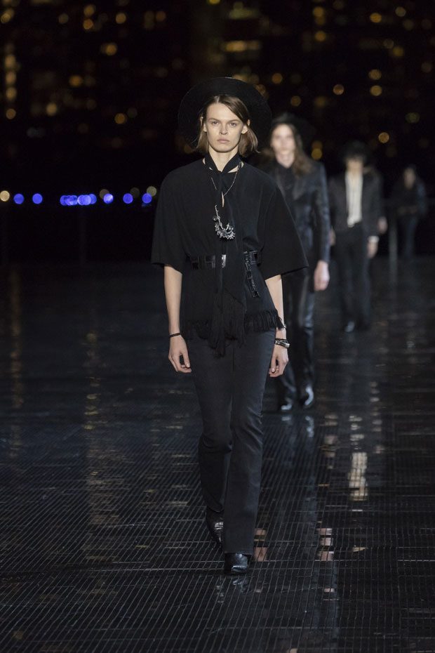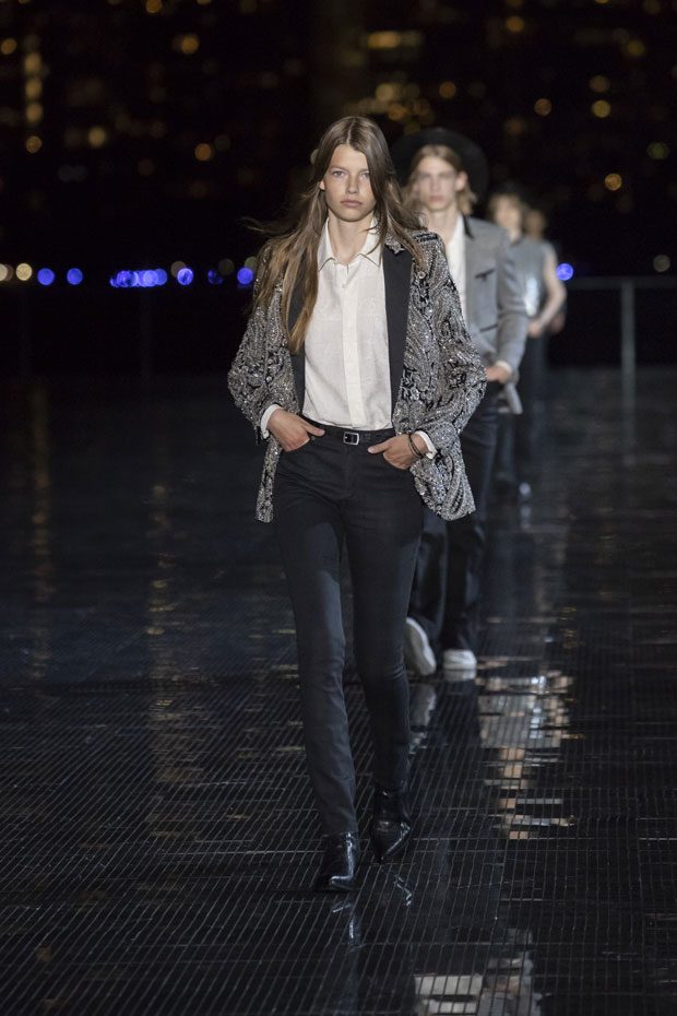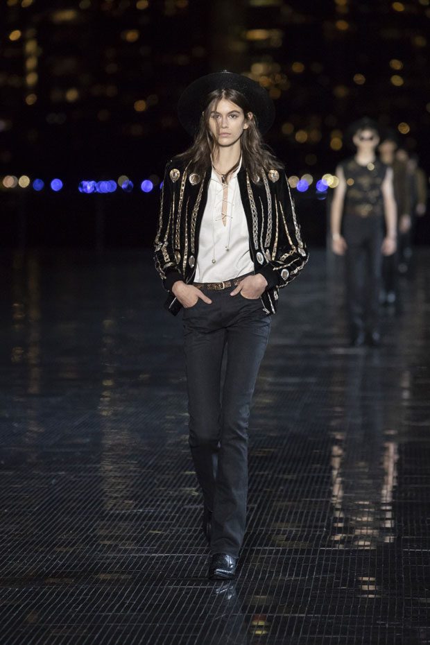 For Spring-Summer 2019, Anthony Vaccarello envisioned an urban macadam cowboy. A seventies spirit evoked by short jackets paired with high-waisted trousers. The iconic saharienne deeply explored and reinterpreted. Intricate embroideries and refined textures emphasize the sharp attitude of the collection. Facing Manhattan, the impressive open scaffoldings complete with a marble floor seem to be in conversation with the iconic New York skyline. – from Saint Laurent