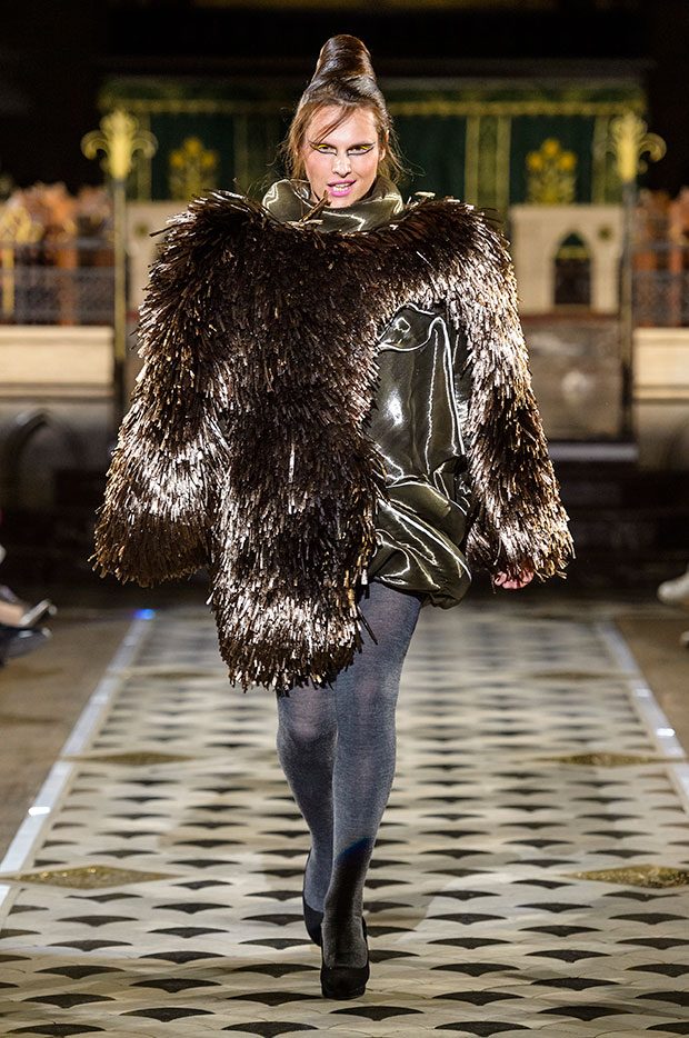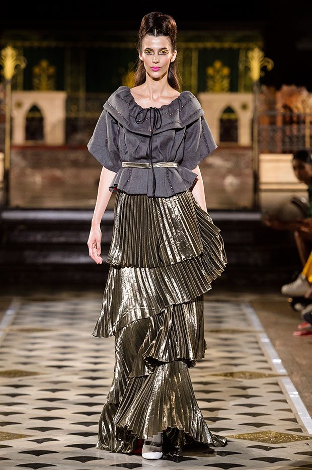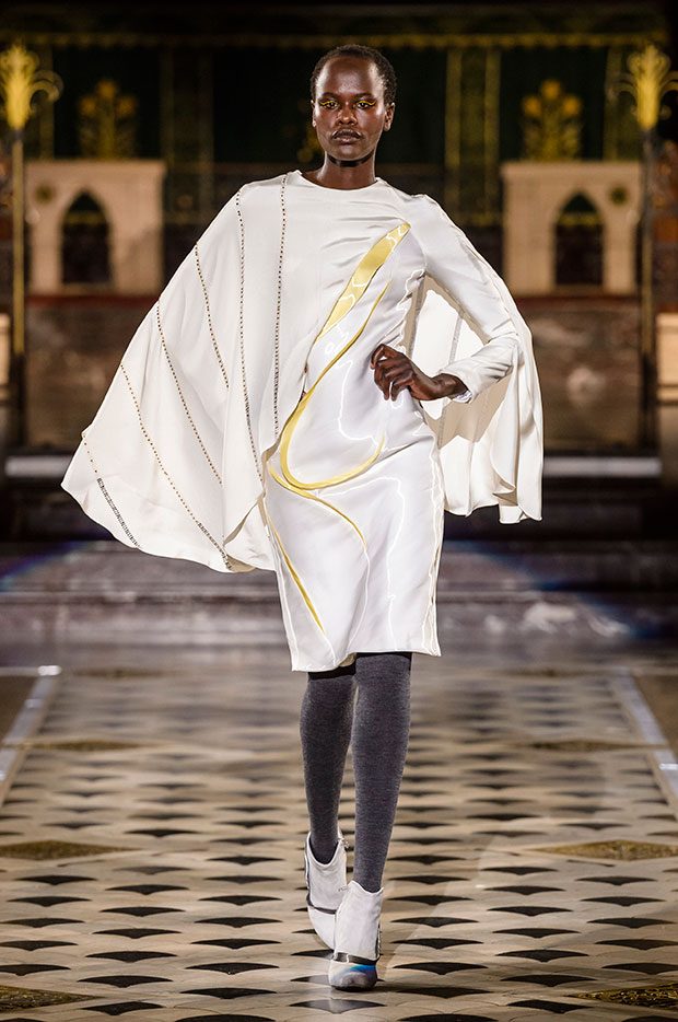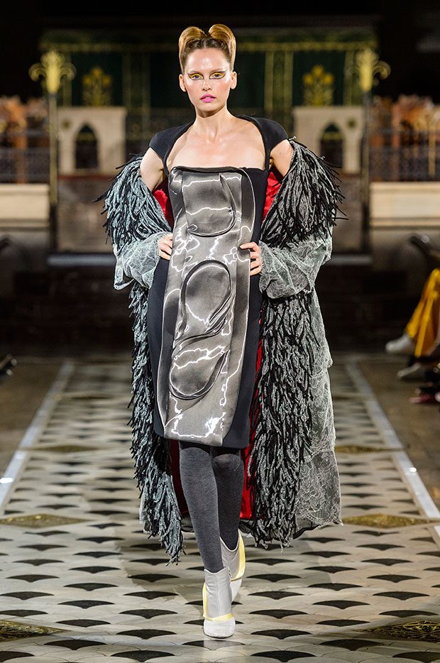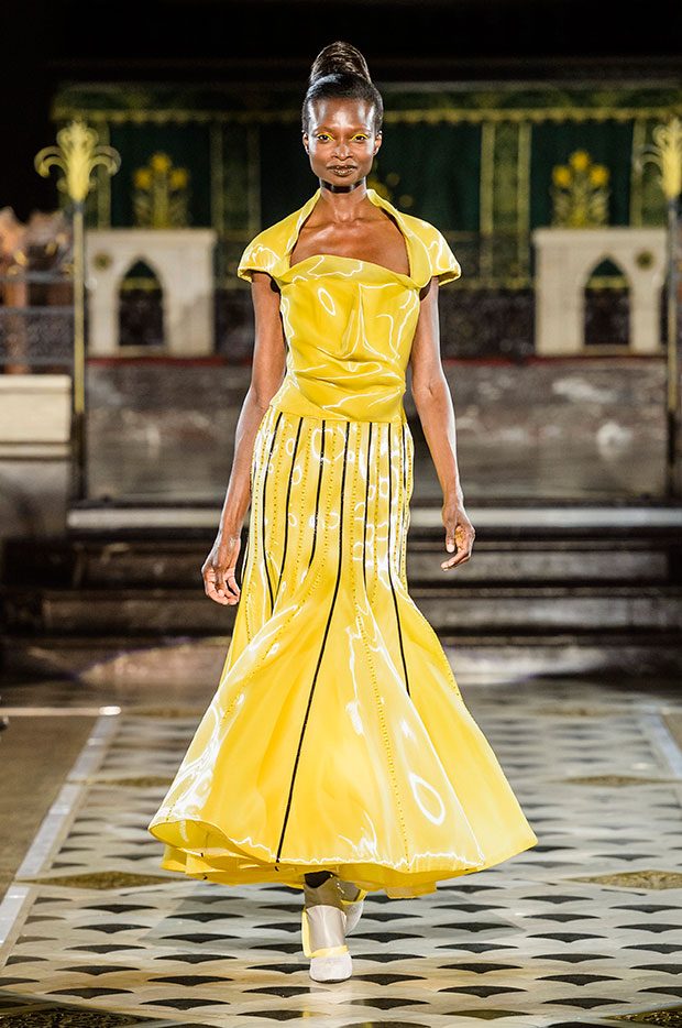 These modern silhouettes are carved in silk, tulle, or styled with several kilometres of raffia. Certain fabrics such as lurex flow like liquid metal. Even wool and cashmere, more traditional materials, play unusual roles. Raw cement embraces the reflection of a mirror, a nod to a cityscape populated by glass and steel towers. A rigid garment, inspired by a rectilinear building, juxtaposes a curved madness, reminiscent of a work of Antoni Gaudi. The different fabrics are superimposed to create a hybrid garment, resolutely modern and cosmopolitan. Extreme contrasts, characteristic of the Antonio Ortega’s work, are definitely back in this new collection. In the imagination of the Mexican-Canadian designer, a city is not solely composed of architectural creations. The urban landscape, far from being cold and impersonal, is also populated by human faces and the breath of life. And in the spirit of Art Nouveau, the woman and her image are omnipresent. In this collection, Antonio Ortega expresses his vision of Art Nouveau: a freedom and diversity he feels throughout the great eclectic and avant-garde cities of the Americas and Europe. – from Antonio Ortega