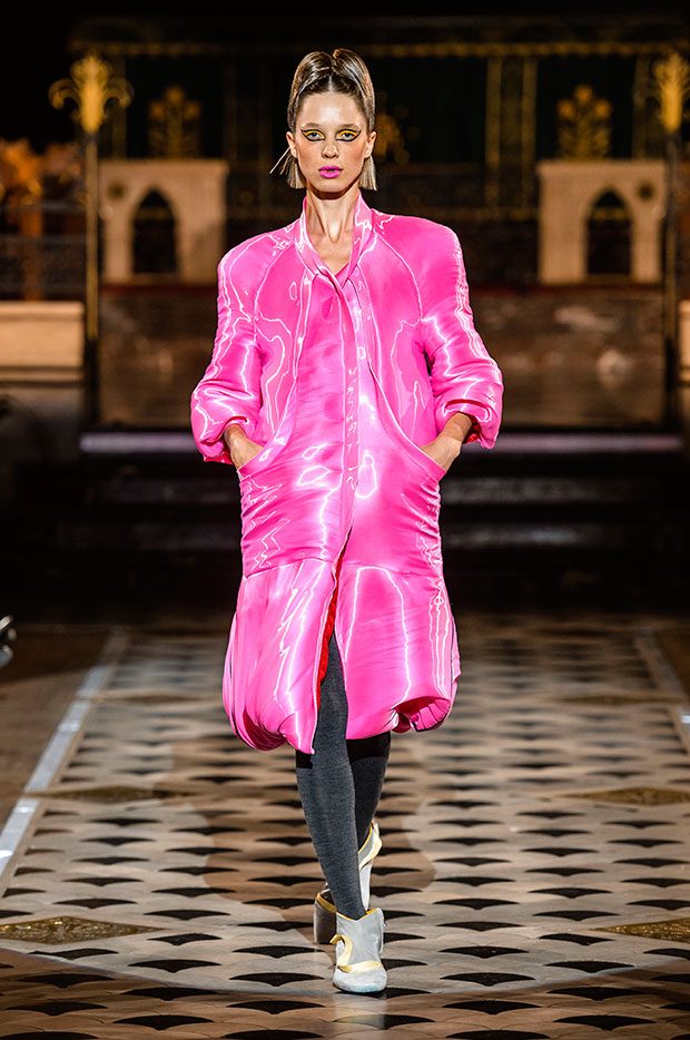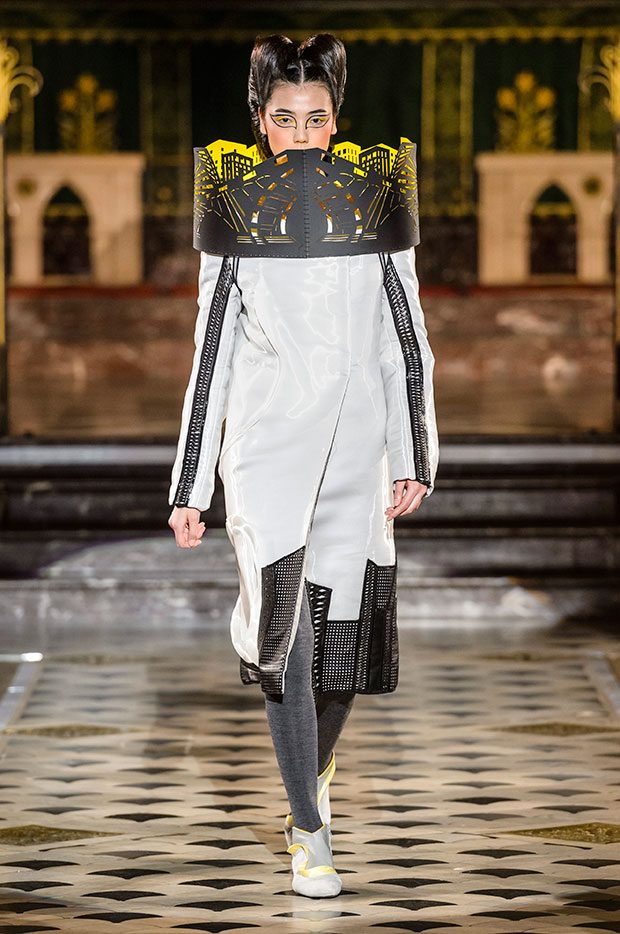 Discover Antonio Ortega‘s Fall Winter 2018.19 Couture collection presented, during the ongoing Paris Fashion Week Haute Couture. The collection was inspired by the sinuous curves and straight lines of the city, as well as the extravagant forms of Art Nouveau which give the way to a futuristic urban landscape.