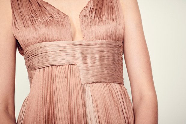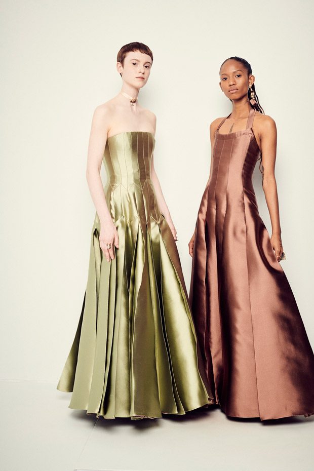 “The powdery palette (brick, green, pink and orange), interacting with nude, colors the clothes but also the accessories – refined costume jewelry, veil and hats – in a complementary continuity of the body on which couture places the emphasis. Evening dresses, rendered dazzling by their mix of pleating and layering, contrast with simple bustiers which offer a surprising dissonance. The sculptural form of a red silk dress sewn from a single piece of fabric opens the way to a series of majestic and intimate creations, both restrained and explosive: couture, in the process, becoming a psychological place of female resistance.