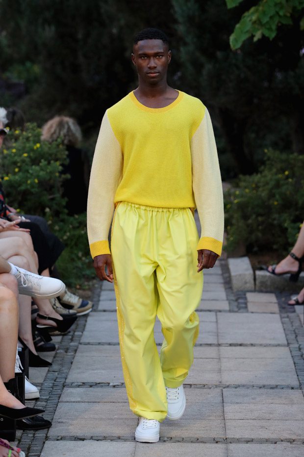 In addition to that rainbow topic, his range of colours is a multifarious one: it consists bright, refreshing colours, such as orchid, eye- popping scarlet, sunny yellow, purple, salmon, tangerine and sky blue. In addition to those vibrant nuances, sundry rather restrained, timeless tones can be noticed, such as creme and night black. Some outfits are kept tonal, whereas in others many various colours are harmoniously sparkling and shining together. Simply smooth!