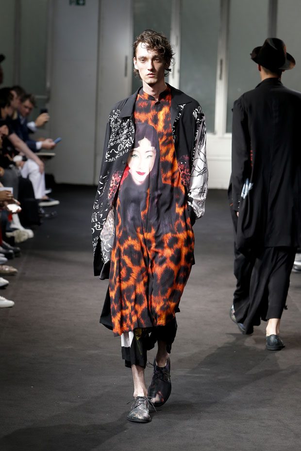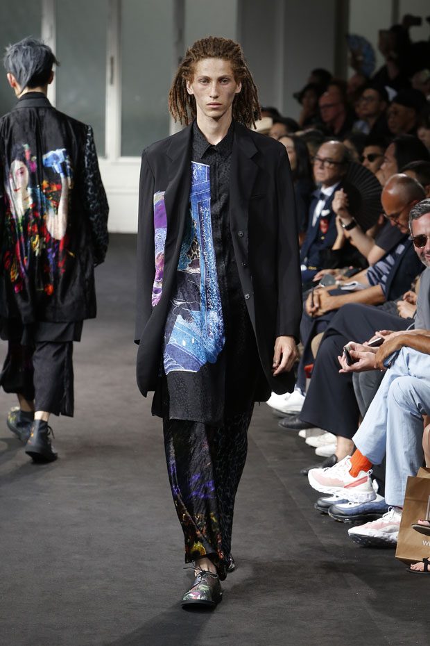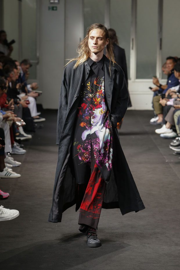 Discover Yohji Yamamoto‘s Spring Summer 2019 menswear collection presented on Thursday June 21st, during the recently finished Paris Fashion Week. Balancing the tailoring and relaxed silhouettes, the collection mixes traditional Japanese art with florals, animal prints with colored leather, once again proving Yamamoto’s impeccable technical skills.