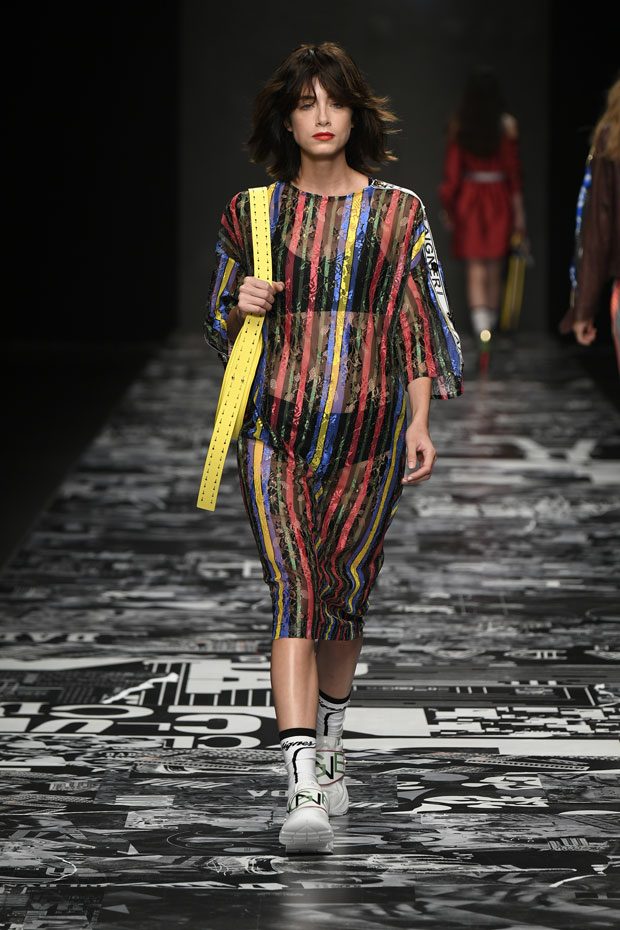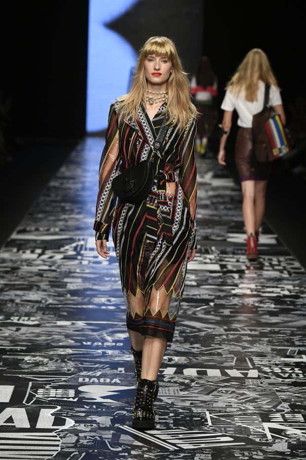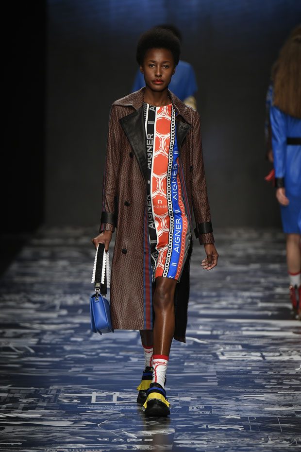 German traditional brand AIGNER presented its Spring/ Summer 2019 collection during Milan Fashion Week. This bold, energetic, vibrant collection can be understood as a rebellion against conventions: for this theme, the brands’ creative director Christian Beck, took his inspiration from dadaism: this literary- and art movement, that was active at the begining of the 20th century, focused on breaking norms and searching for a new sense of life. In this collection, elements that are clearly inspired by dadaism are cleverly paired with AIGNER’s signature style. Thus, the Munich- based brand stays true to its values but adds a bunch of refreshing, innovative approaches. Clean designs are eased by a eye- popping, colourful pattern choice, furthermore exquisite