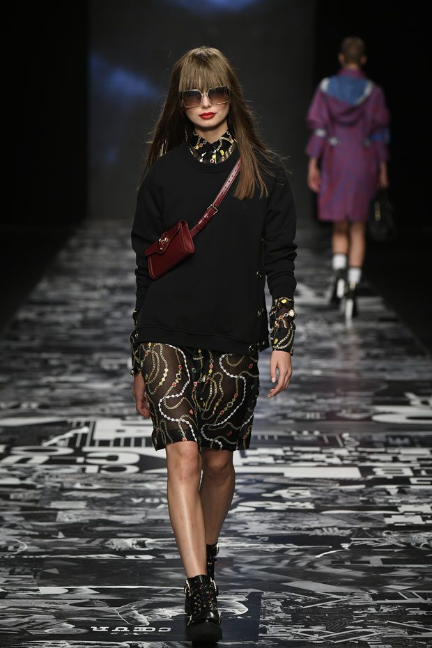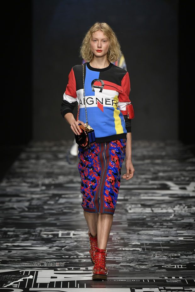 What first of all caught our attention were the colourful AIGNER logo-interpretations: they can be found in various bags, leather pieces and accessoires of this collection. AIGNER’s affinity to leather is lifted to another level, or, to say it more precisely, leather is repeatedly used: for instance in a plenty of coats, jackets, skirts, sweater and pants of this collection. Inspired by the collections’ theme “DADA”, the multifarious prints and the sporty block letters make those pieces true eye- catchers.