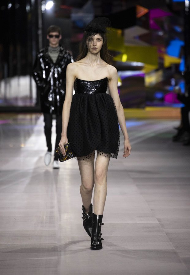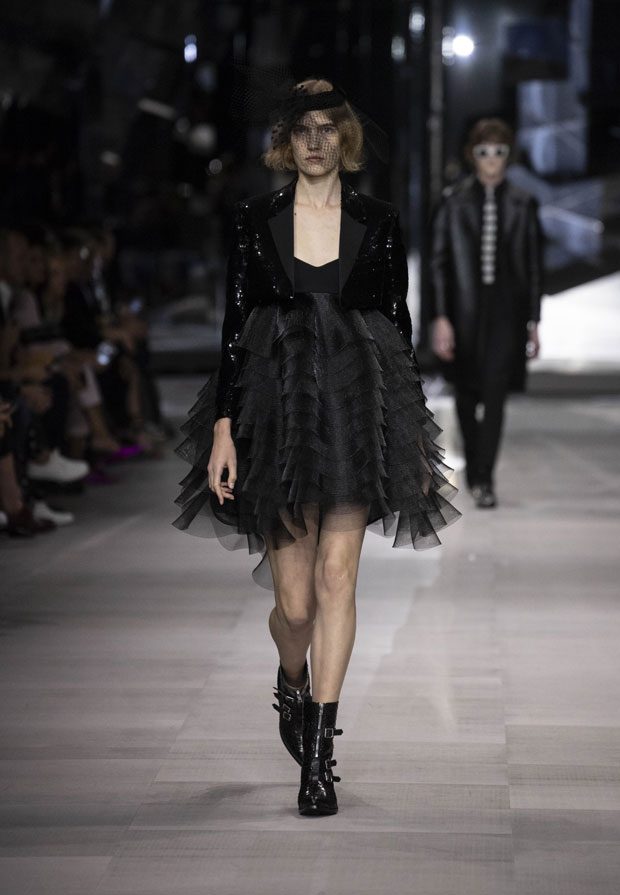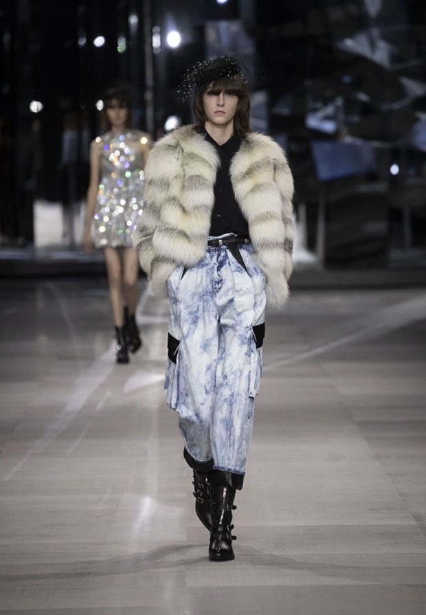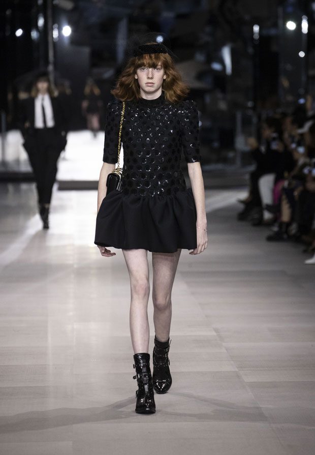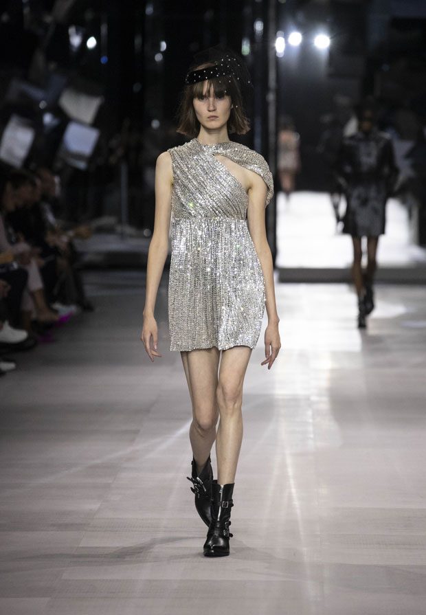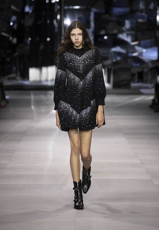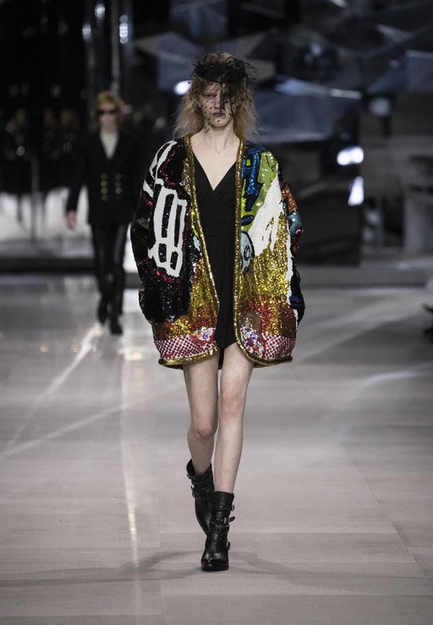 For the collection Slimane collaborated with artist Christian Marclay who was in charge of the prints as well as embroidery on the couture pieces coming from Atelier Celine. The music is still integral part of Slimane’s new era as well, for the soundtrack he enlists Marlon Magnée, Sacha Got and model and muse of the designer Grace Hartzel.