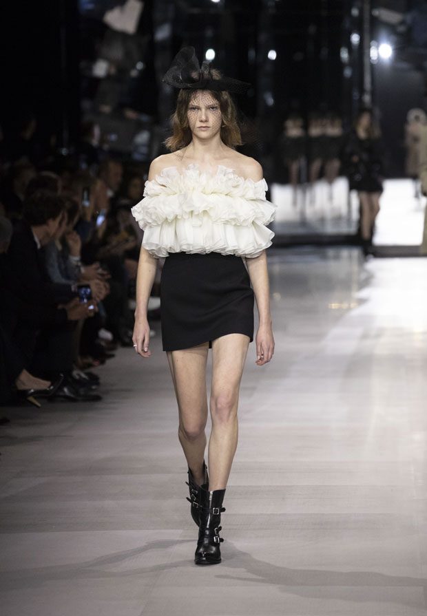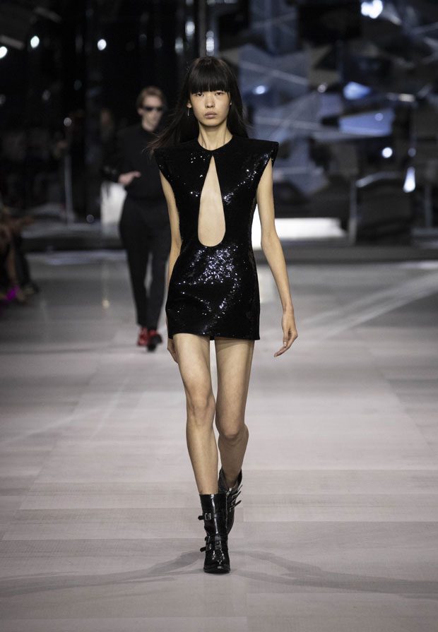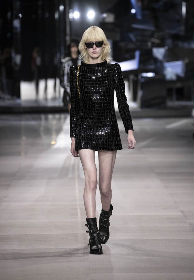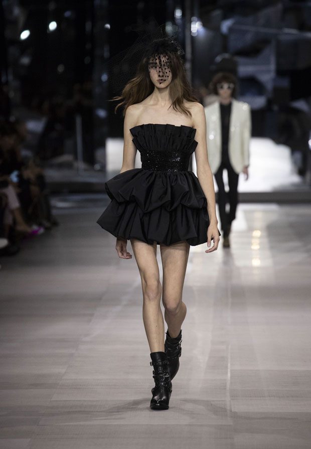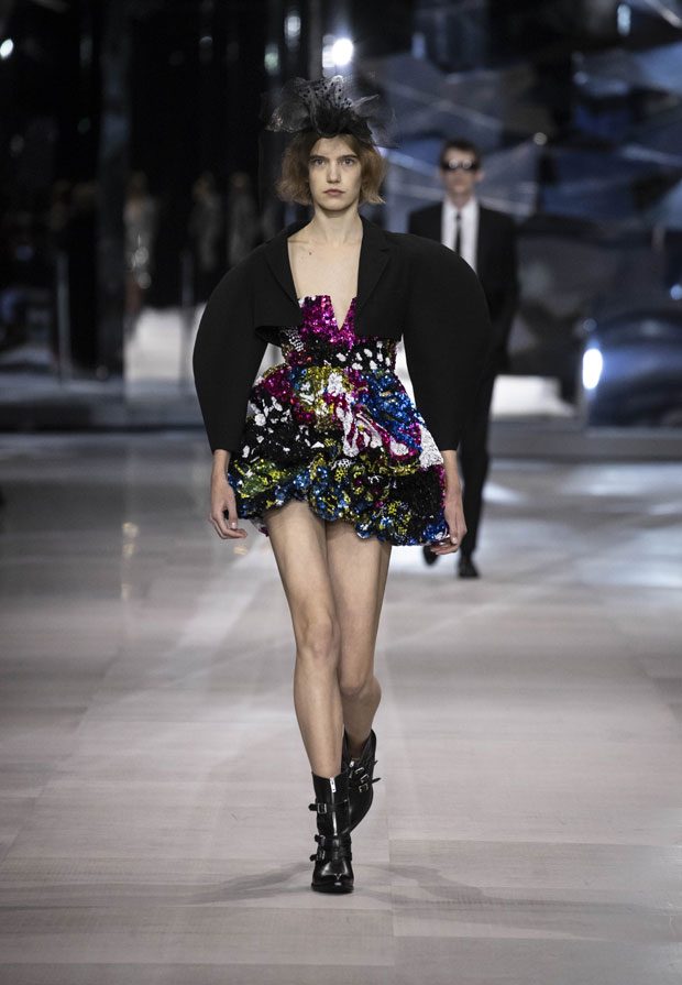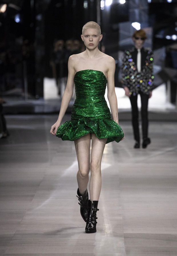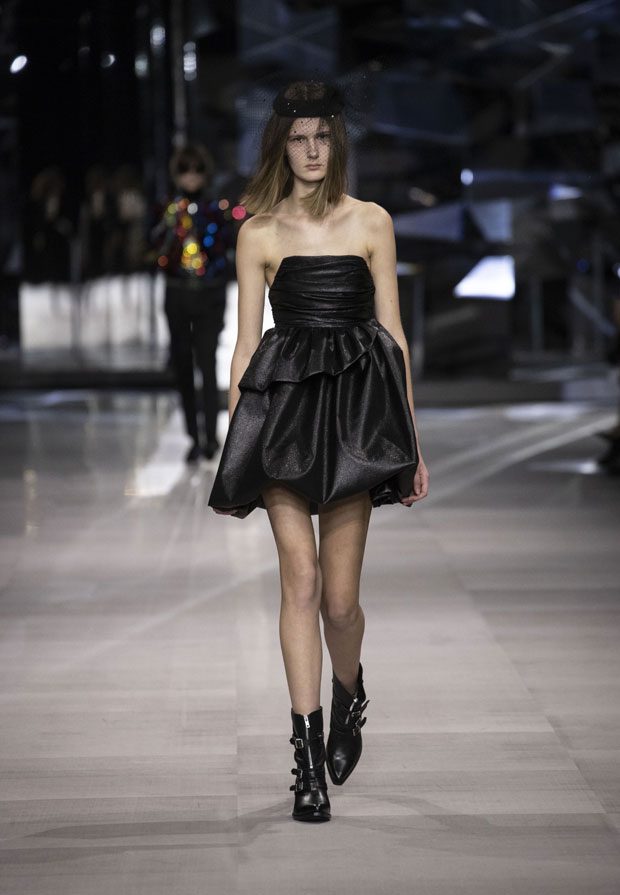 For the collection Slimane collaborated with artist Christian Marclay who was in charge of the prints as well as embroidery on the couture pieces coming from Atelier Celine. The music is still integral part of Slimane’s new era as well, for the soundtrack he enlists Marlon Magnée, Sacha Got and model and muse of the designer Grace Hartzel.