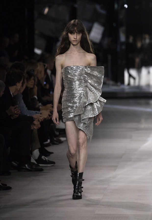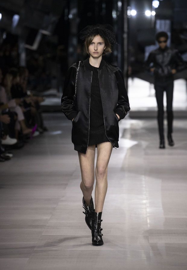 The first collection by Hedi Slimane for CELINE was no doubt to take a firestorm of criticism, with the designer bringing his own aesthetic to the well established Parisian brand. The first collection presented in Paris during the ongoing Paris Fashion Week was non seasonal. The collection entitled “Journal Nocturne de la Jeunesse Parisienne” explored Slimane’s signature vision of a young Parisian infused with a sentiment of synth-pop. In addition to acquiring the new designer, the revamped fashion house is for the first time taking on a challenge of designing menswear. However all of the menswear pieces in the 96 look collection are considered unisex and available in smaller sizes as well. The runway cast mostly featured new faces who for the first time walk a show of this scale.