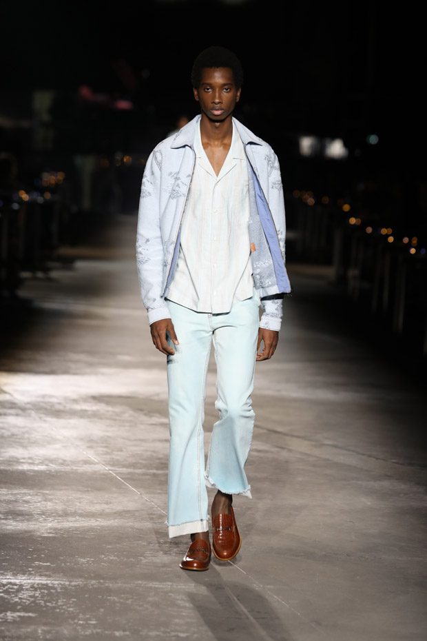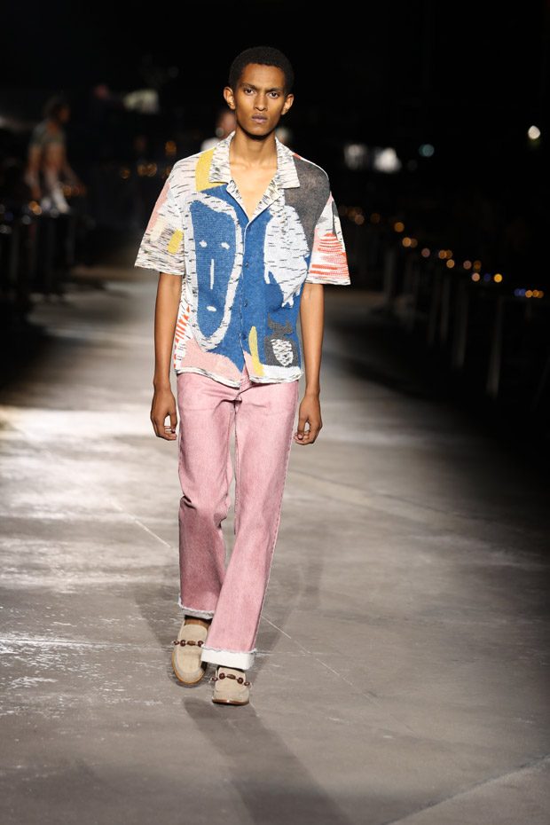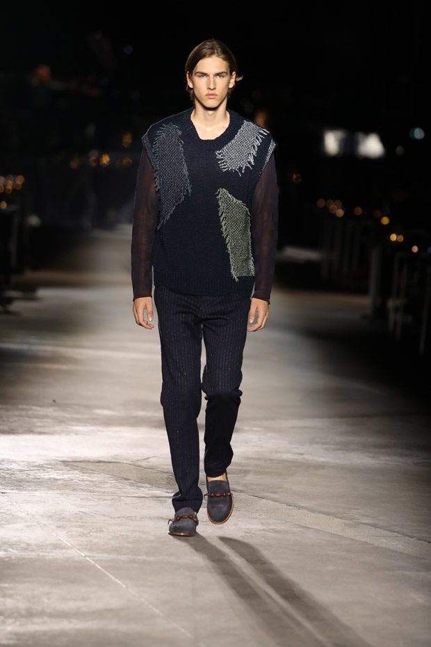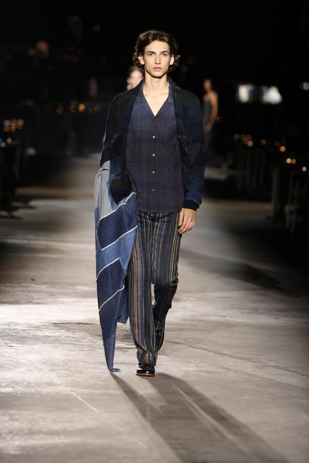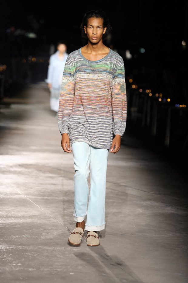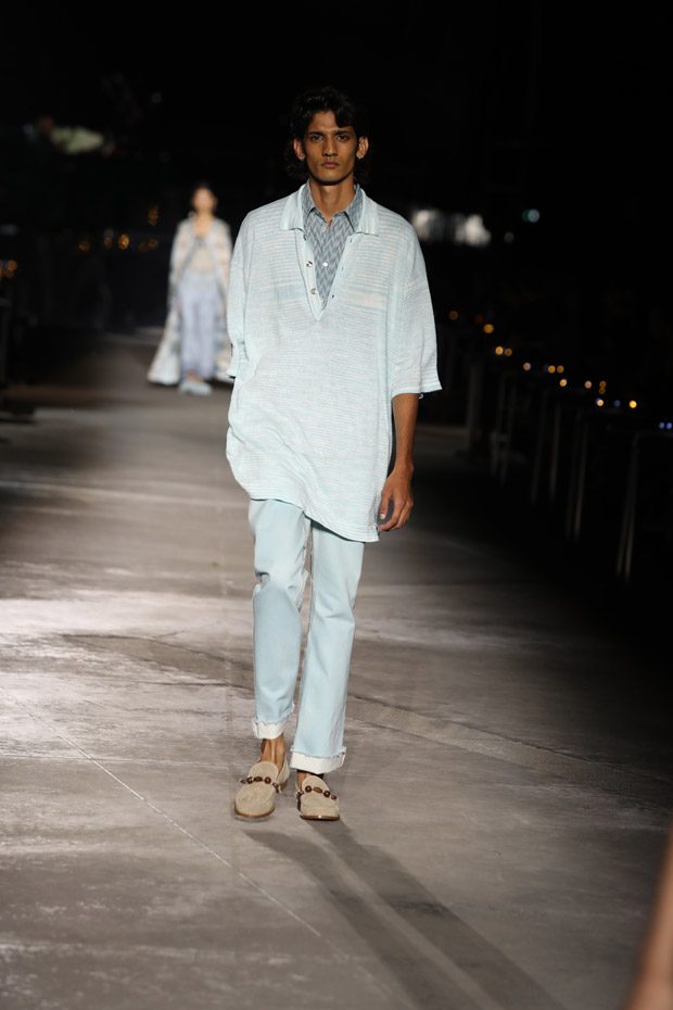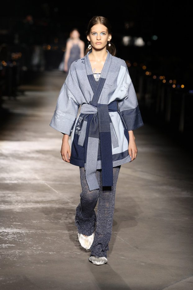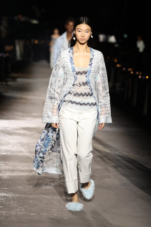 “Encounters, in another place and another time. The ancestral in fast-forward, and the other way round. A primal story of gossamer textures, airy volumes and craft. Primeval as the urge to wrap and cover up. Primary as the touch of the human hand. Geo-cultural connections in the atmosphere. A crossing of worlds as a crossing of textures. Opposites that merge and flow, liquefying one into the other. An effortless wardrobe of gauzy dresses, long cardigans, knitted denim, liquid trousers, long t-shirt, kimono coats mixed and matched in effortless ways, bridging civilizations in borderless layerings.
