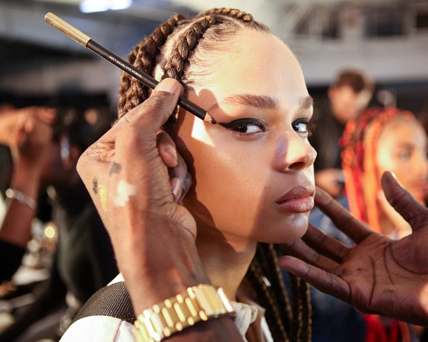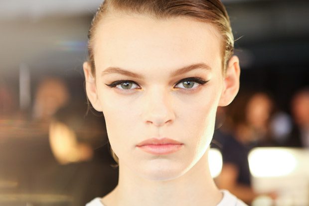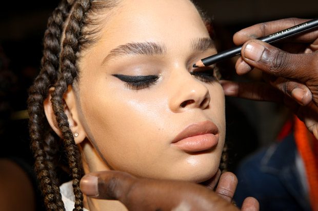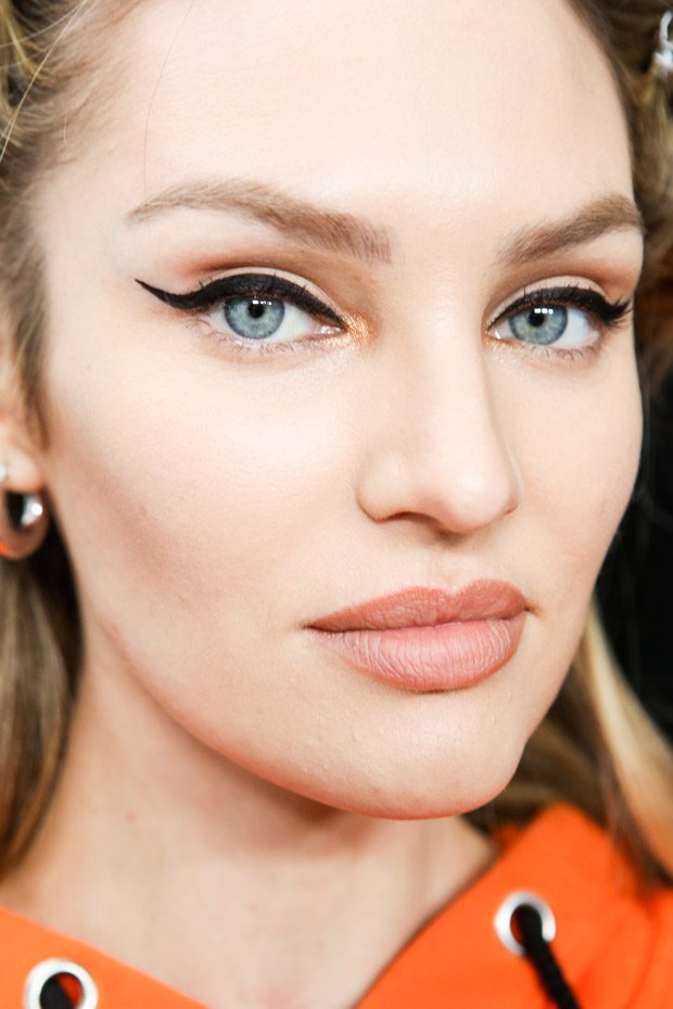 “The beauty look for the show was created by the legendary Pat McGrath using products from the H&M Beauty line. To complement the collection, the make-up look was strong and glamorous, focusing on graphic winged liner for the eyes and luminous skin.“